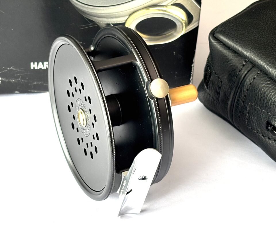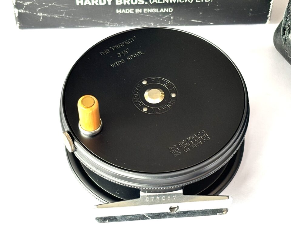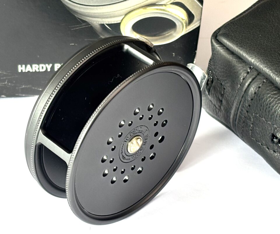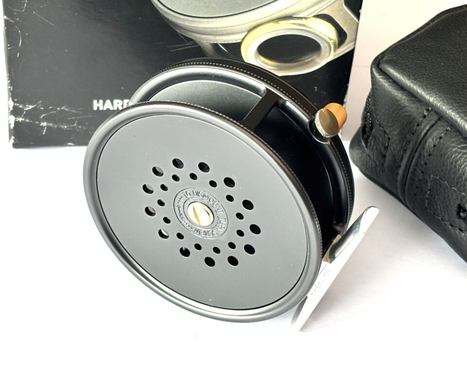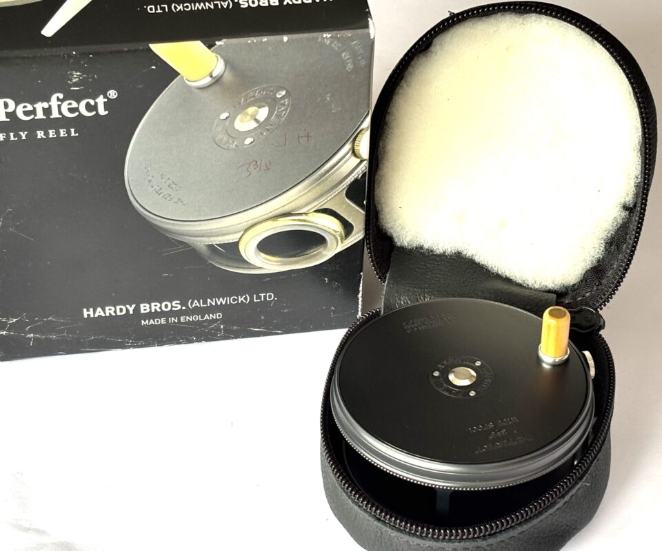 A mint example just arrived — this Hardy Perfect wide spool alloy trout fly reel features a dark grey finish, bamboo-coloured handle, rim tensioner, and smooth alloy foot. A beautifully running reel in unused condition, complete with original sheepskin Hardy reel pouch and outer cardboard box.