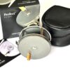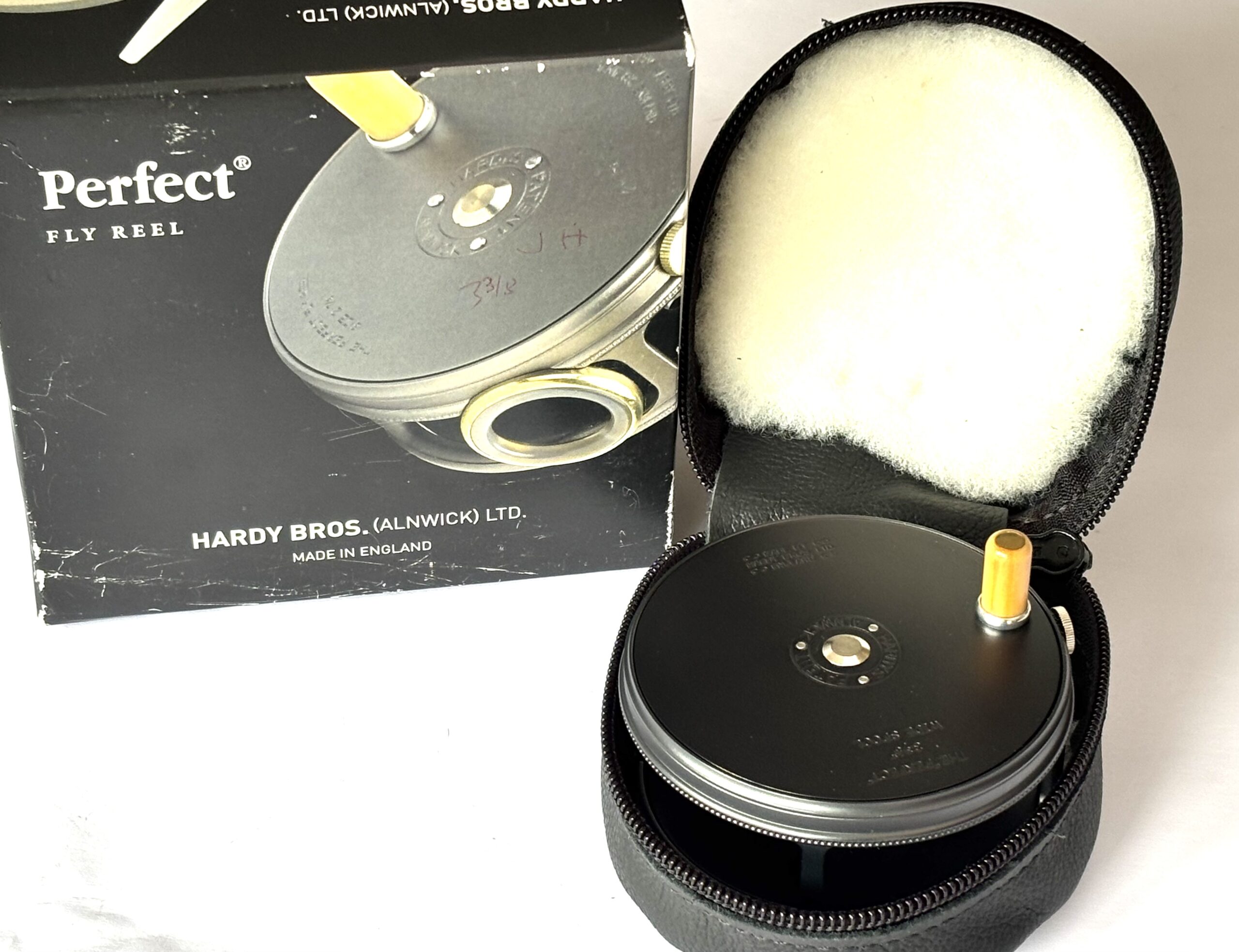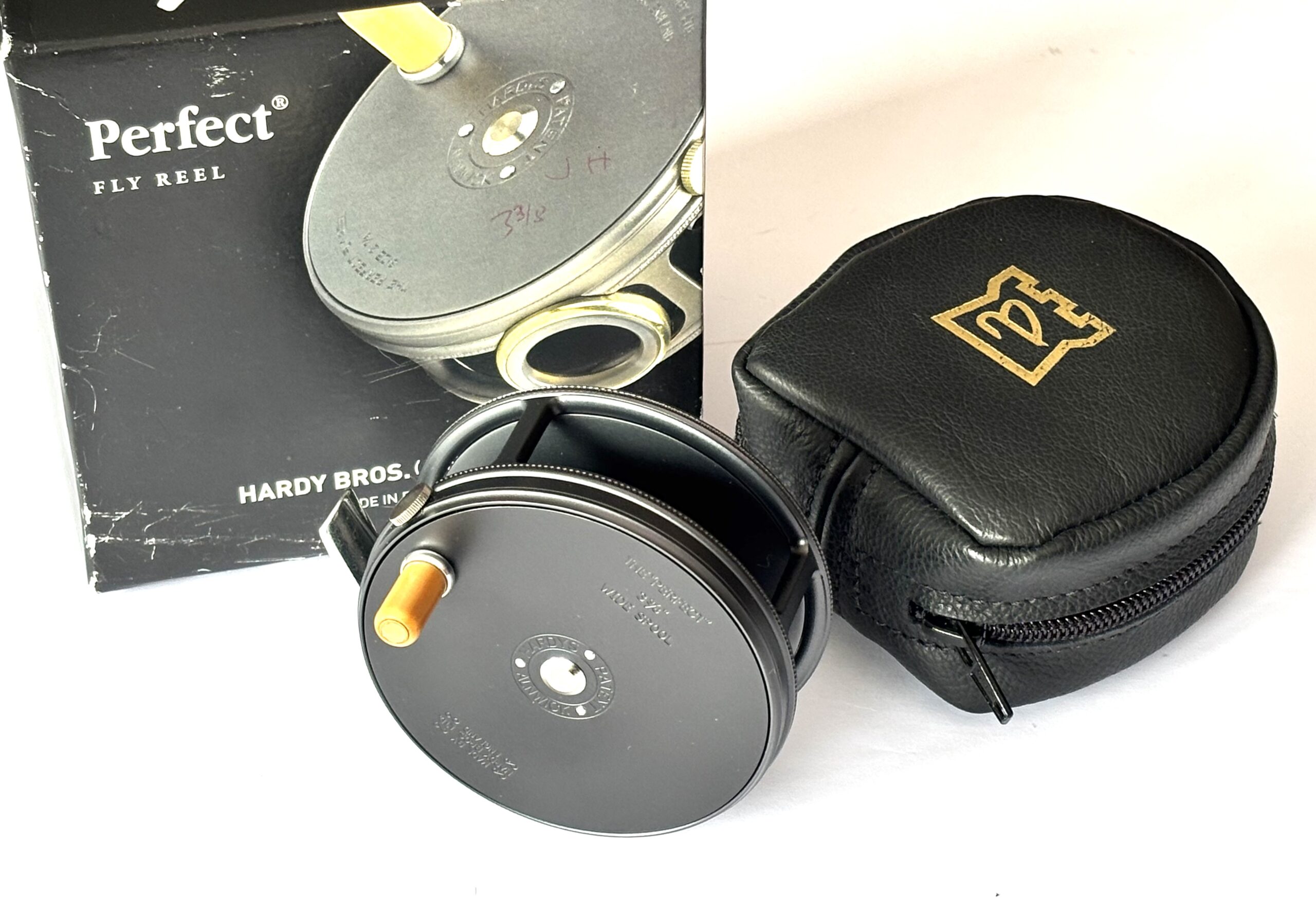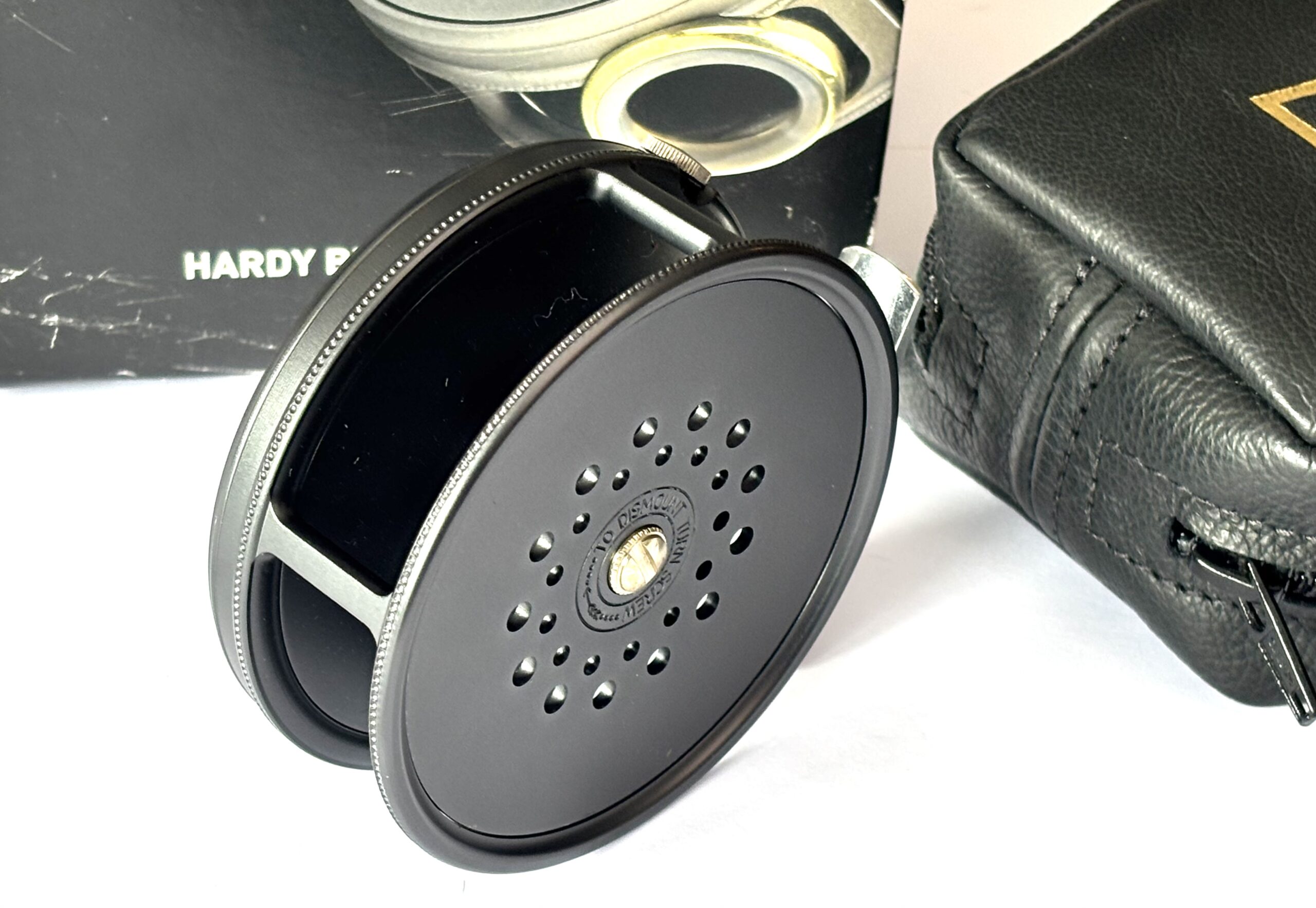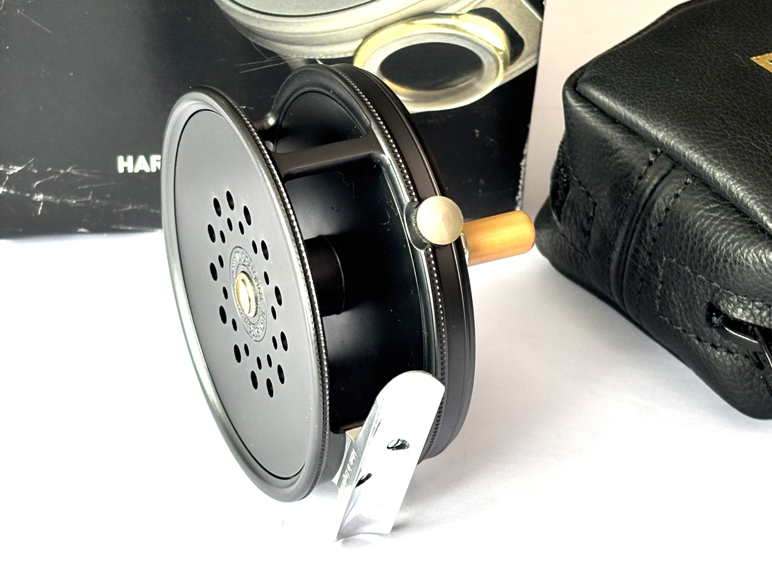 A mint example just arrived — this Hardy Perfect wide spool alloy trout fly reel features a dark grey finish, bamboo-coloured handle, rim tensioner, and smooth alloy foot. A beautifully running reel in unused condition, complete with original sheepskin Hardy reel pouch and outer cardboard box.
