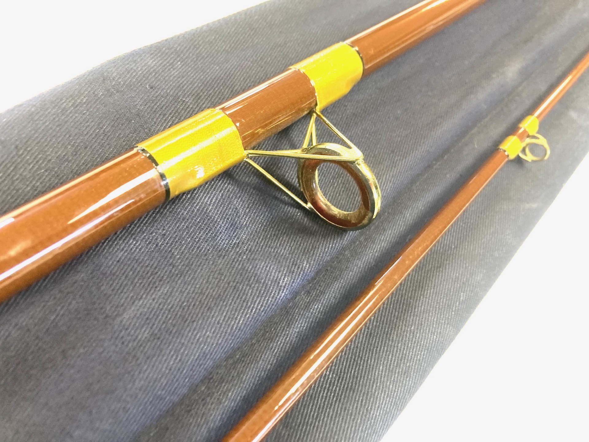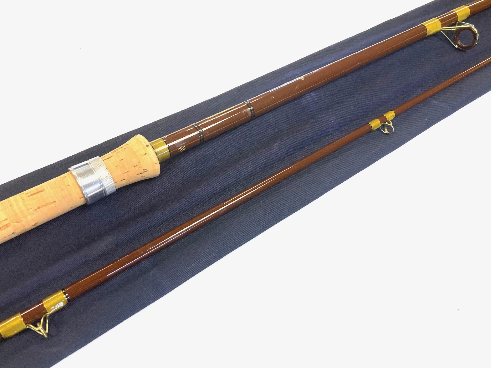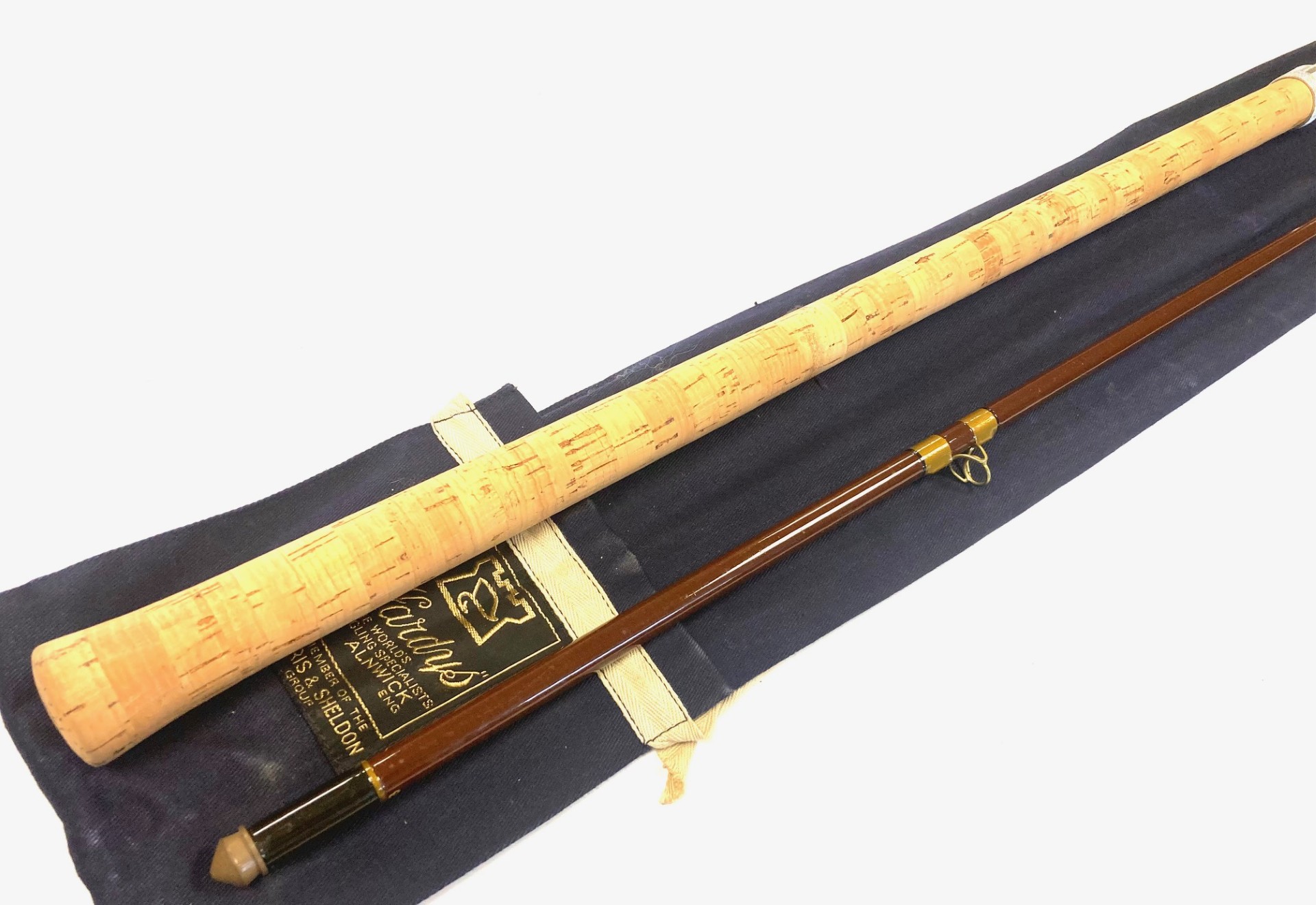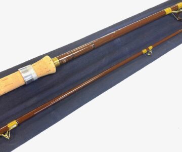 TT opinion: A classic vintage Hardy Richard Walker Carp rod in fine condition. 10′ two-piece brown hollow fibreglass rod. Guides whipped olive tipped grey . Spigot ferrule and 27.5″ cork handle. Sliding alloy reel rings. A fine example, complete with the maker’s correct bag. One to fish or collect!