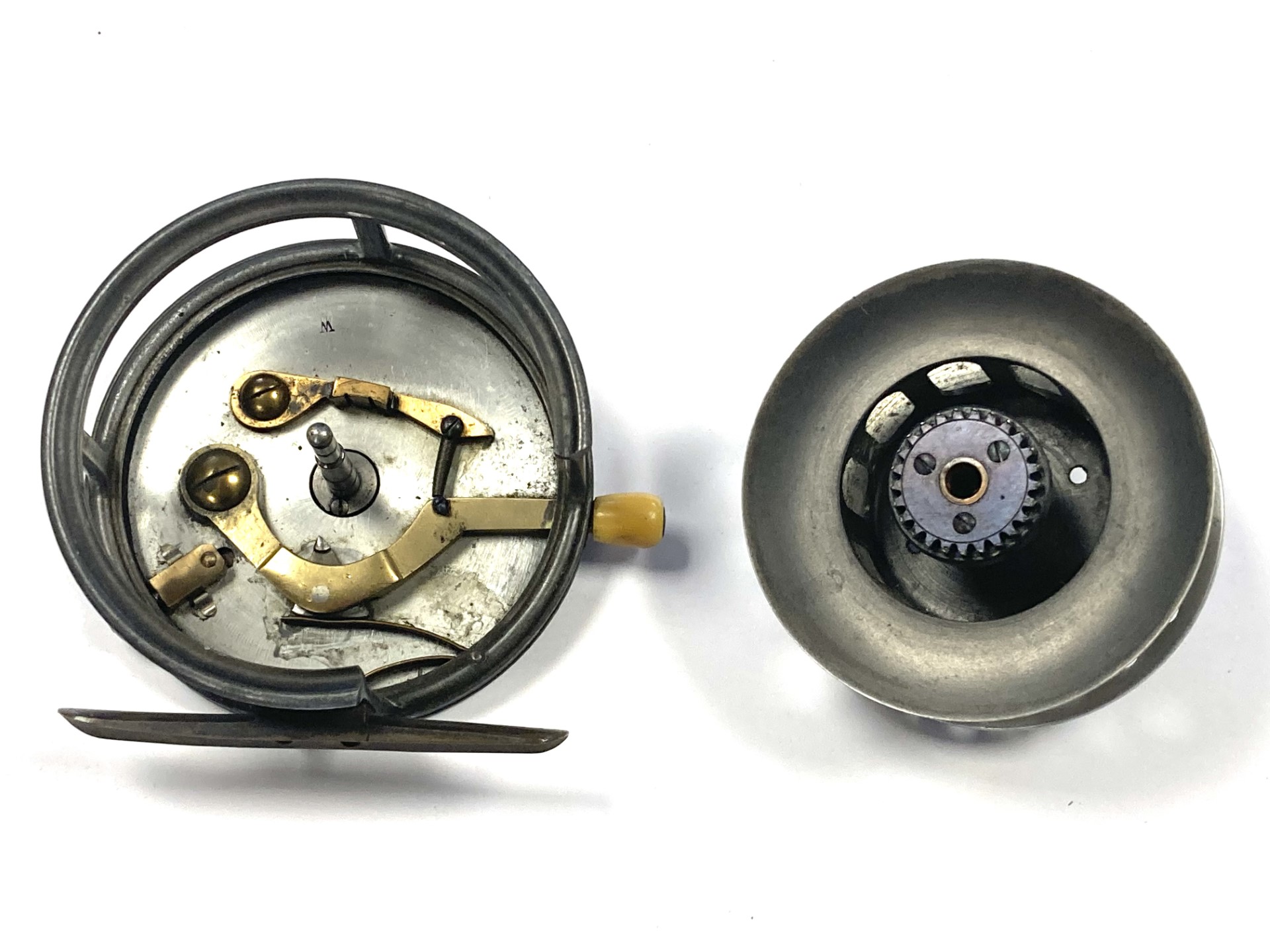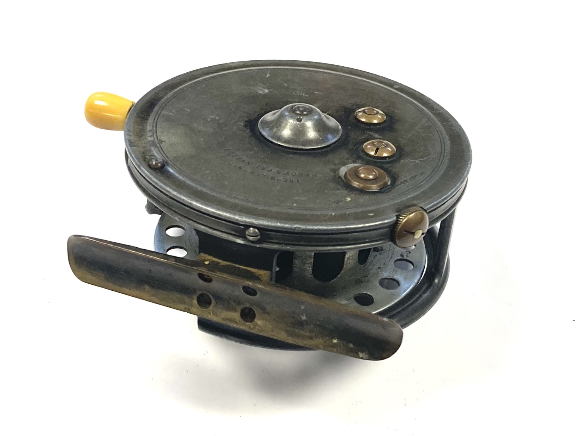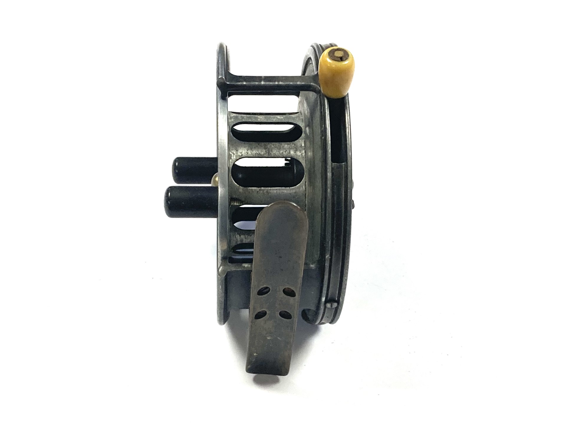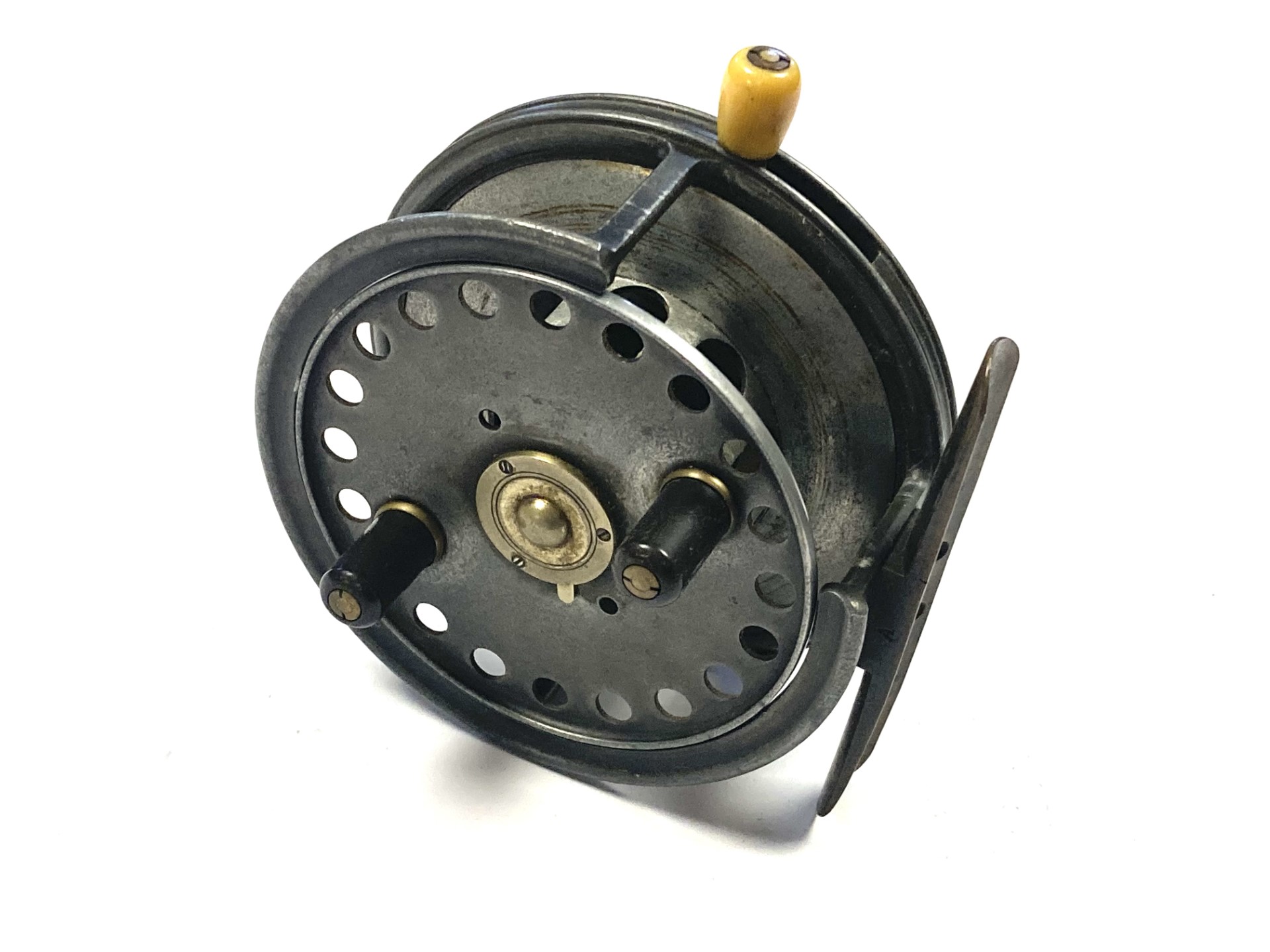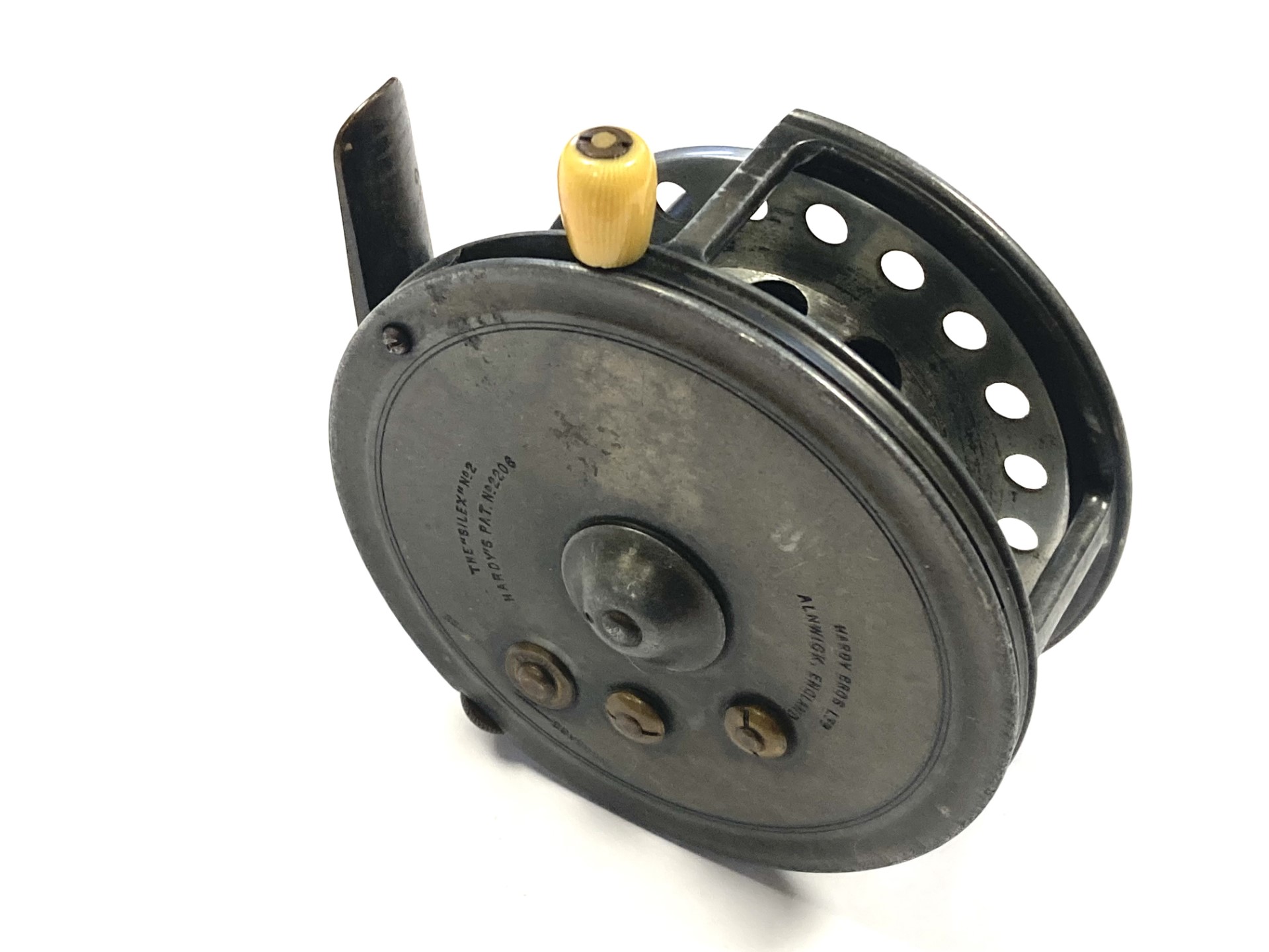 A very good Hardy Silex No 2 with twin ebonite handles, perforated front drum, 93mm straight brass foot, brass circular rim tension regulator, three screw drum latch and white casting brake. As you can see from the condition the reel is one to use or one for the collection.