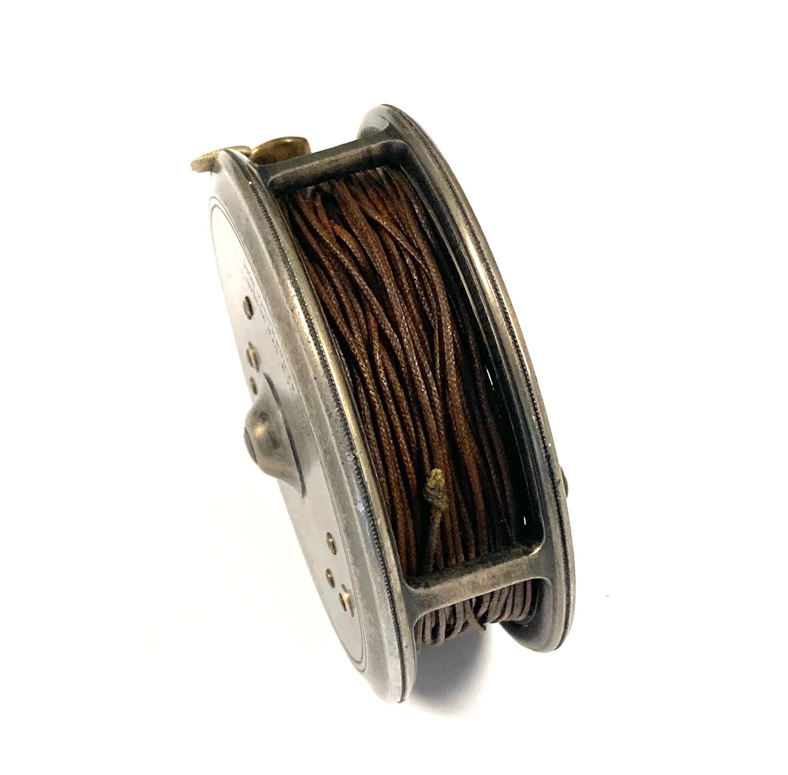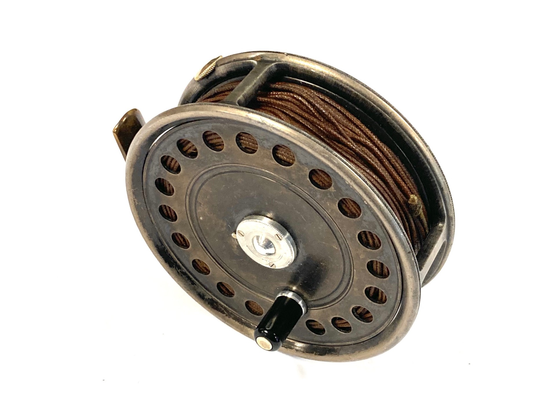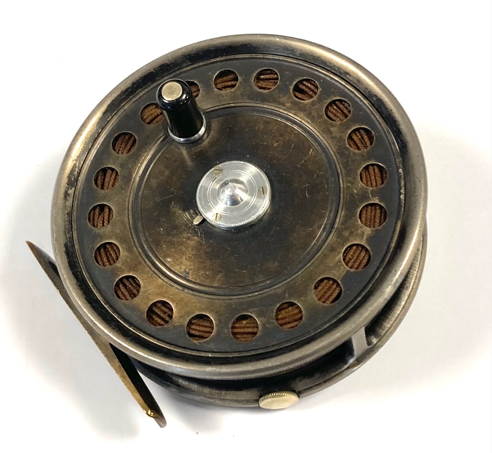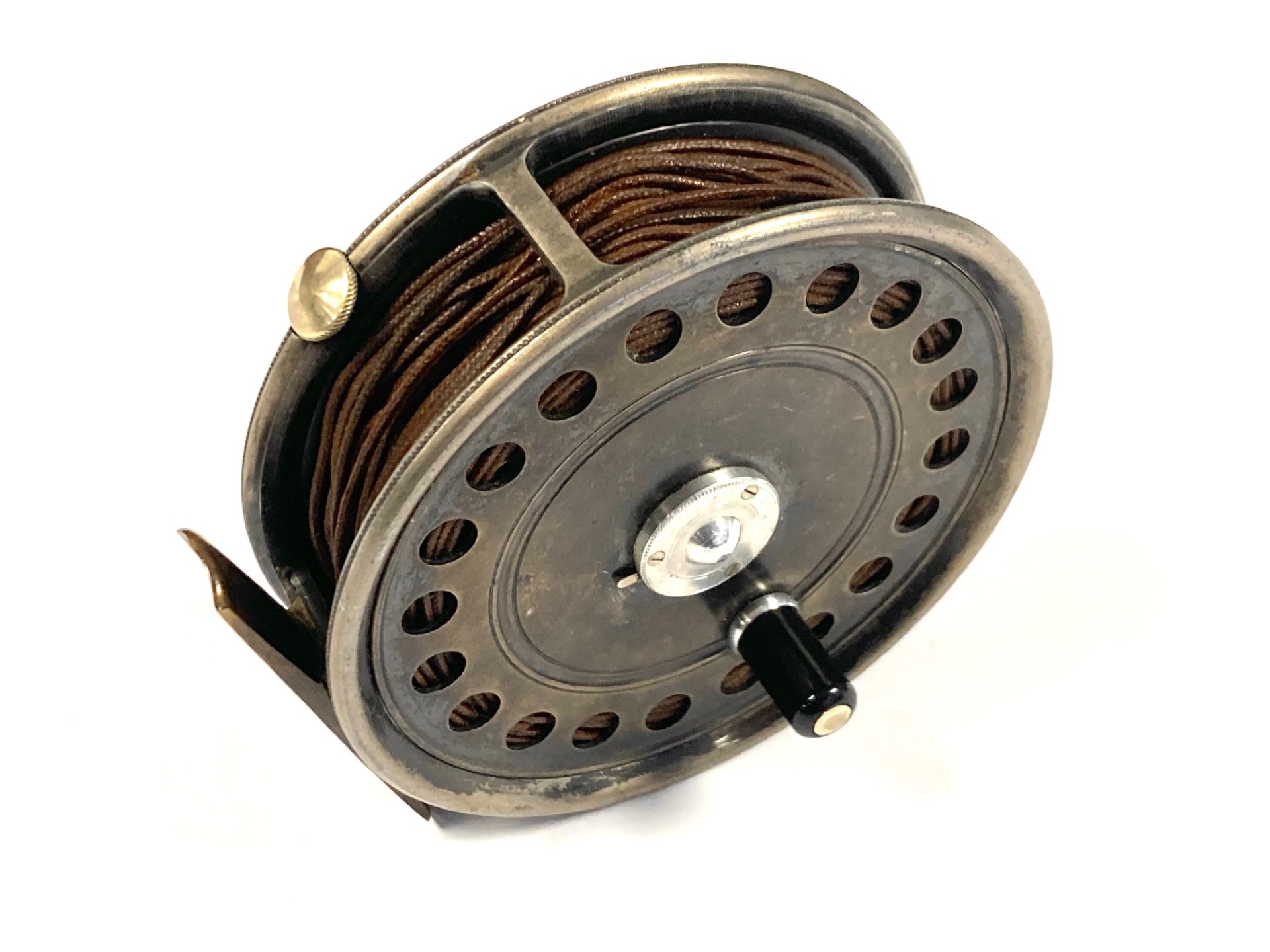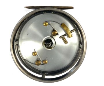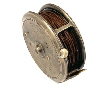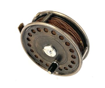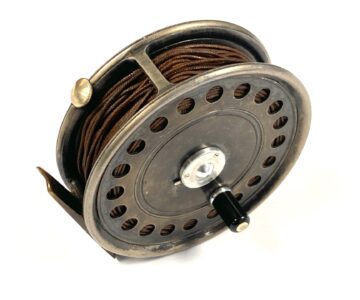 TT opinion: Another great Hardy St John reel just in with fine original dark finish. Rare three screw latch. Reel has black handle, one row of perforations to face plate and smooth alloy foot. No drum rock, a great user of one to collect. Original silk line. One to fish or collect.
