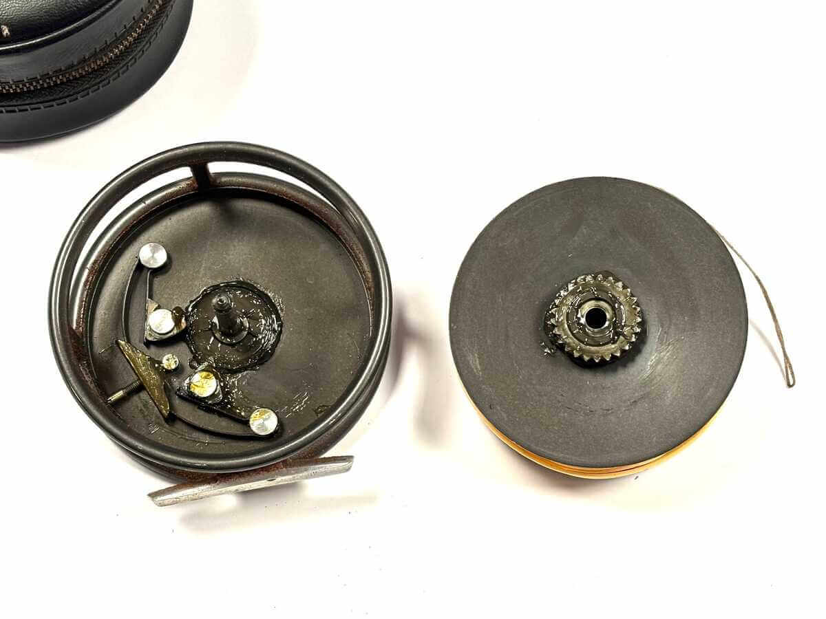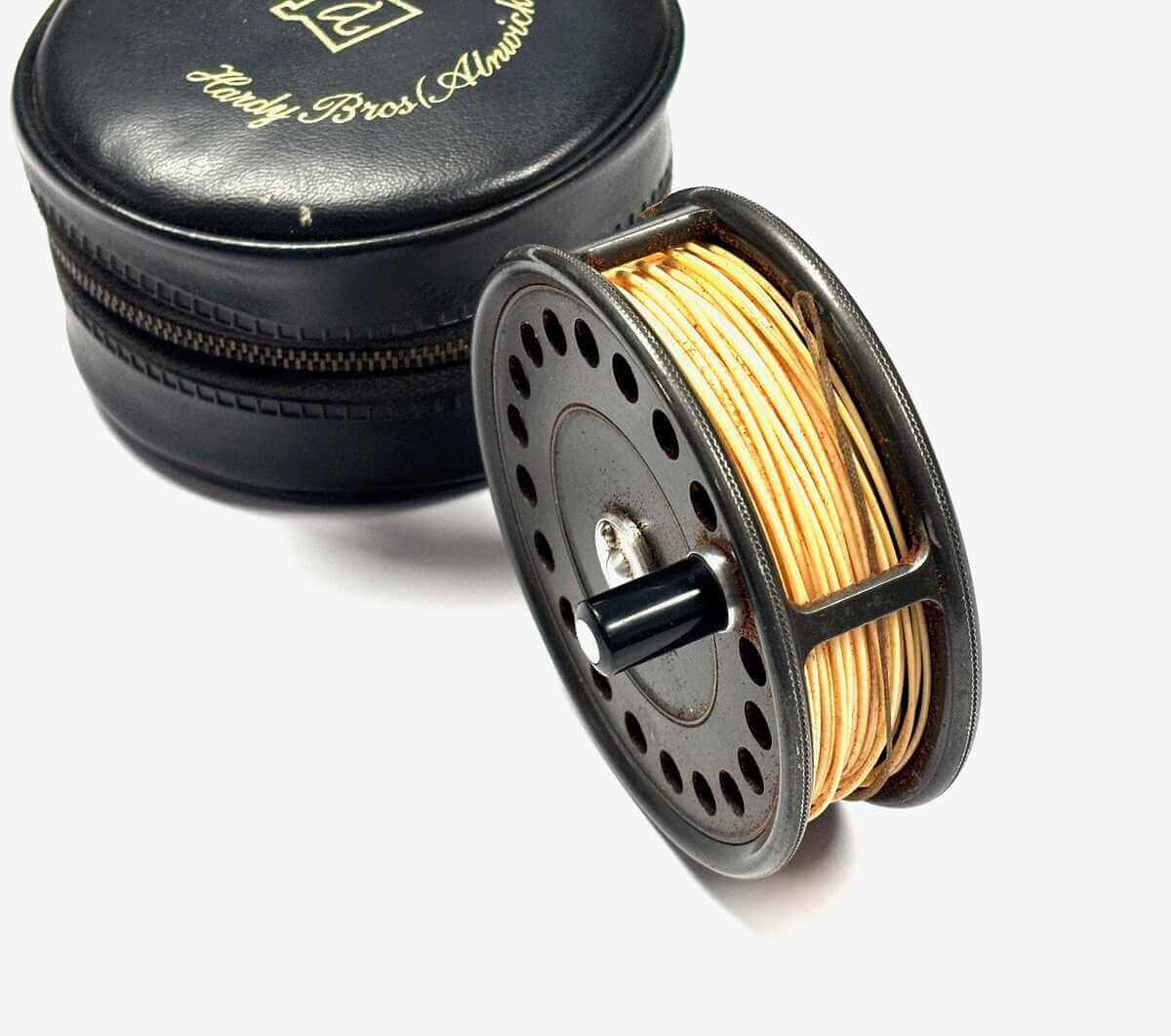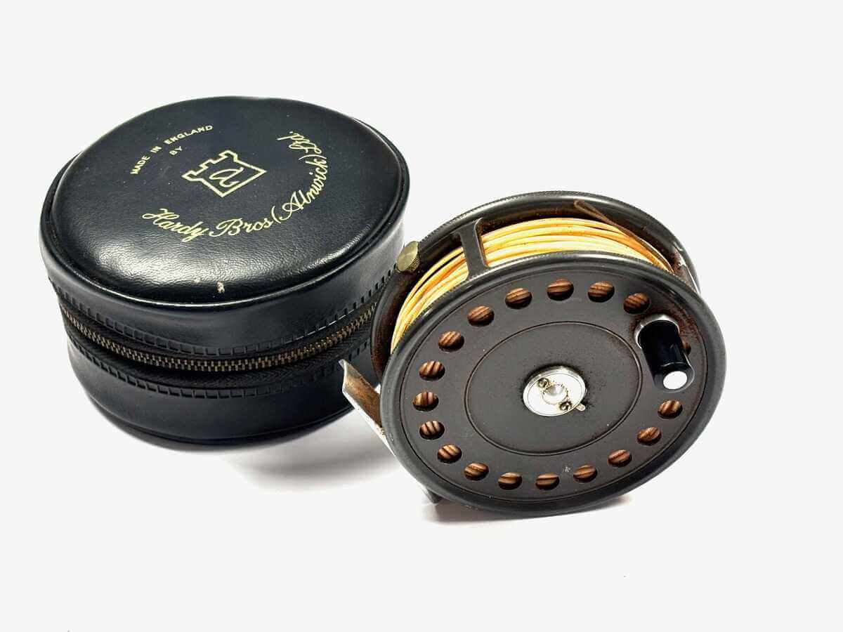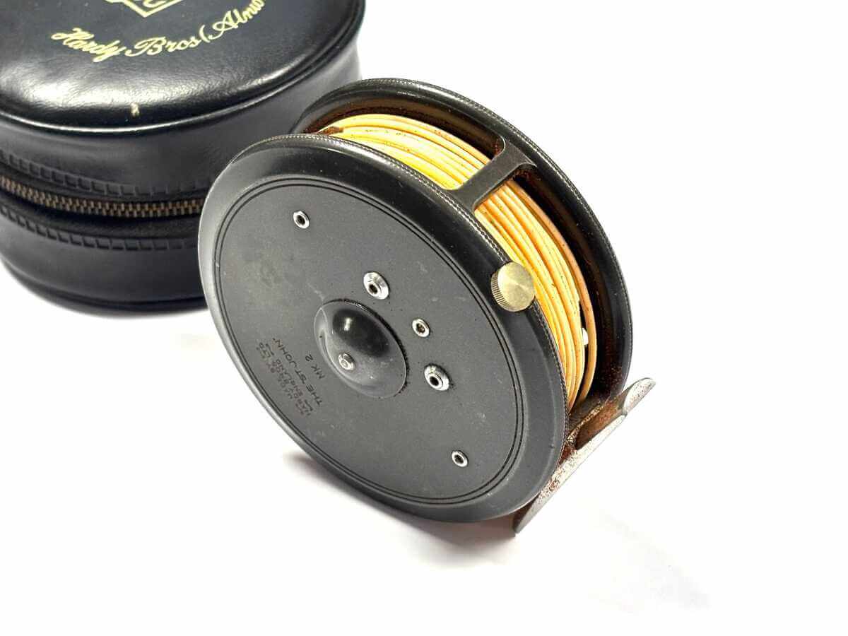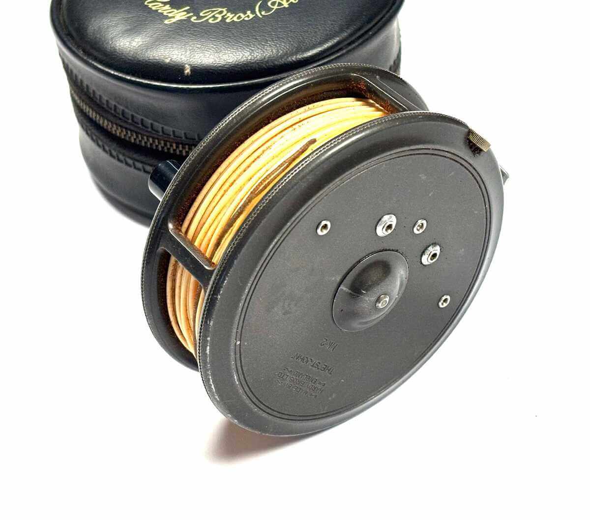 TT opinion: Another excellent Hardy St John in the large 4″ diameter with two screw drum release latch, perforated drum, side rim tensioner and smooth alloy foot. A good tight reel in its case and ready to fish!
