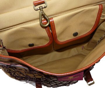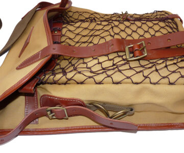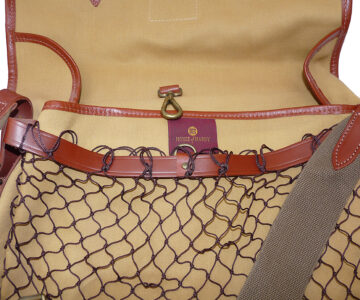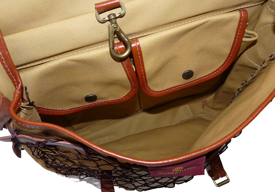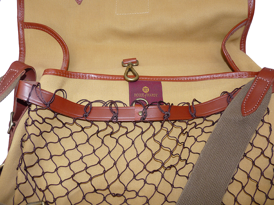 TT opinion: Hardy “The Aln” canvas/leather traditional game fishers’ bag in as new condition. Part of the 101 Hardy rod and reel collection from Belfast. 14” x11”, front mesh game pocket brass snap clip to inside, 2 inner pockets & 2” adjustable webbing shoulder strap. Brass landing net ring to side superb quality English made bag dating c 1998-2000 period