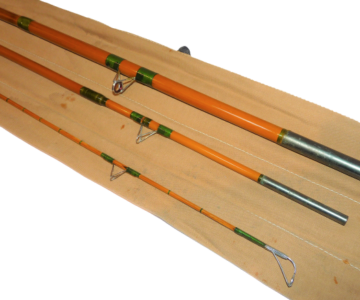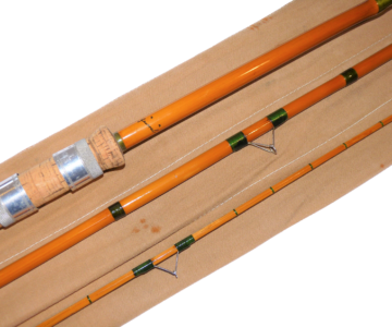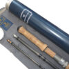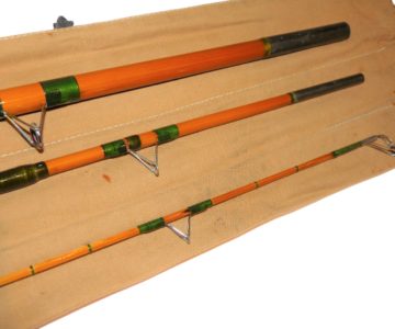 A lovely three piece rarely seen Hardy ‘The General’ rod, whole cane with split cane tip, lovely green whippings with red agate first eye. Long clean cork handle with alloy reel fittings. Lovely action float rod. Numbered G32573 – 1955. In unnamed beige cloth rod bag.