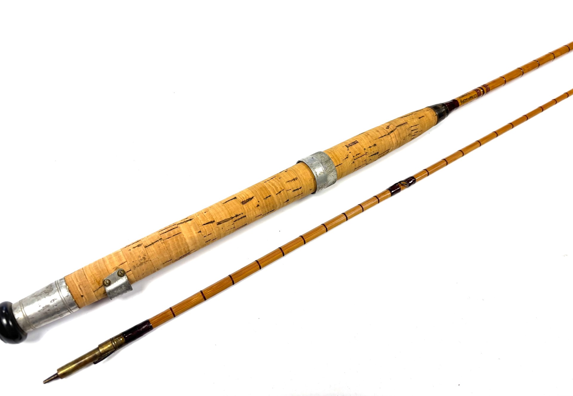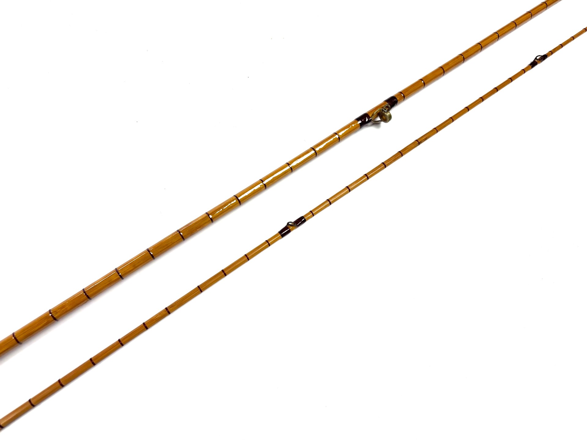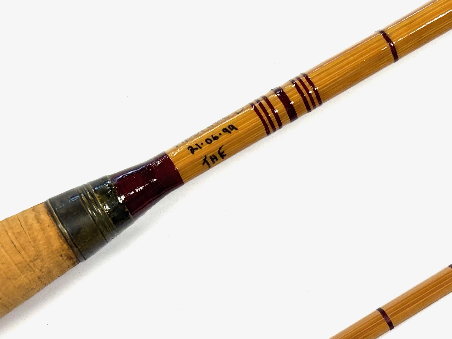 Hardy the Halford 9’6” two piece Palakona cane trout fly rod. This rod was fully refurbished by Hardys on 21/06/199. Close whipped all through, low bridge intermediates, plated stud lock ferrule. 12” cork handle, wood spacer and screw reel fittings. The rod is straight, ferrule fits well. It will be a joy to cast with #6/7 line on a river or lake. Comes with worn Hardy beige rod bag.