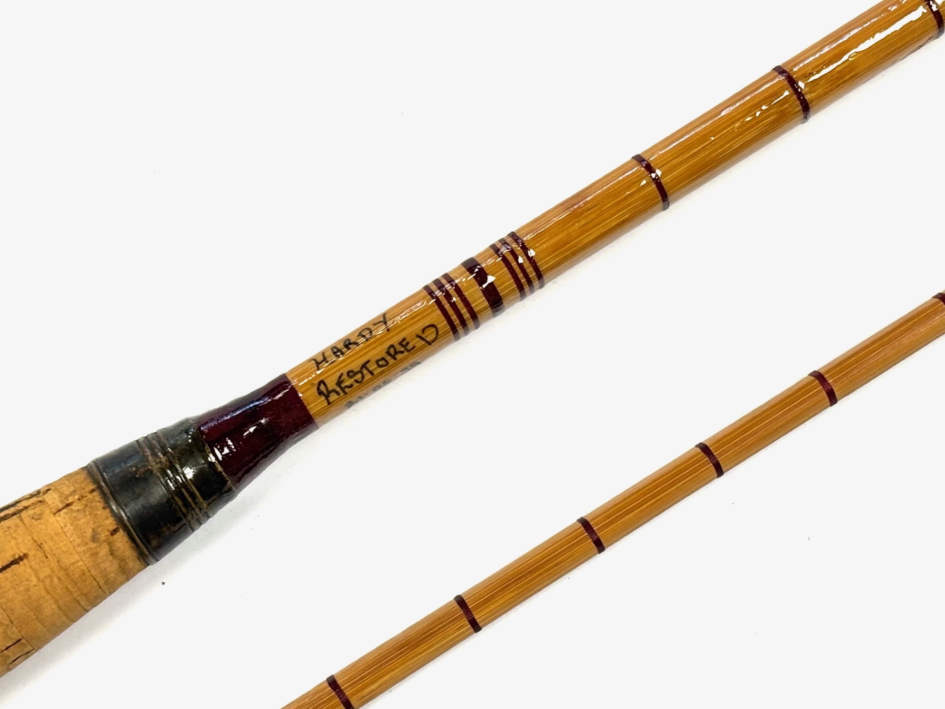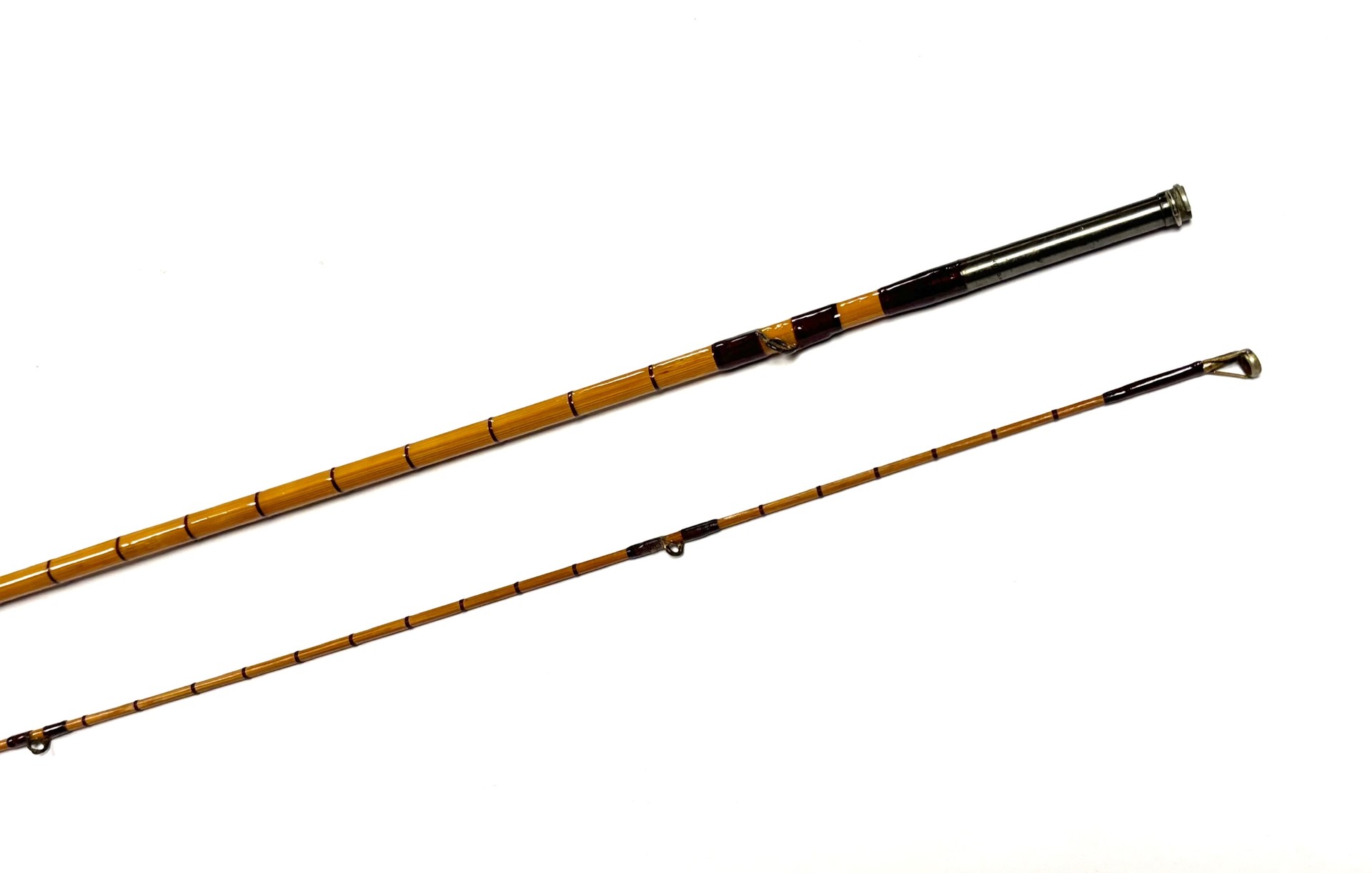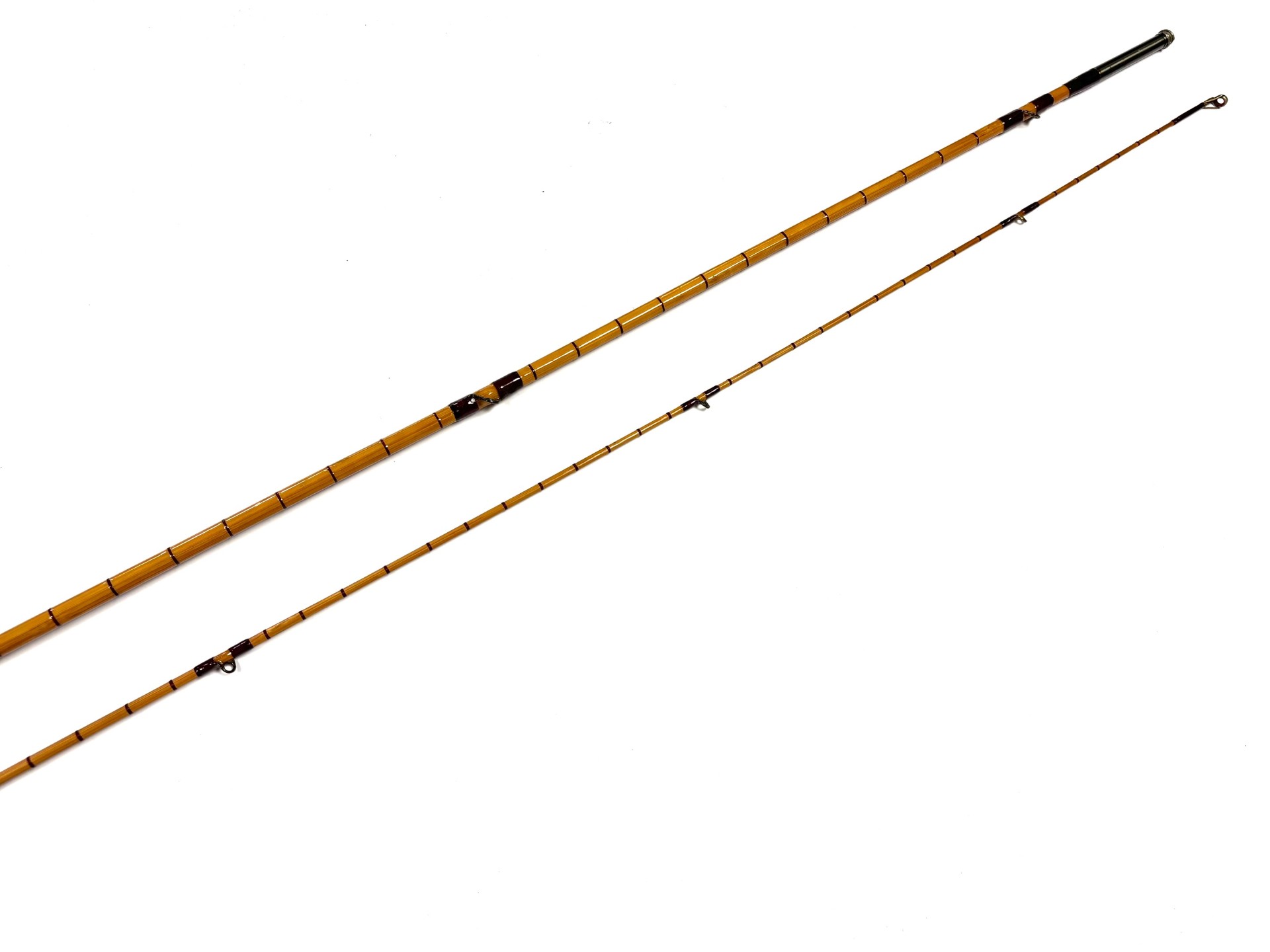 Hardy the Halford 9’6” two piece Palakona cane trout fly rod. This rod was fully refurbished by Hardys on 21/06/199. Close whipped all through, low bridge intermediates, plated stud lock ferrule. 12” cork handle, wood spacer and screw reel fittings. The rod is straight, ferrule fits well. It will be a joy to cast with #6/7 line on a river or lake. Comes with worn Hardy beige rod bag.
