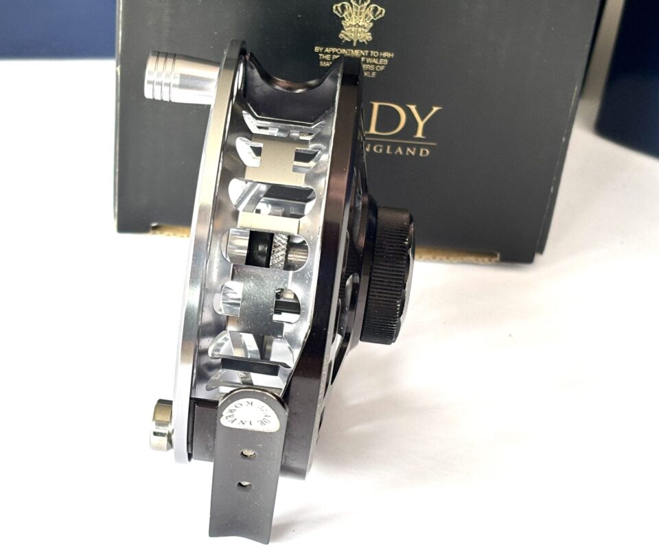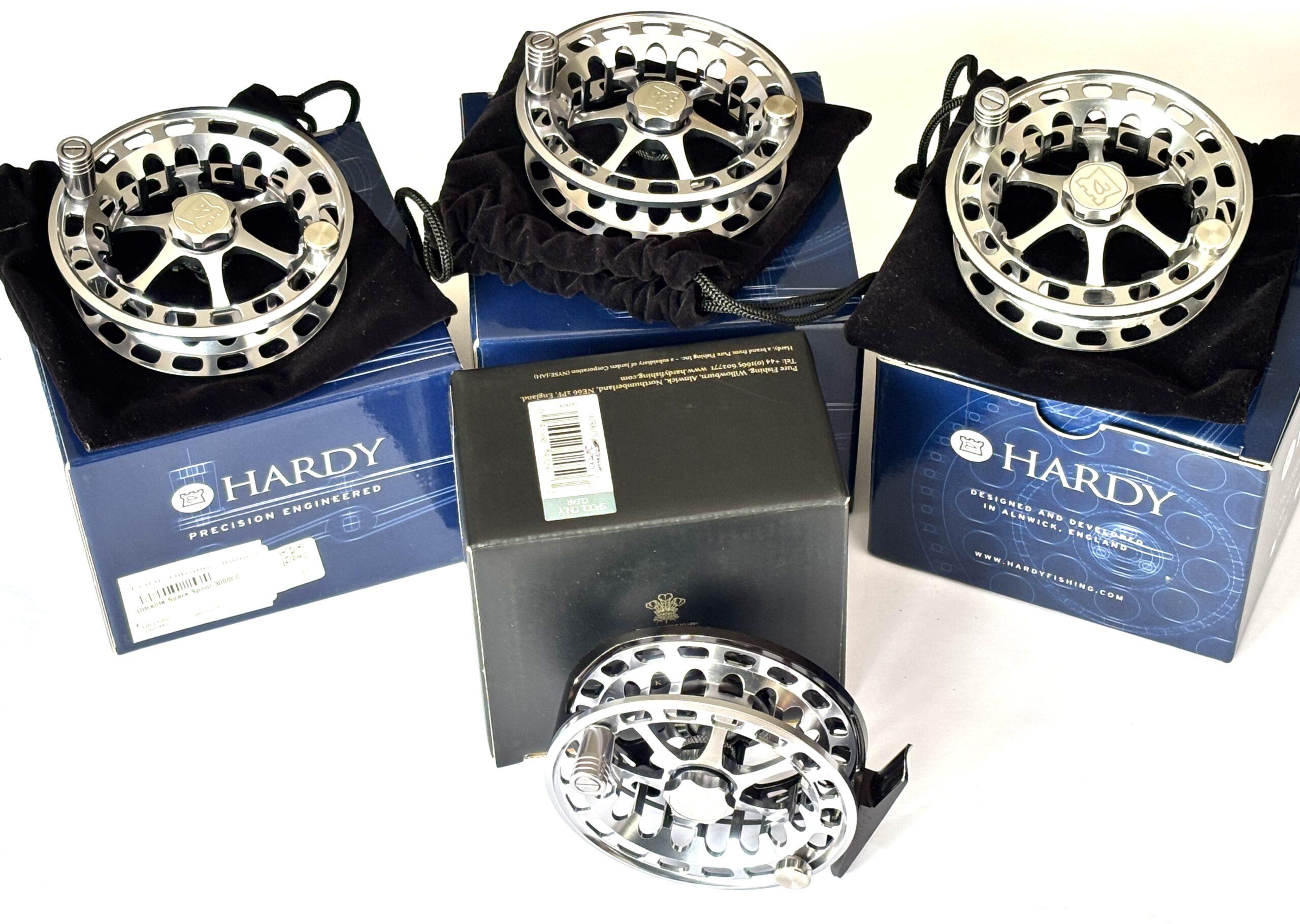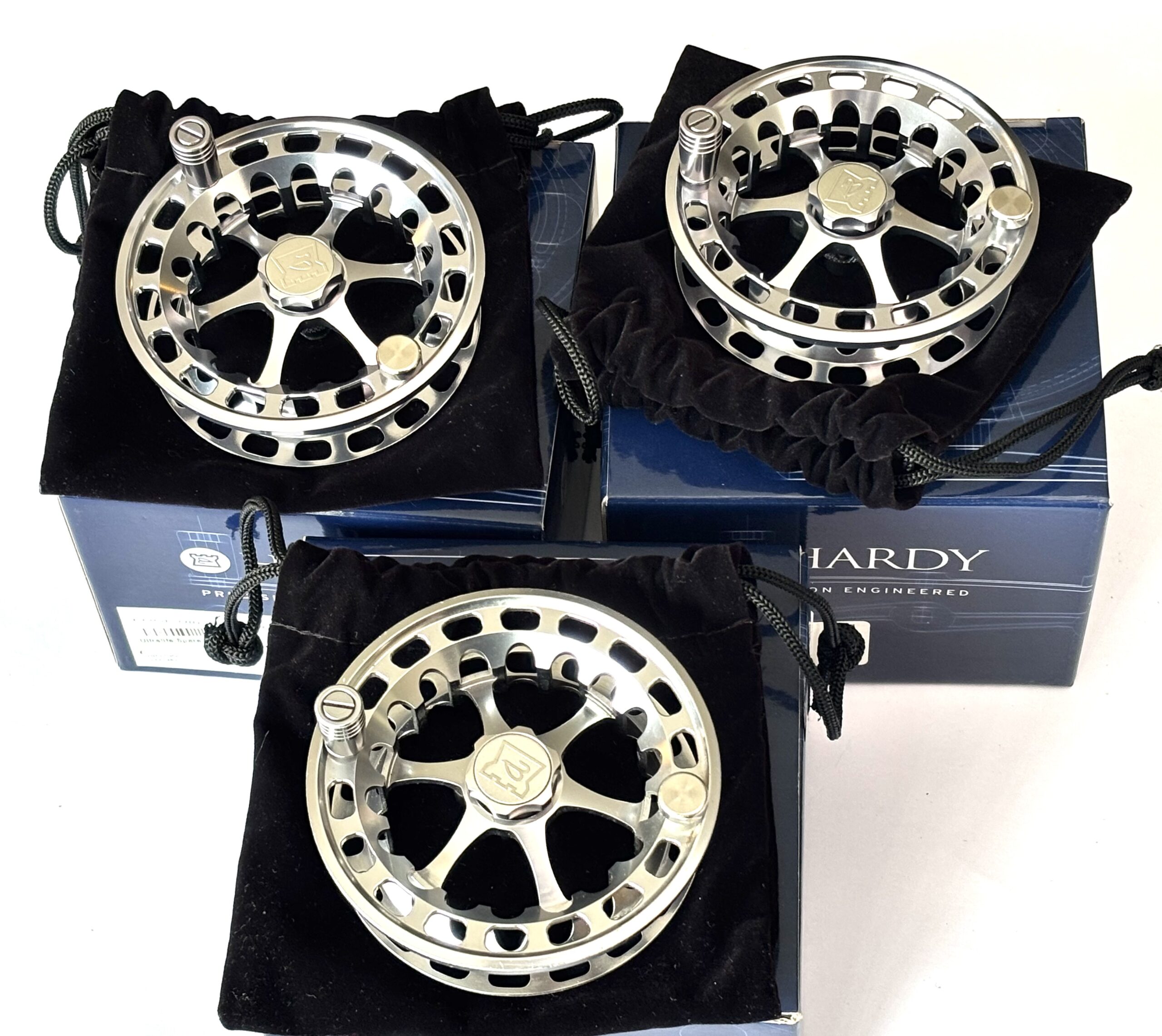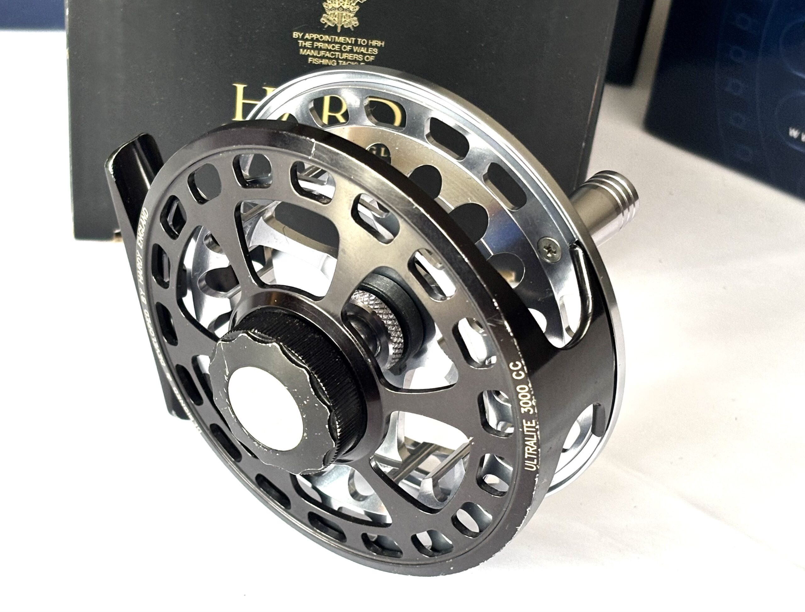 A fine example of the Hardy Ultralite 3000 CC trout fly reel made of lightweight aluminium, single-handed with silver counterbalance and black circular rear disc drag. As you can see, the reel comes with three spare spools, all in their original boxes.