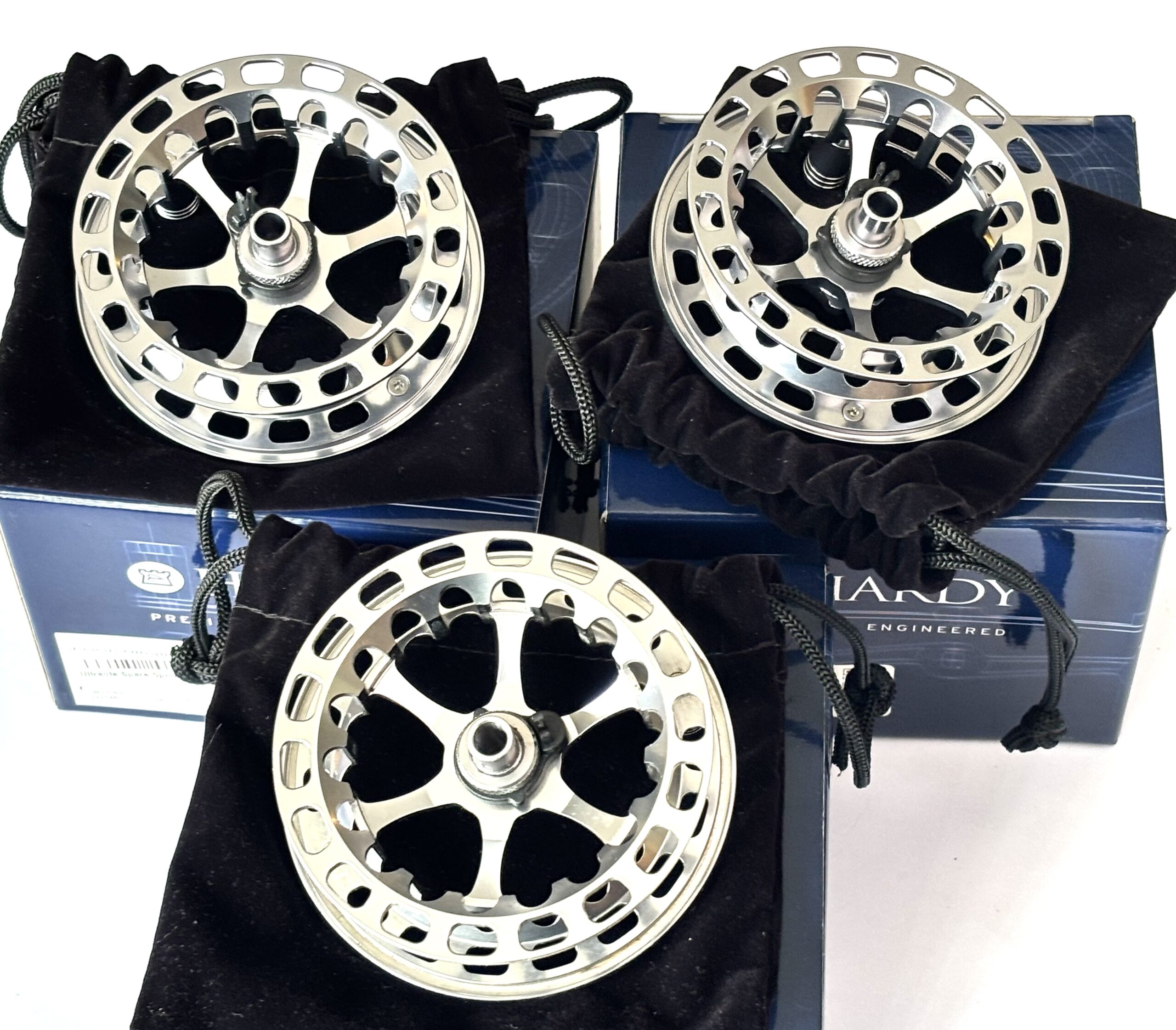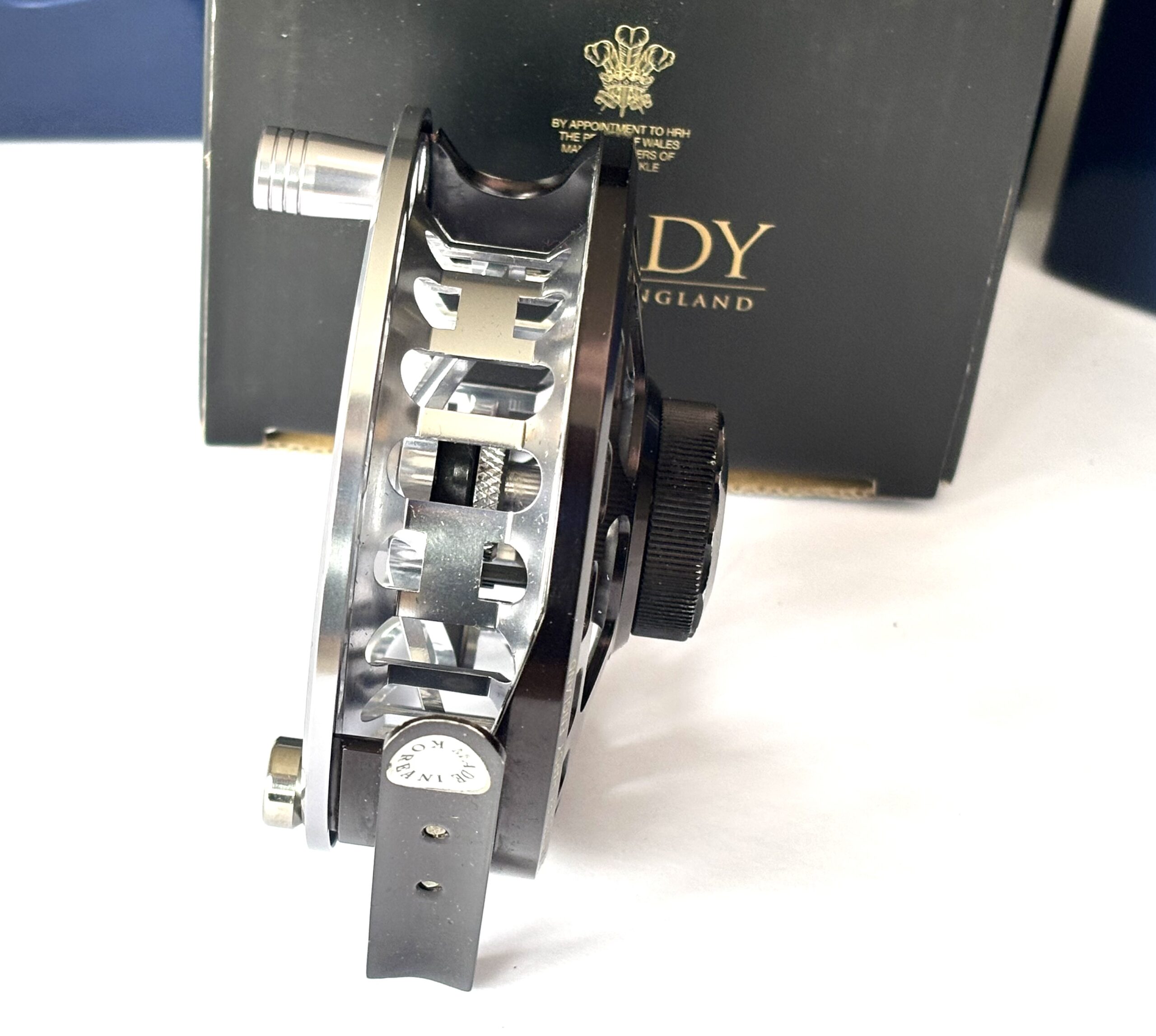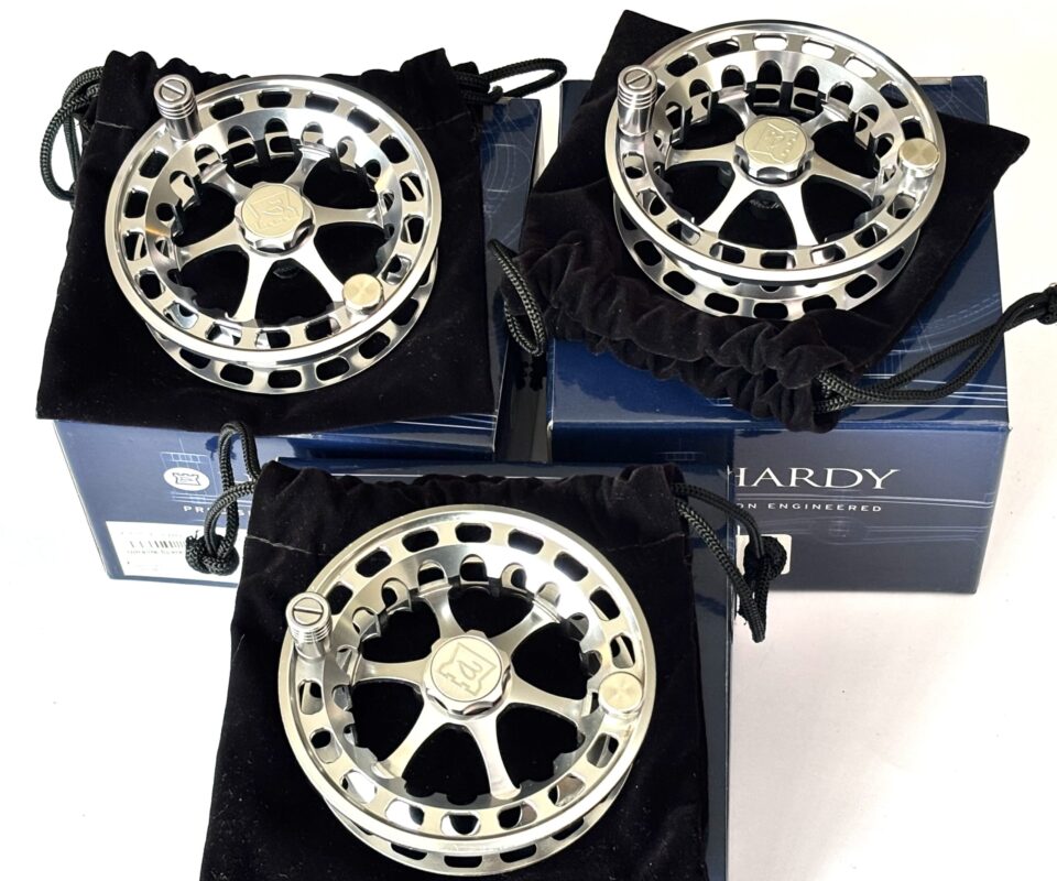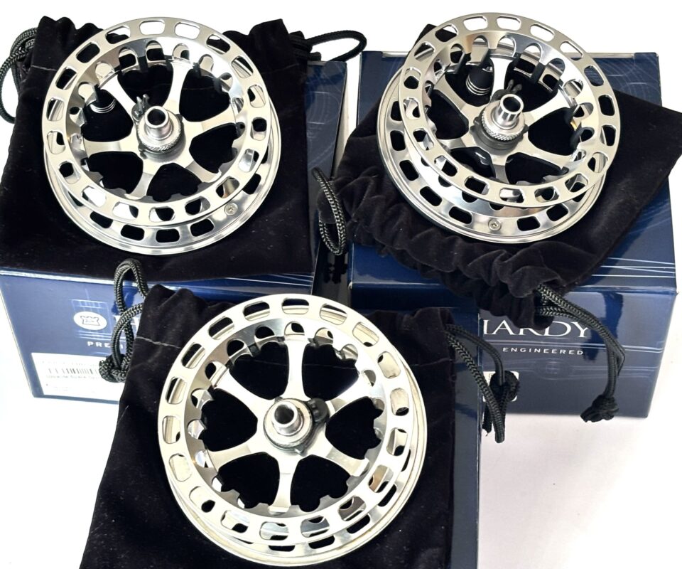 A fine example of the Hardy Ultralite 3000 CC trout fly reel made of lightweight aluminium, single-handed with silver counterbalance and black circular rear disc drag. As you can see, the reel comes with three spare spools, all in their original boxes.
