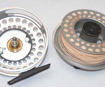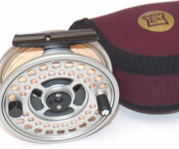 Notes: A fine Hardy Ultralite Disc LA 7/8 fly reel in silver finish.Large arbor model, 3-5/8″ diameter, counterbalanced handle, and quick release spool. The reel can be fished right or left hand wind, low noise check clicker and backplate drag adjuster. Super condition reel, 100% correct and comes fitted with a floating line and backing in makers neoprene case.