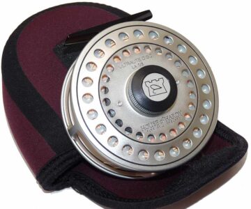 Notes: A fine Hardy Ultralite Disc LA 7/8 fly reel in silver finish.Large arbor model, 3-5/8″ diameter, counterbalanced handle, and quick release spool. The reel can be fished right or left hand wind, low noise check clicker and backplate drag adjuster. Super condition reel, 100% correct and comes fitted with a floating line and backing in makers neoprene case.
