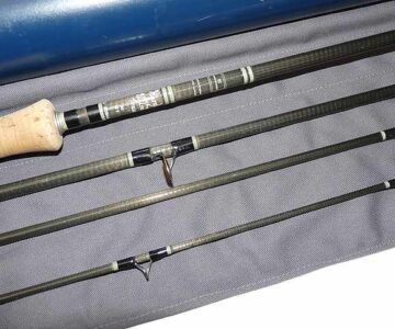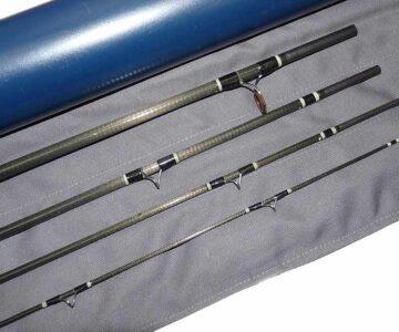 TT opinion: A Hardy Ultralite travel 10′ 4-piece graphite fly rod in superb original condition. A rare rod to find in this spiral graphite finish, guides whipped black tipped blue with lined butt & stripper rings, keeper ring. 11″ cork handle including fighting butt & up screw reel fitting, #7, a light crisp action rod, great value for money for this quality. Comes in makers original bag & screw top tube.