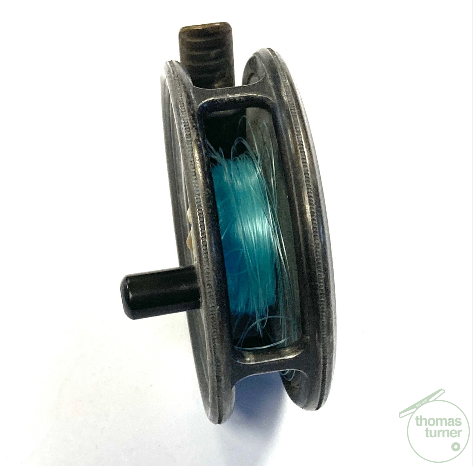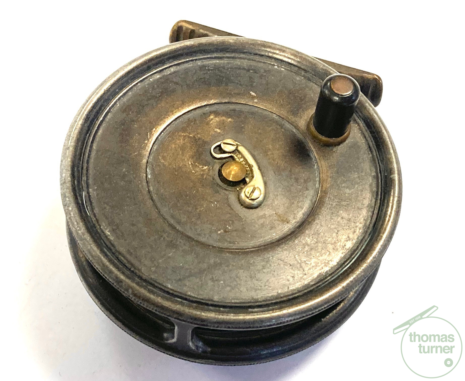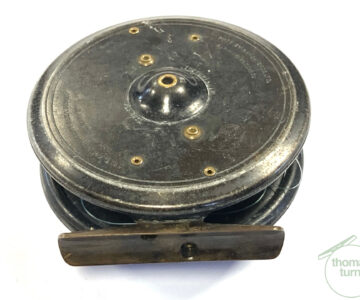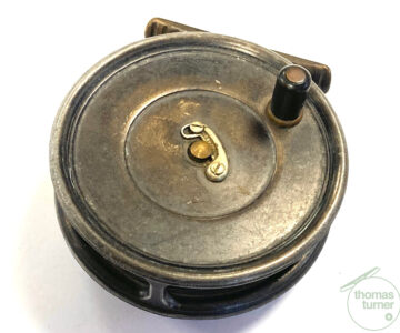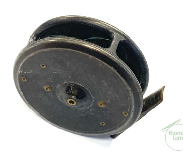 TT opinion: Another classic little Hardy trout fly reel with black handle and telephone drum release latch, mark II check mechanism and straight brass ribbed foot. A good tight reel with no drum rock of play.