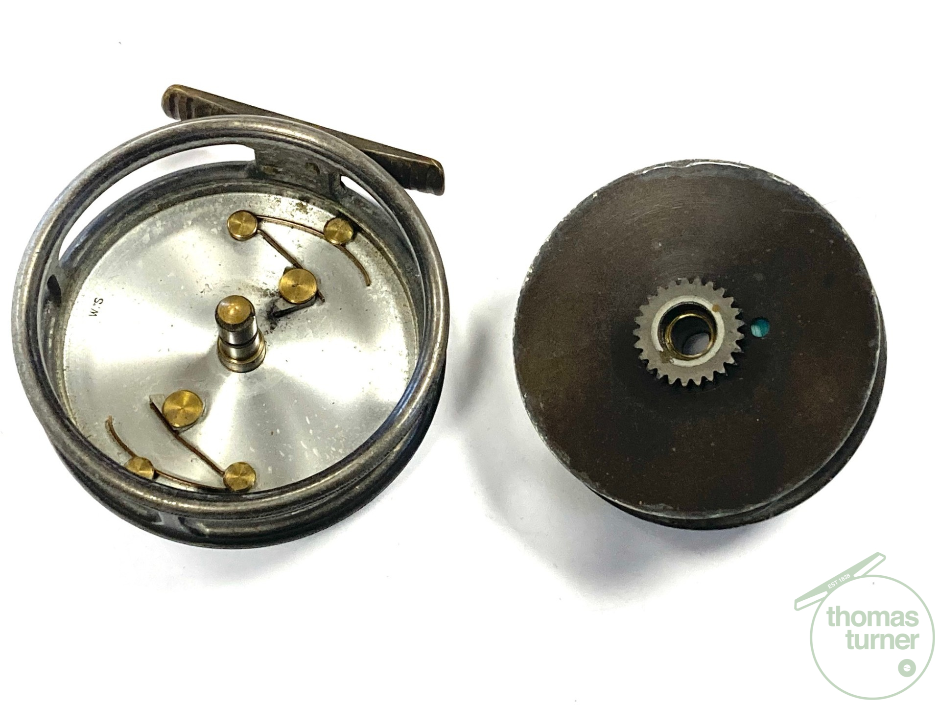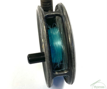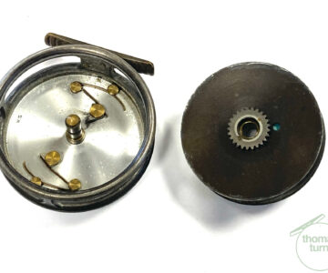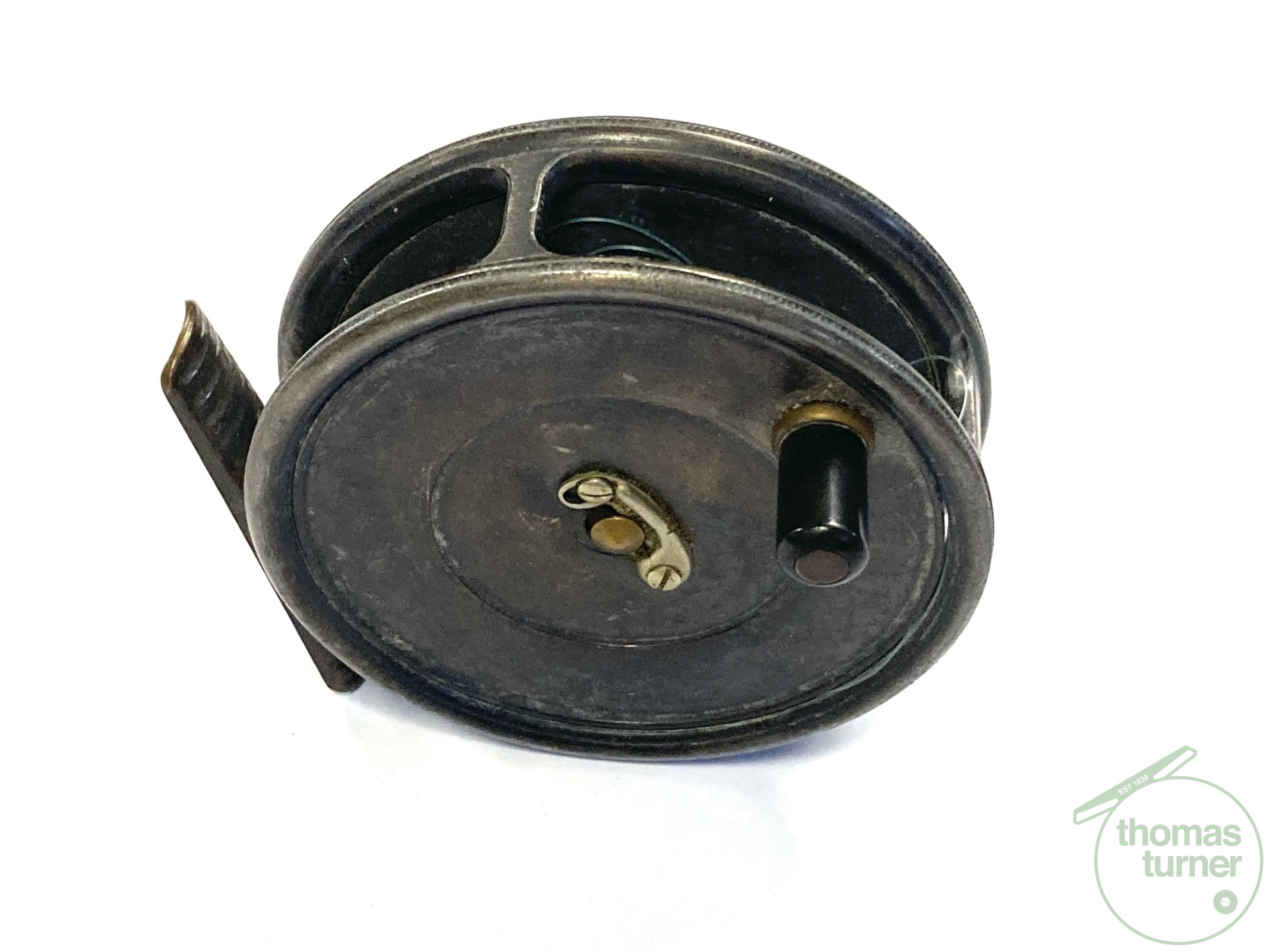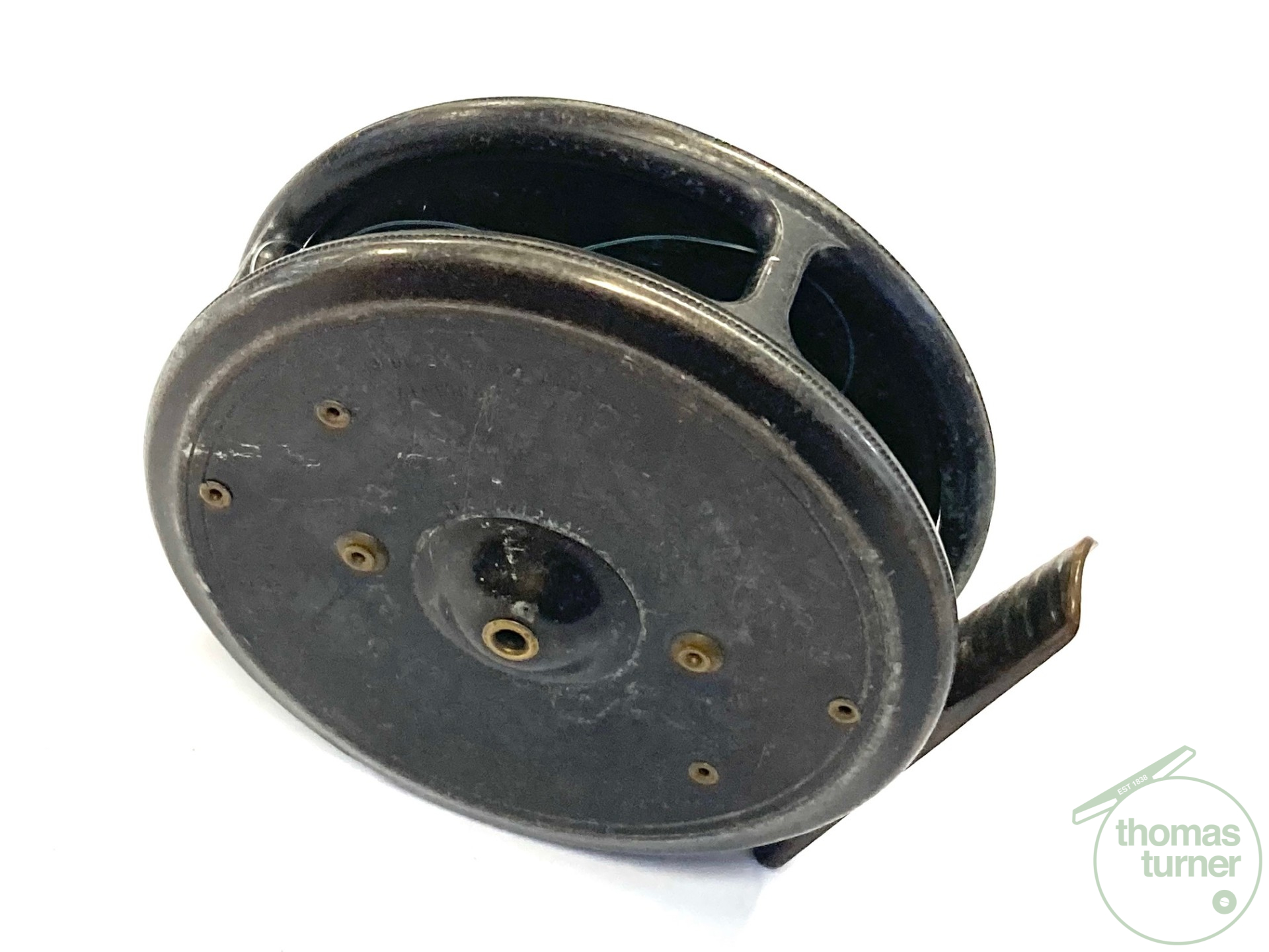 TT opinion: Another classic little Hardy trout fly reel with black handle and telephone drum release latch, mark II check mechanism and straight brass ribbed foot. A good tight reel with no drum rock of play.
