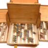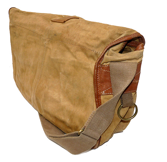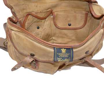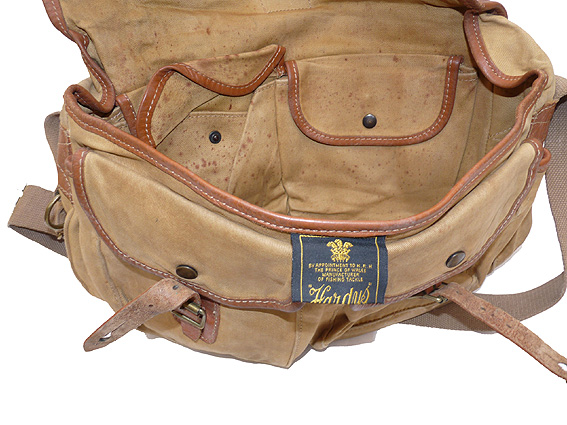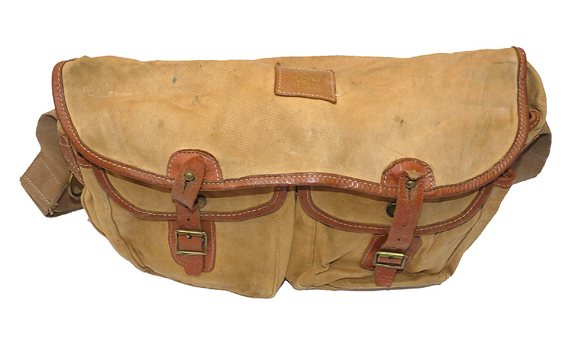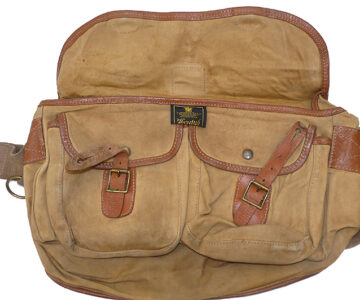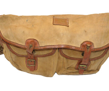 TT opinion: A classic vintage canvas bag by Hardy Bros Alnwick, England. Fitted with 2 external and 2 internal pockets. Leather straps and brass buckles .Broad adjustable shoulder strap and brass landing net ring to one side. A few general use marks. I’m told the spots inside can be removed with a stiff brush and cold water scrub. Suited to fishing and general or travel use.