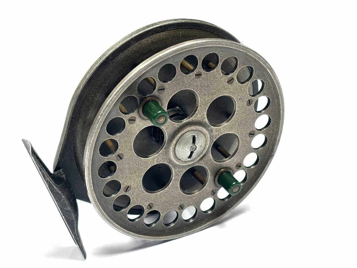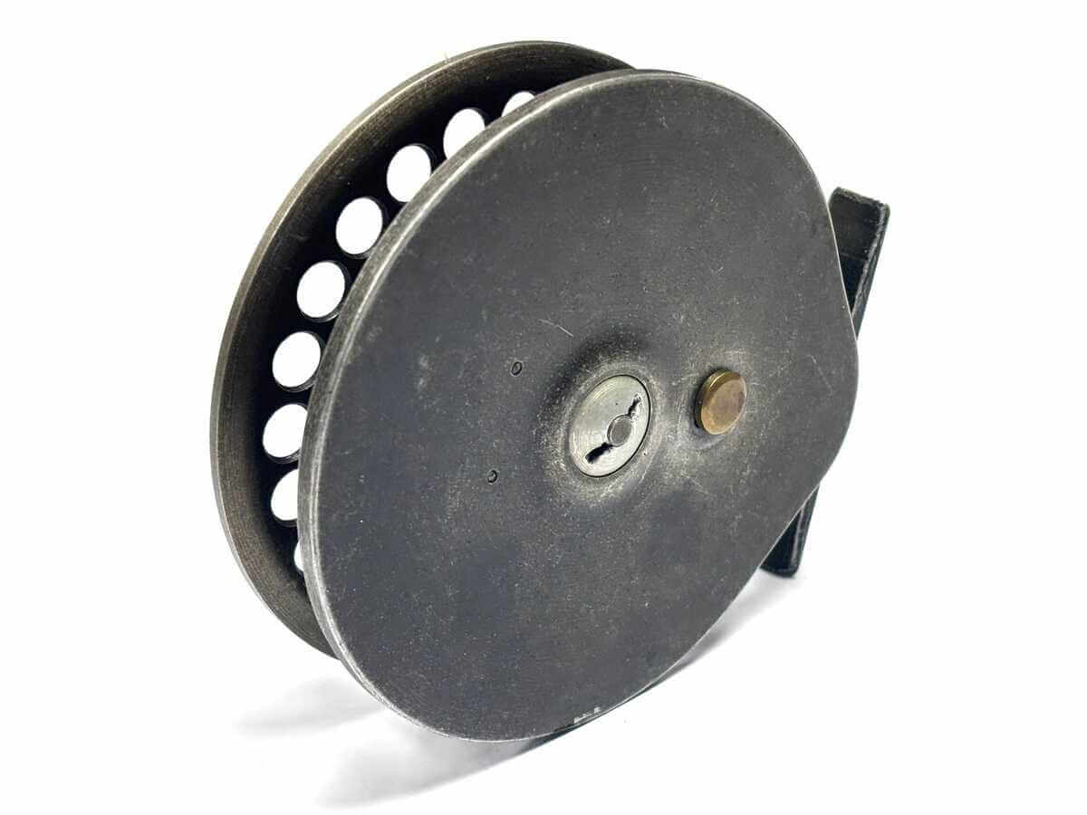 Just in as part of a 70 centrepin collection this first model Harry Reynolds centrepin reel with tarnished alloy finish, original dark res small handles, on/off check. 82mm straight alloy foot. Spins very well.