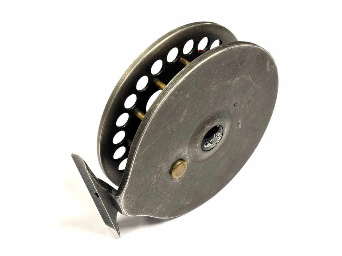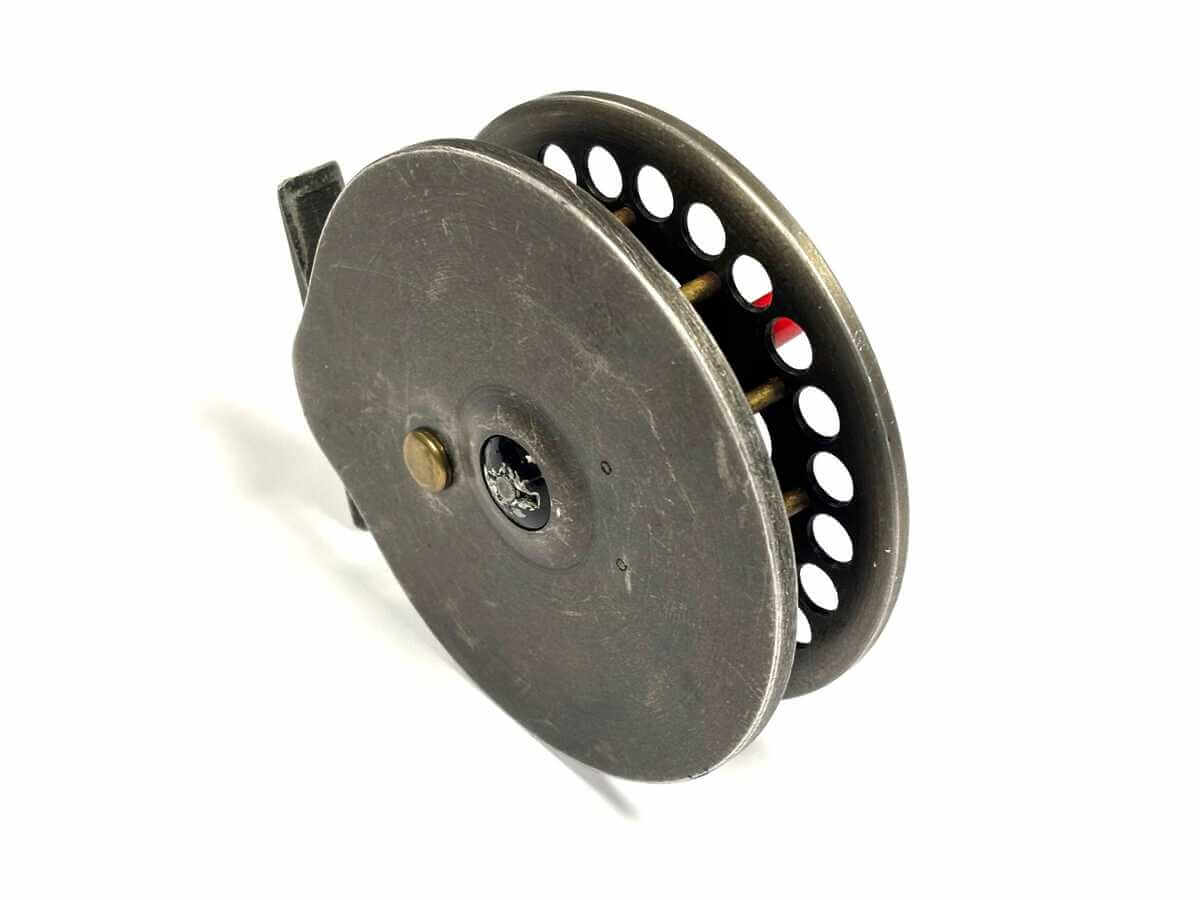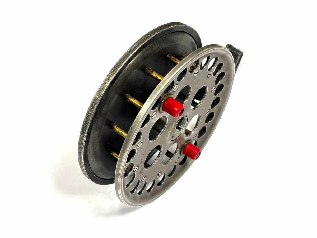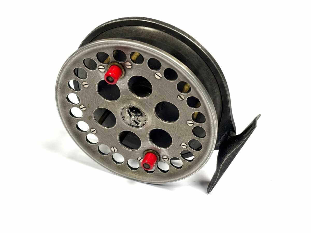 Just in as part of a 70 centrepin collection this first model Harry Reynolds centrepin reel with tarnished alloy finish, original dark red small handles, on/off check. 82mm straight alloy foot. Spins very well.