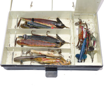 Good collection of vintage & antique fishing lures including large sole skin minnows up to 4” long, original hooks mounts & a series, a number of Herbert Hatton of Hereford stamped minnows of smaller quill type minnows, all held in a fine late Victorian multi-compartment black japanned box measuring 7”x4.75”x1.75” with hasp.