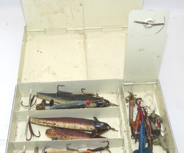 Good collection of vintage & antique fishing lures including large sole skin minnows up to 4” long, original hooks mounts & a series, a number of Herbert Hatton of Hereford stamped minnows of smaller quill type minnows, all held in a fine late Victorian multi-compartment black japanned box measuring 7”x4.75”x1.75” with hasp.