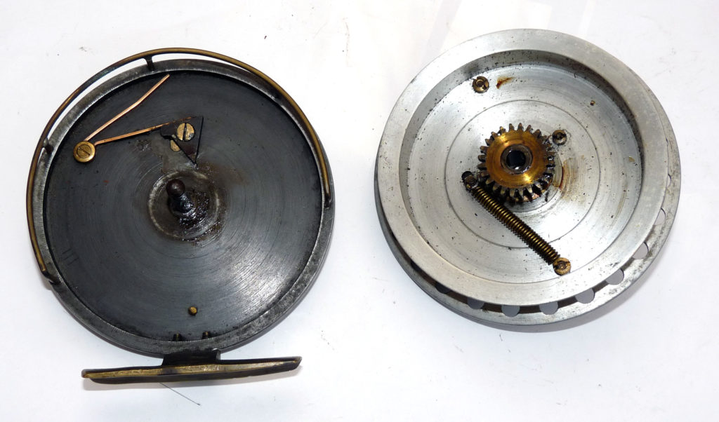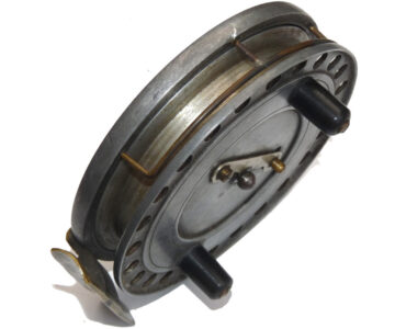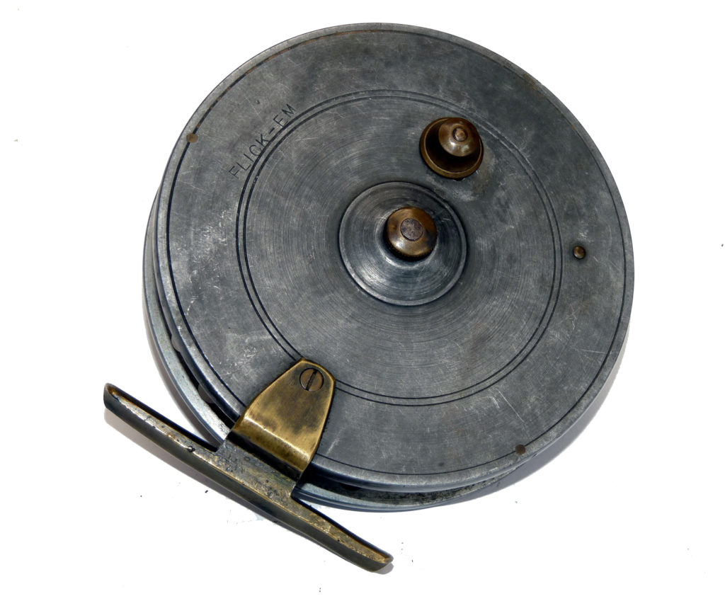 Early Flick-em 4” alloy narrow drum trotting reel with heavy-duty Bar latch, twin black handles, 5 pillar wire line guide, backplate optional check, correct 68mm smooth brass foot, the reel spins well, light drum rock as most of these have, a good example.