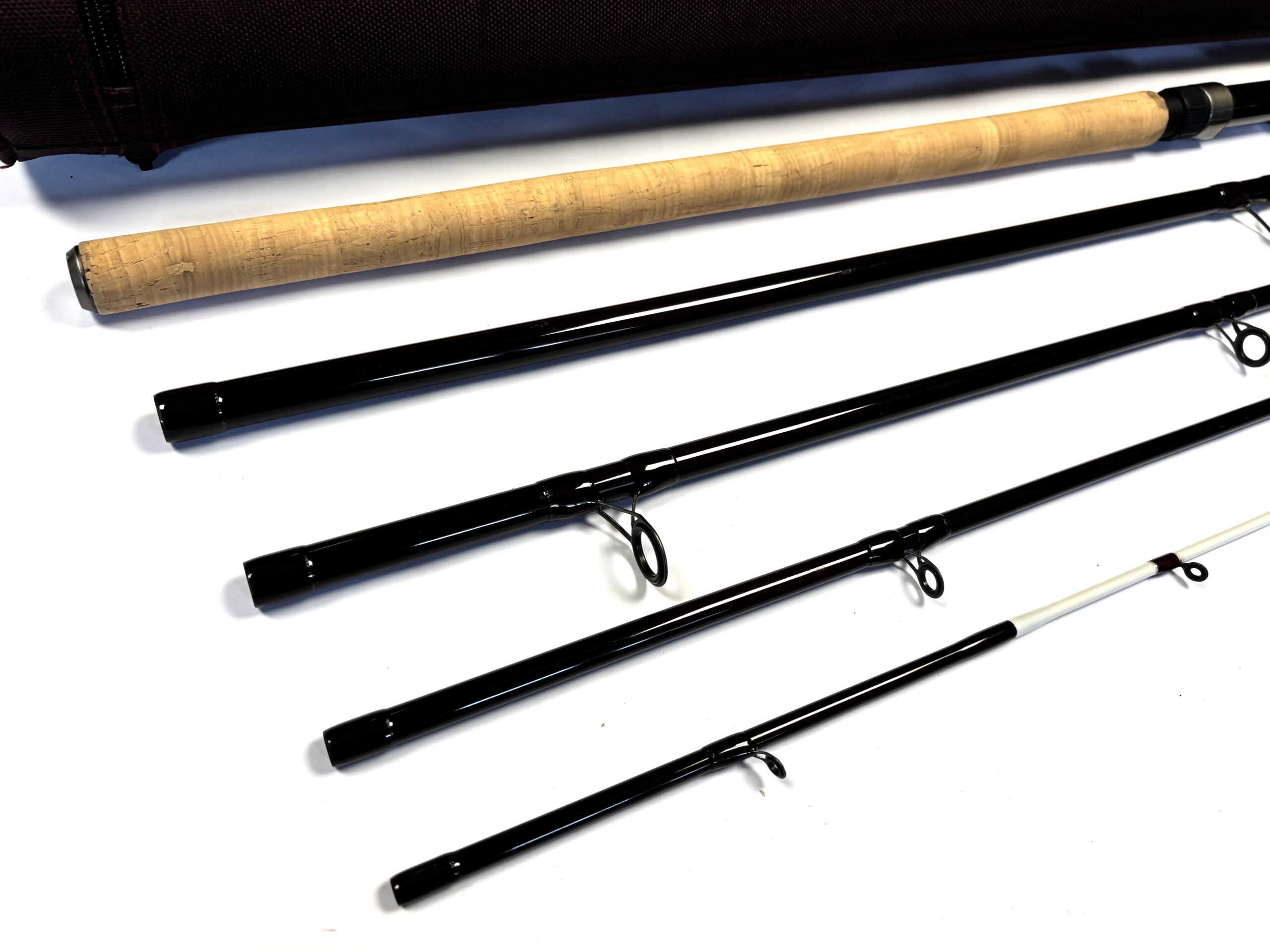 Thomas Turner Opinion: An excellent five-piece J.W. Young travel barbel rod, constructed from carbon for portability and performance. Features a long, smooth cork handle, dark alloy reel fittings, and lined guides throughout. Supplied complete with its original dark purple Cordura rod tube. A highly practical and well-presented example.