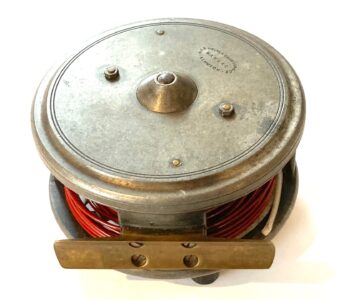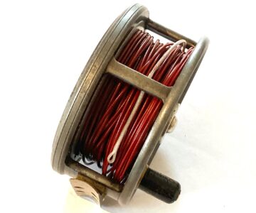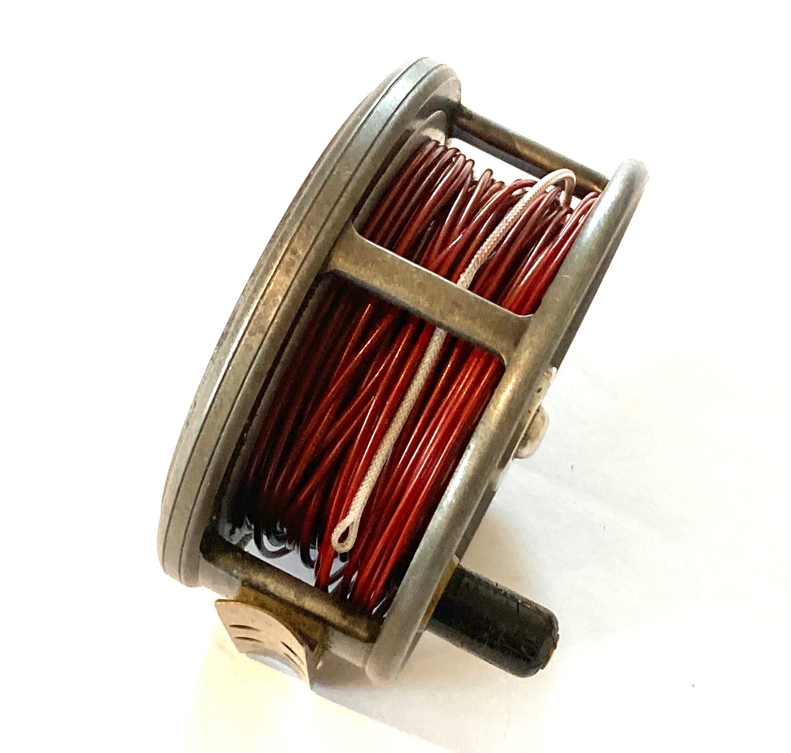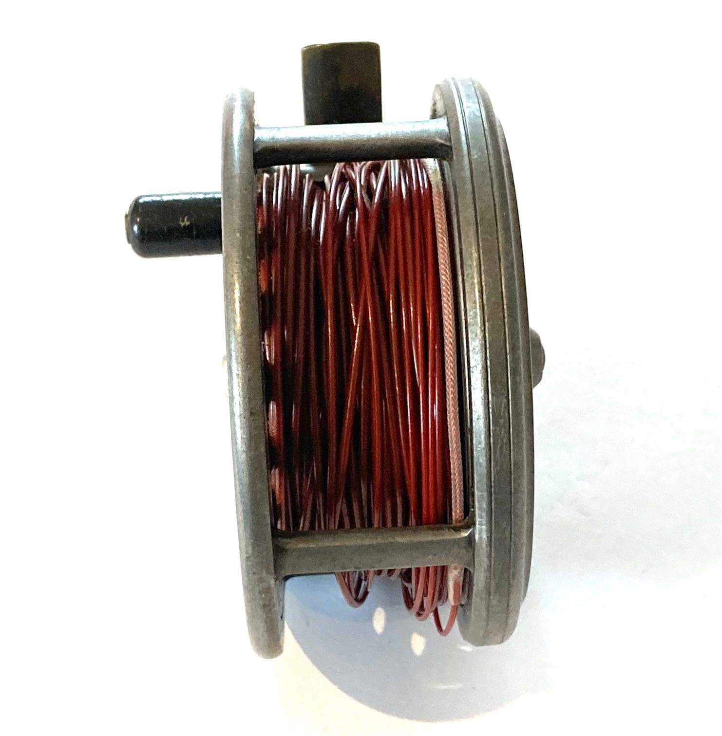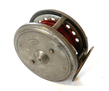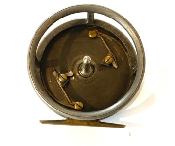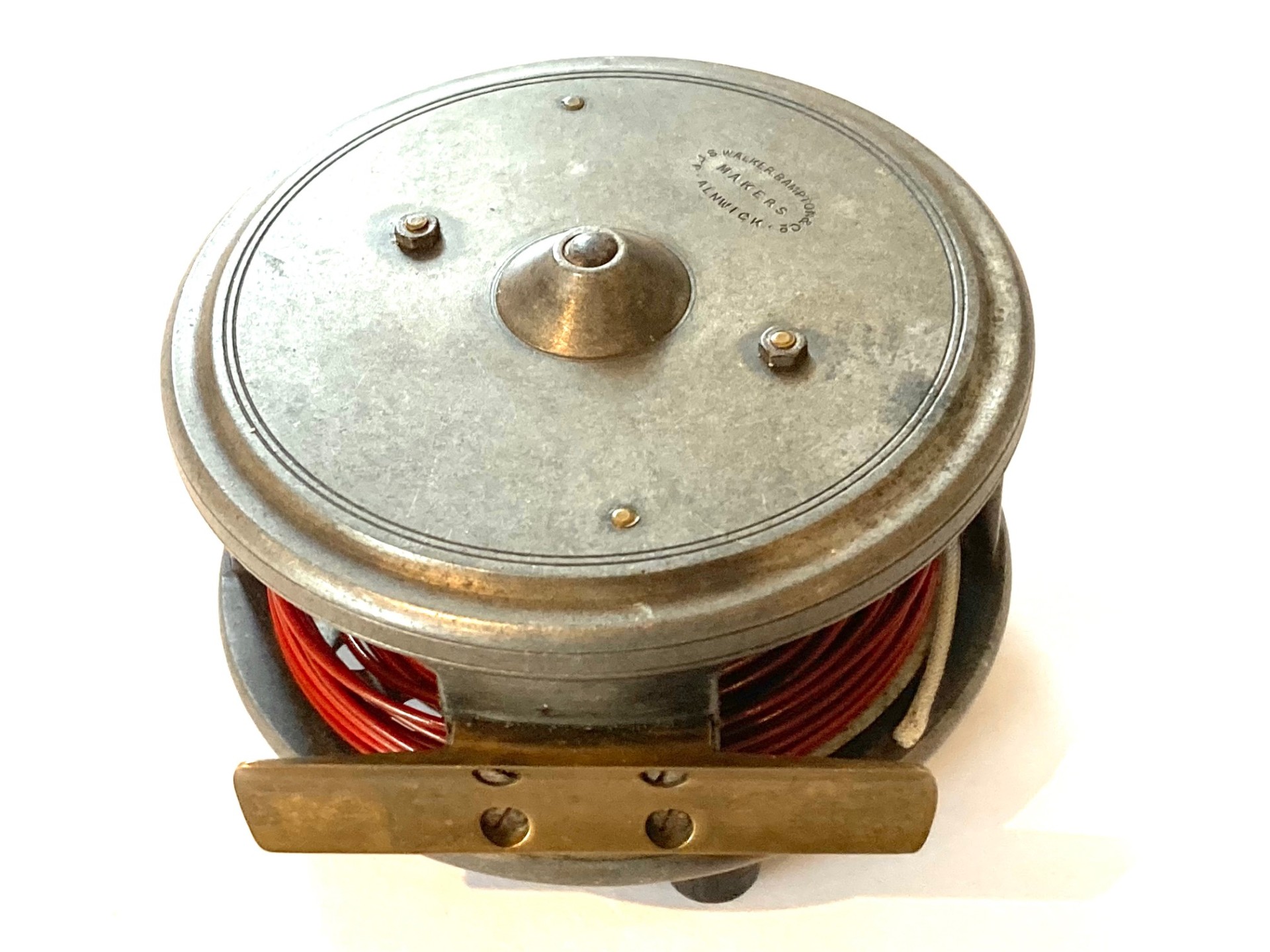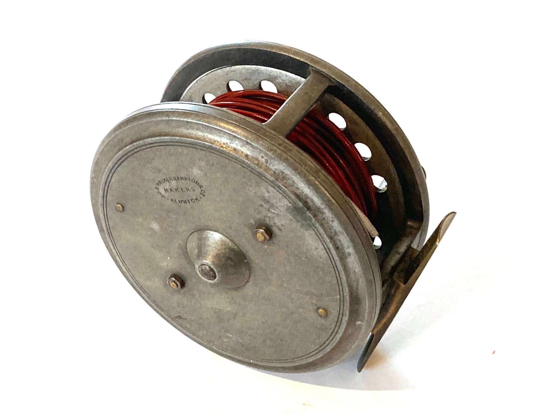 Notes: A lovely JJS Walker Bampton salmon fly reel. 4” diameter. Factory black handle with maker’s oval logo stamp to the backplate. Two screw quick release drum latch. Heavy dual spring check. Silky smooth operation when turning. Factory correct 80mm smooth brass foot. The reel has no wobble or play. A fine collector’s example retaining most dark lead finish on perforated face plate. An excellent fishing reel with classic looks from this famous Alnwick maker. One to fish or collect!