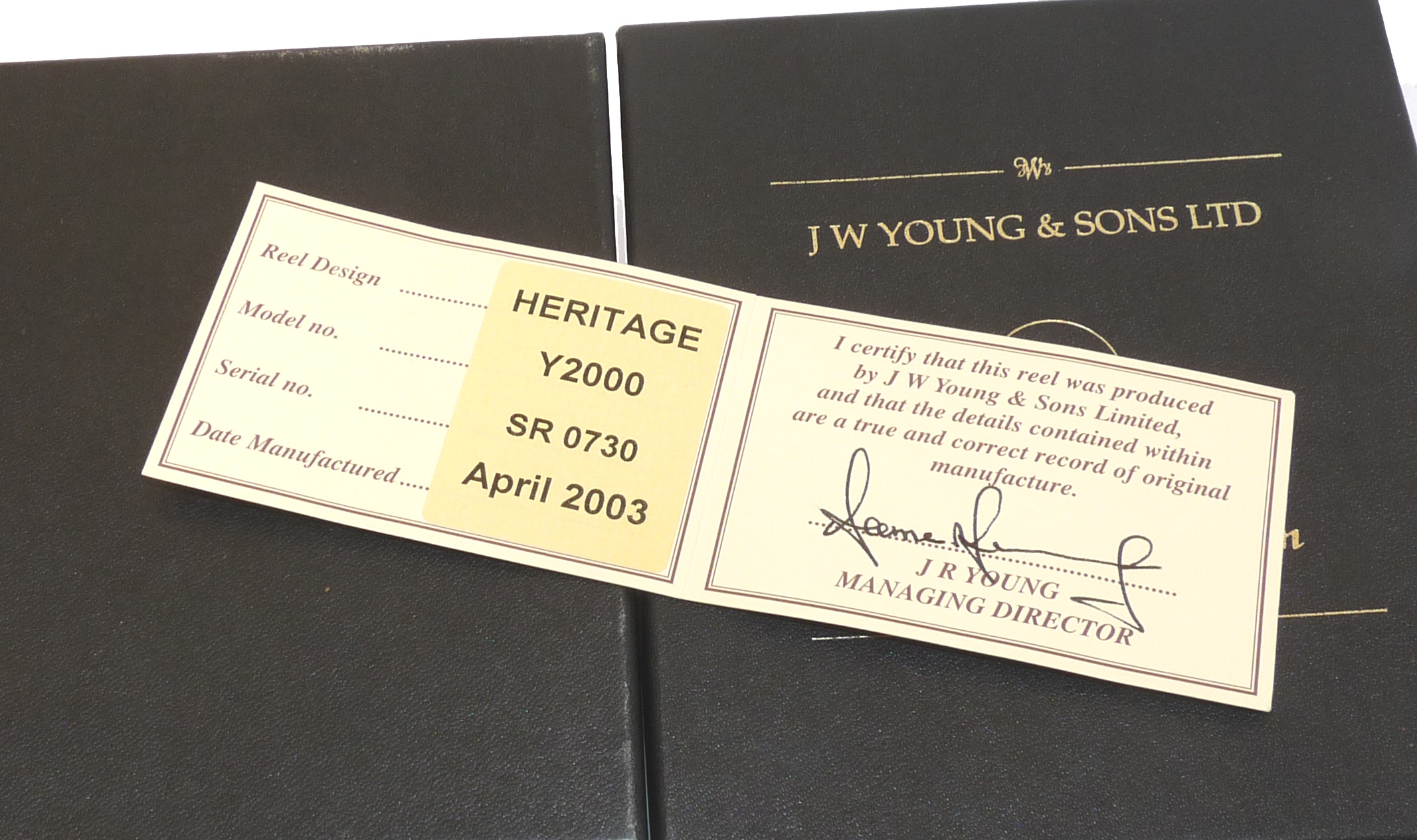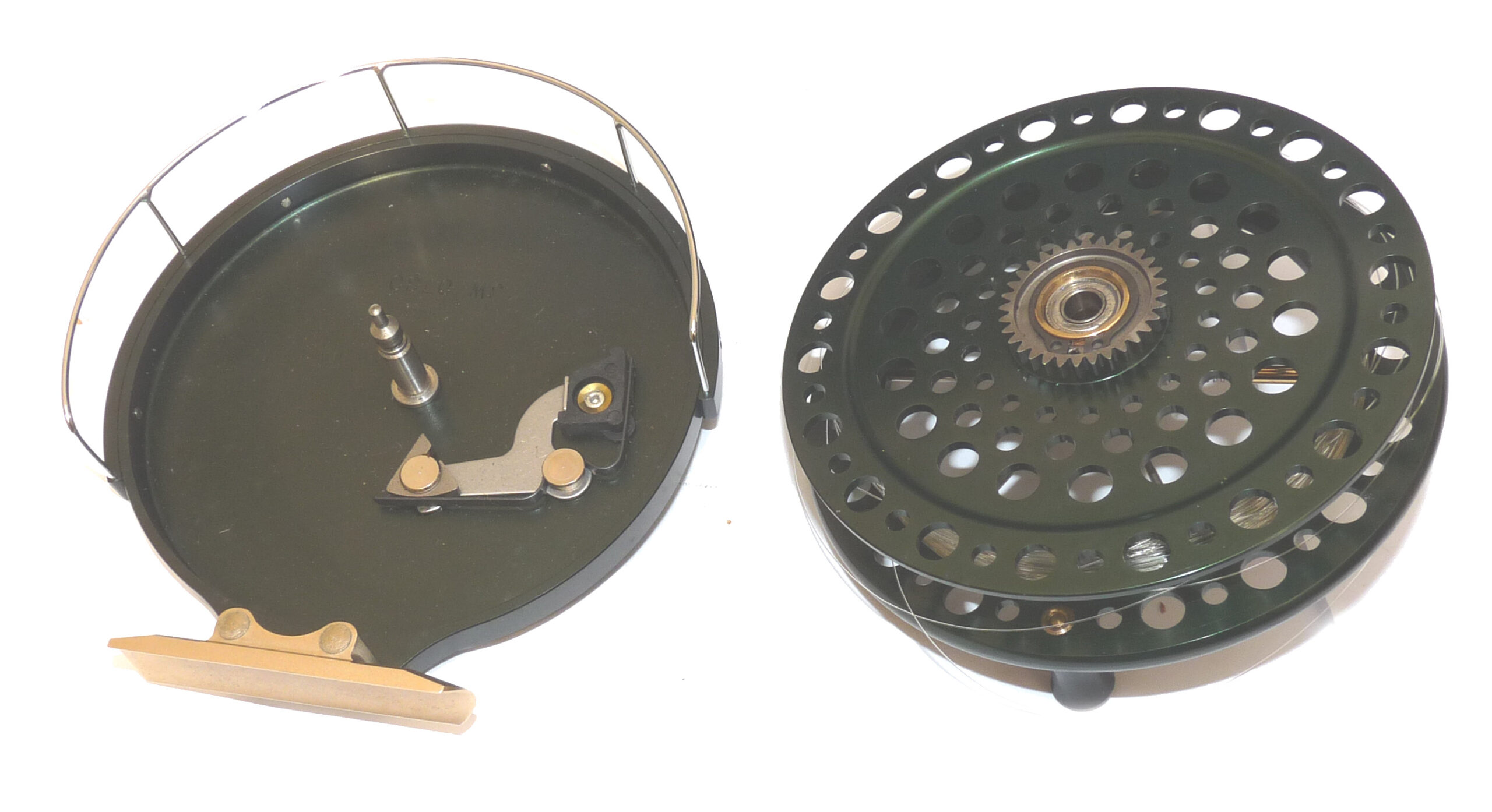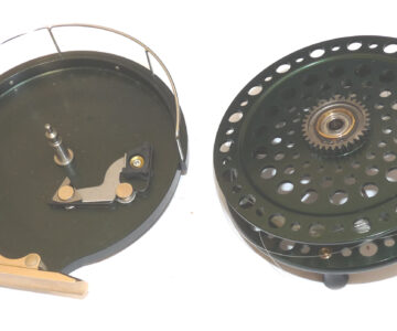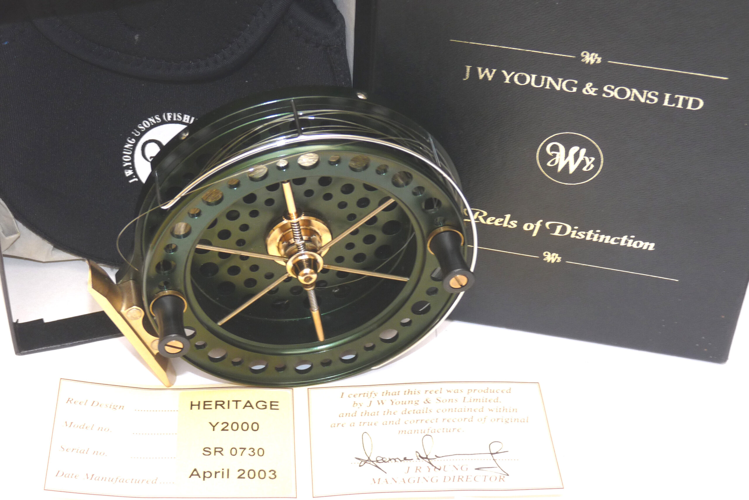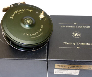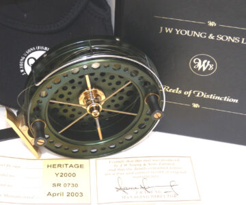 J W Young John Wilson Heritage 4.5″ Aerial reel in green finish, Mint condition. No 0730 built 2003 with COA and zip case. built on the lines of the original Aerial it features a classic green anodised finish. twin black handles, fully ventilated drum. 6 spoke with tension regulator, smooth plated foot blade, on of check button to the backplate and line guide. A Superb smooth-running reel has a line on but doesn’t appear used. Comes with COA No 0730 dated April 2003, a good early model. Card signed by J Young, makers neoprene case, papers and out card box with correct labels