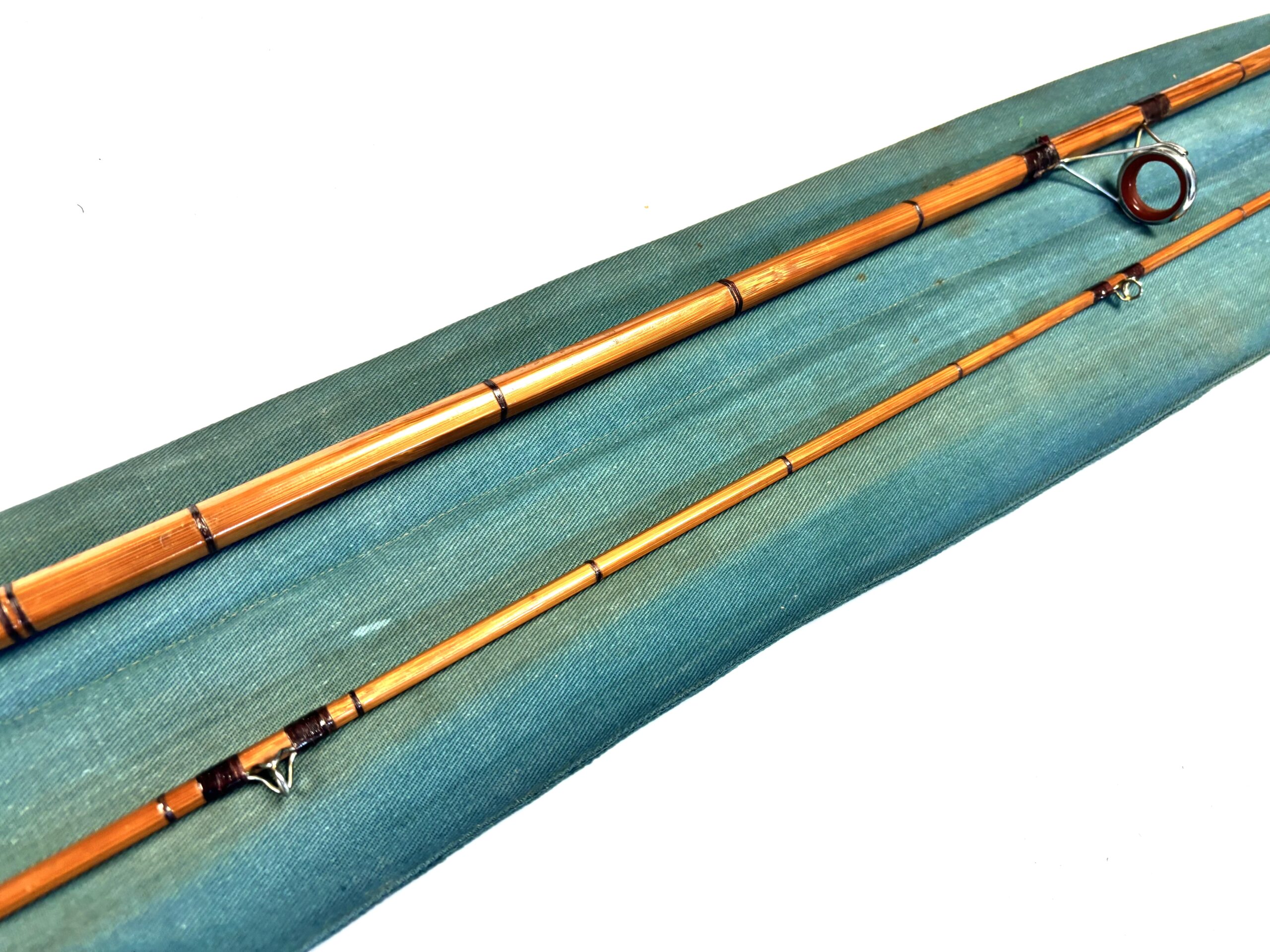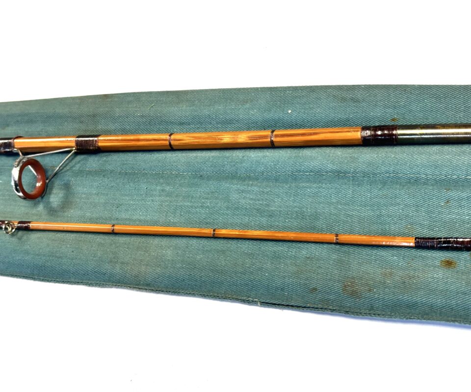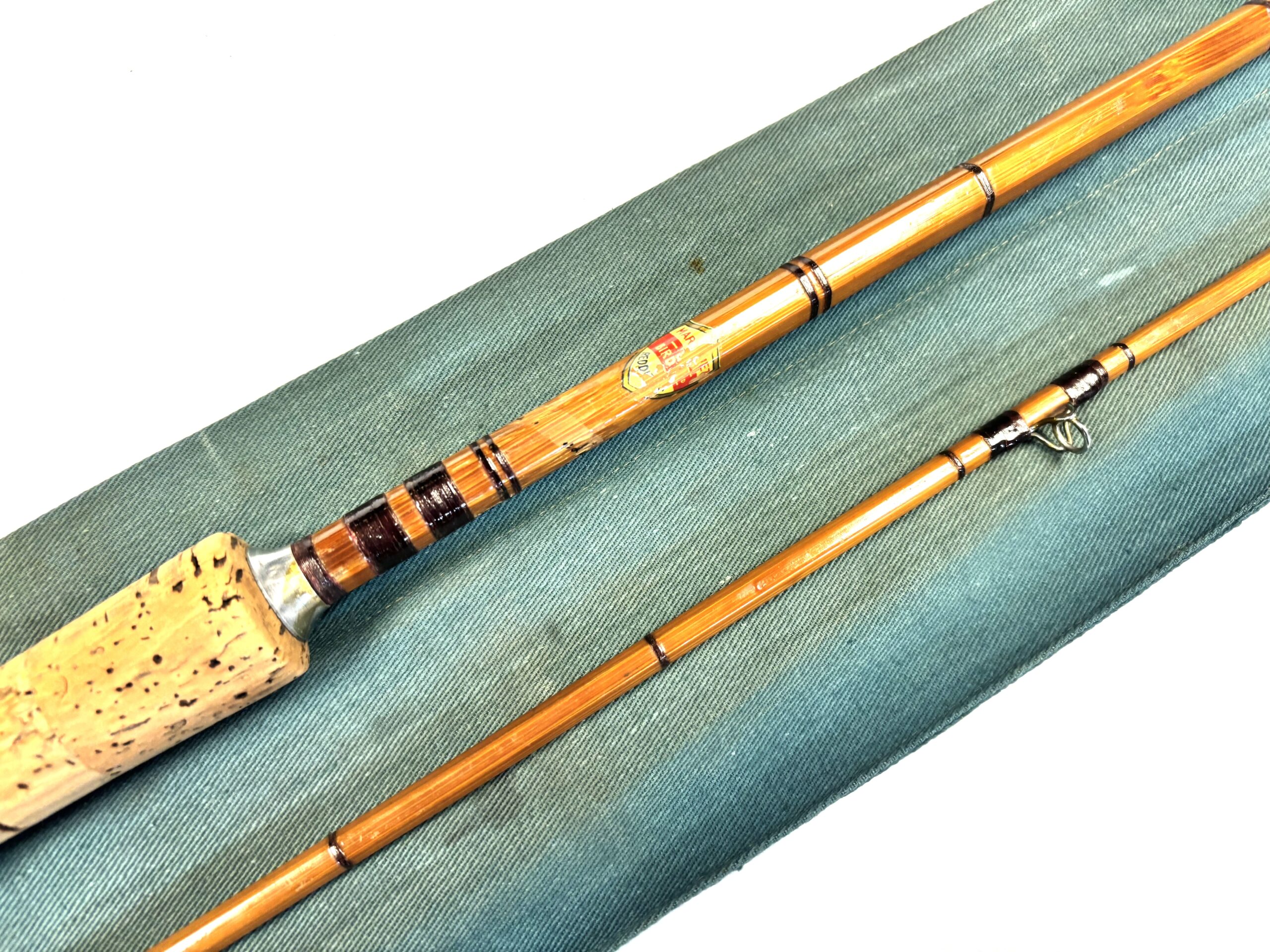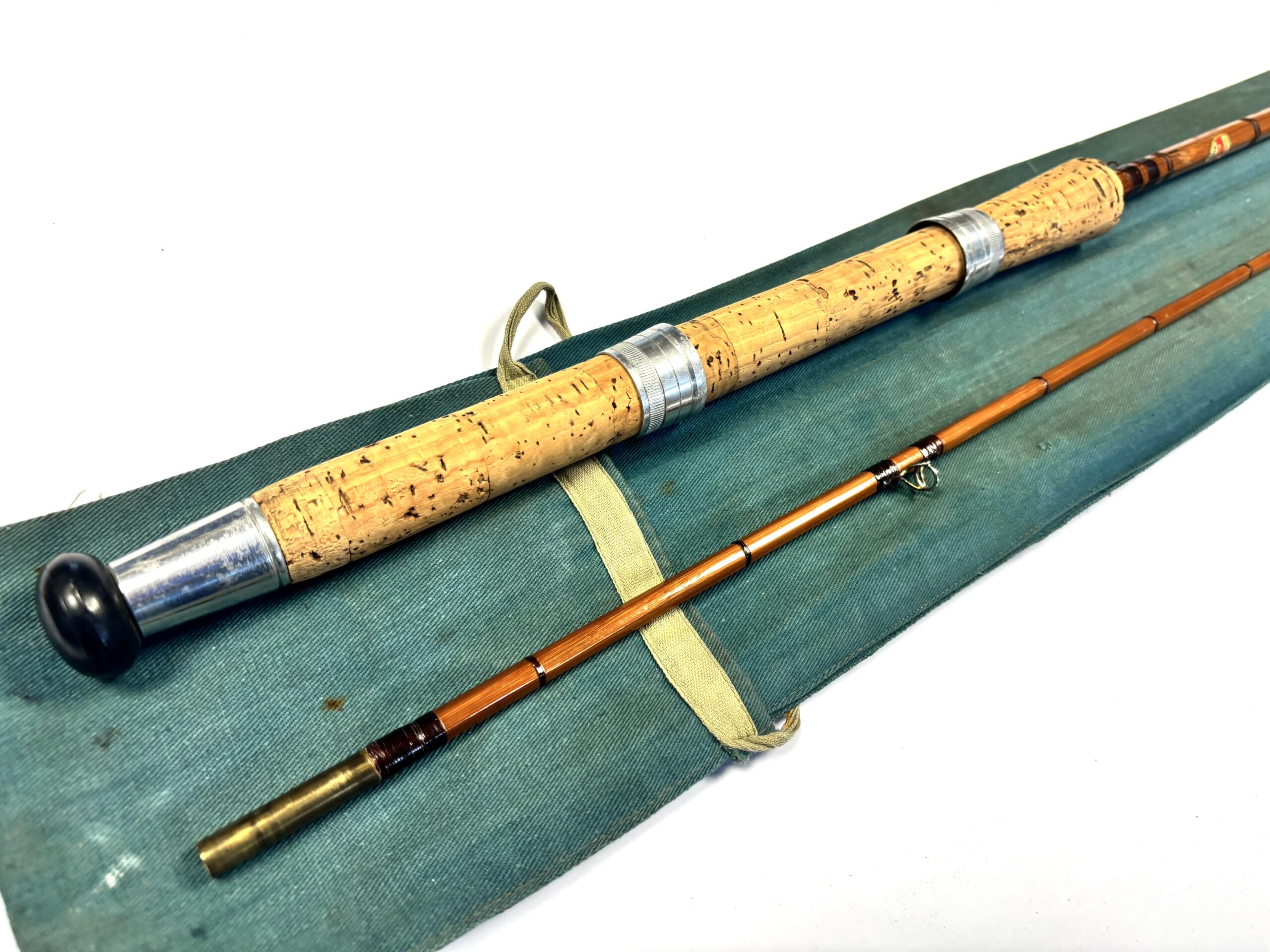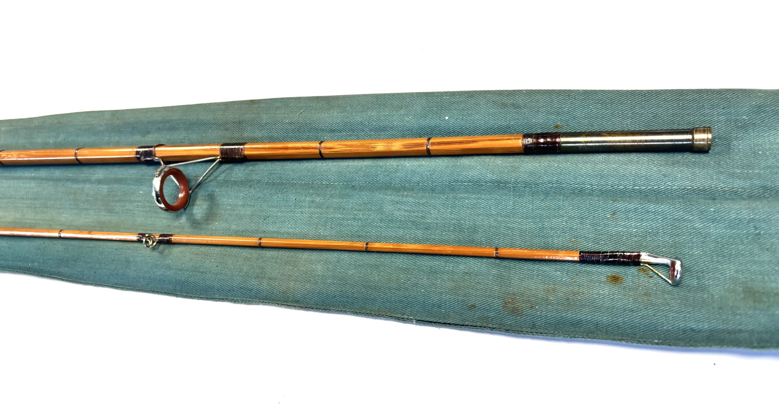 A very good two-piece Avon-style rod with agate rings, red wraps, cork handle and alloy fittings. Green rod bag.