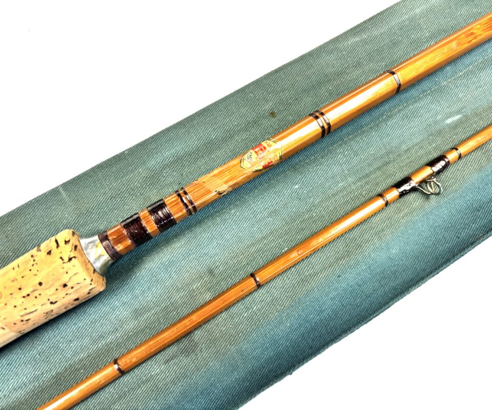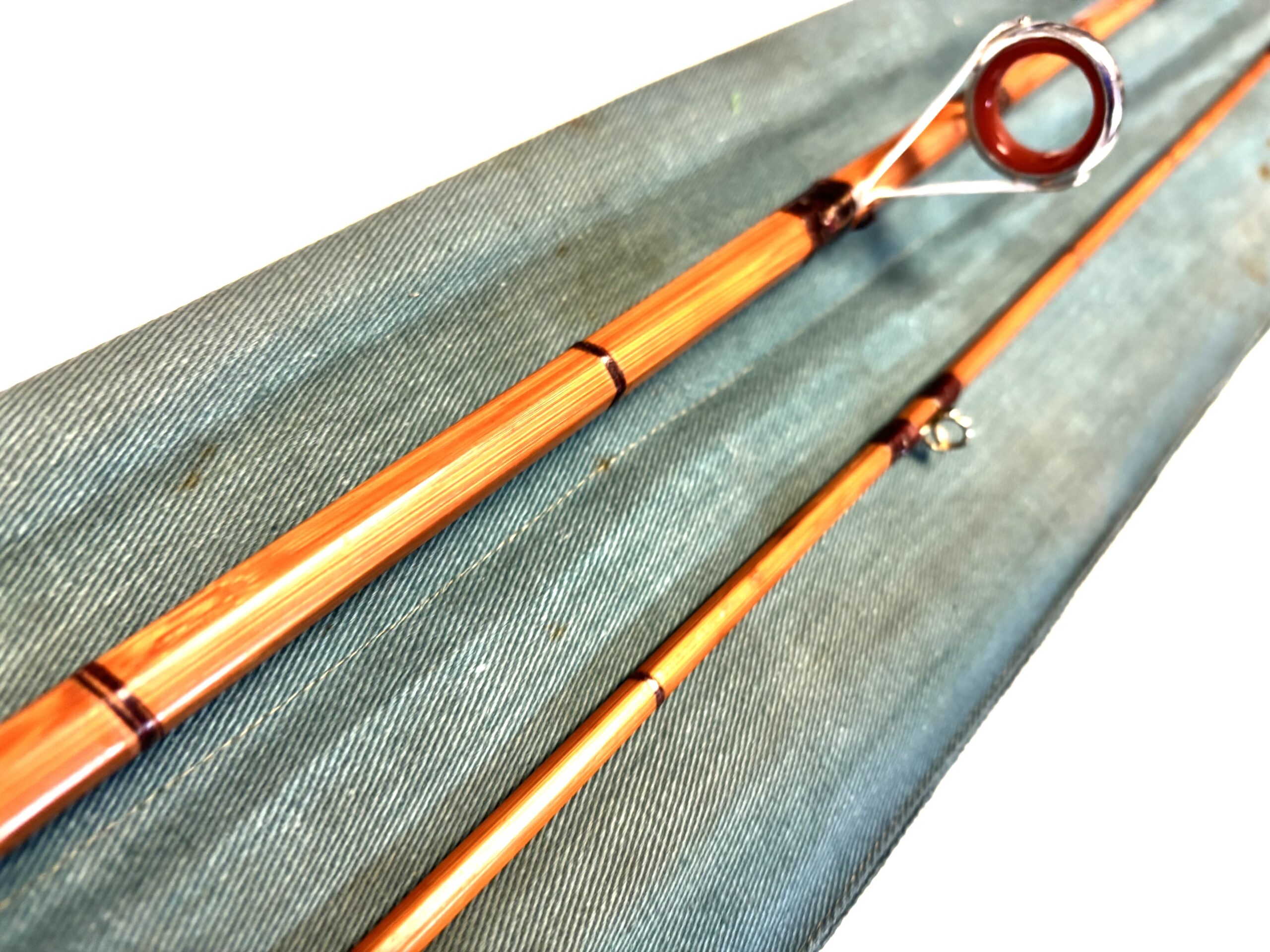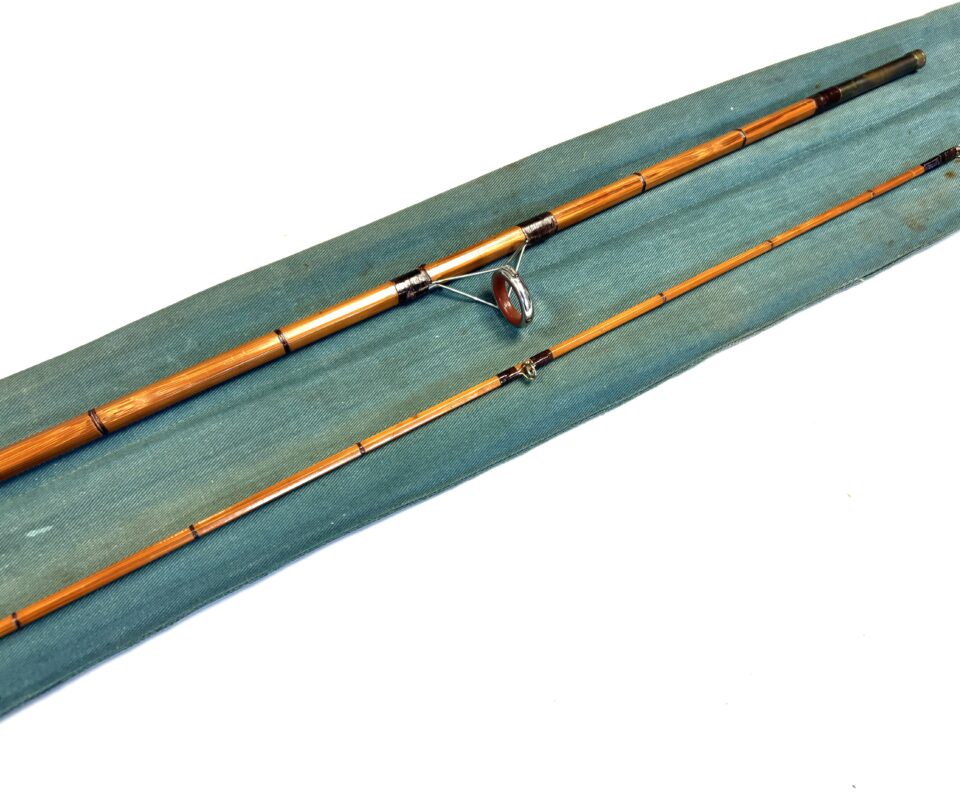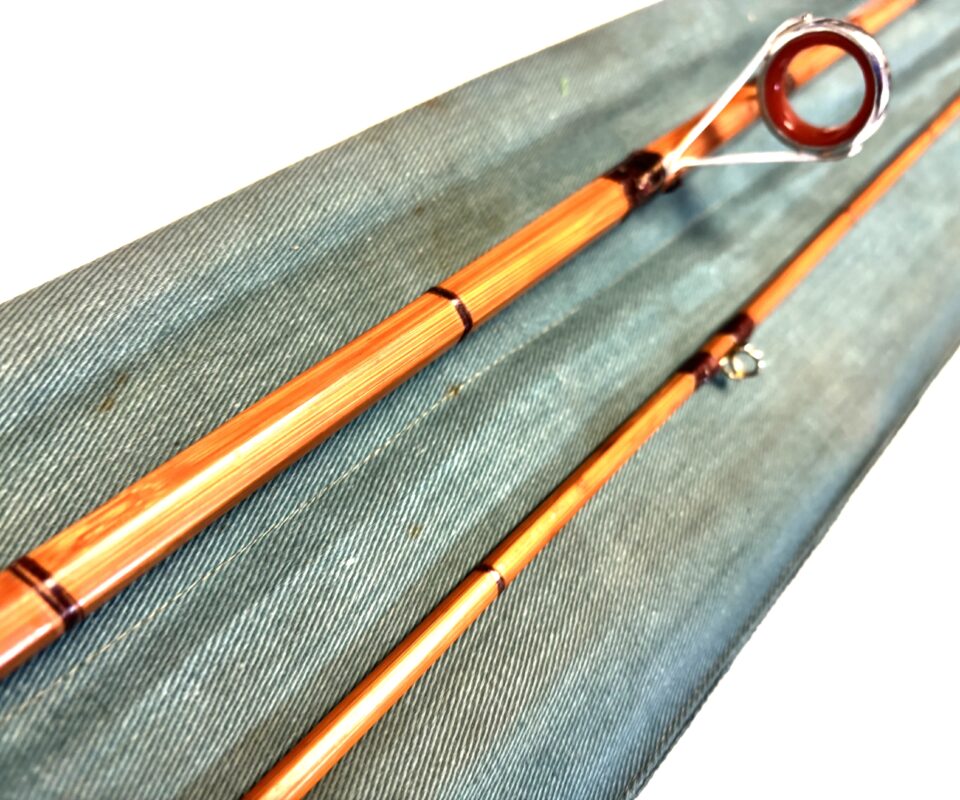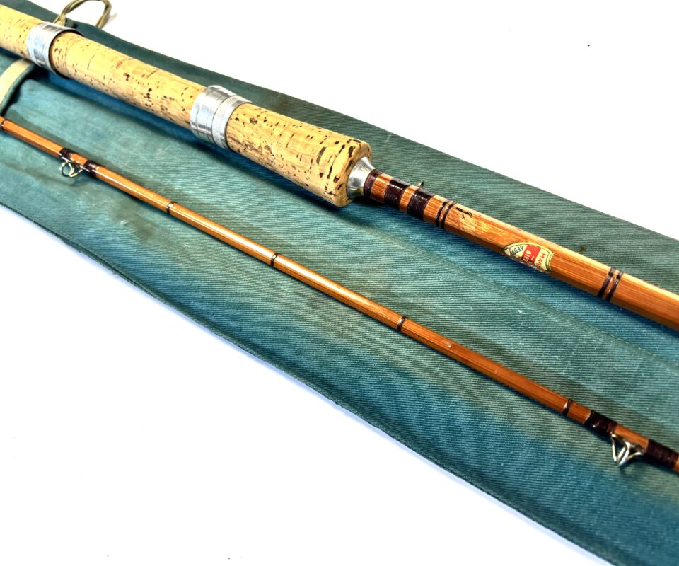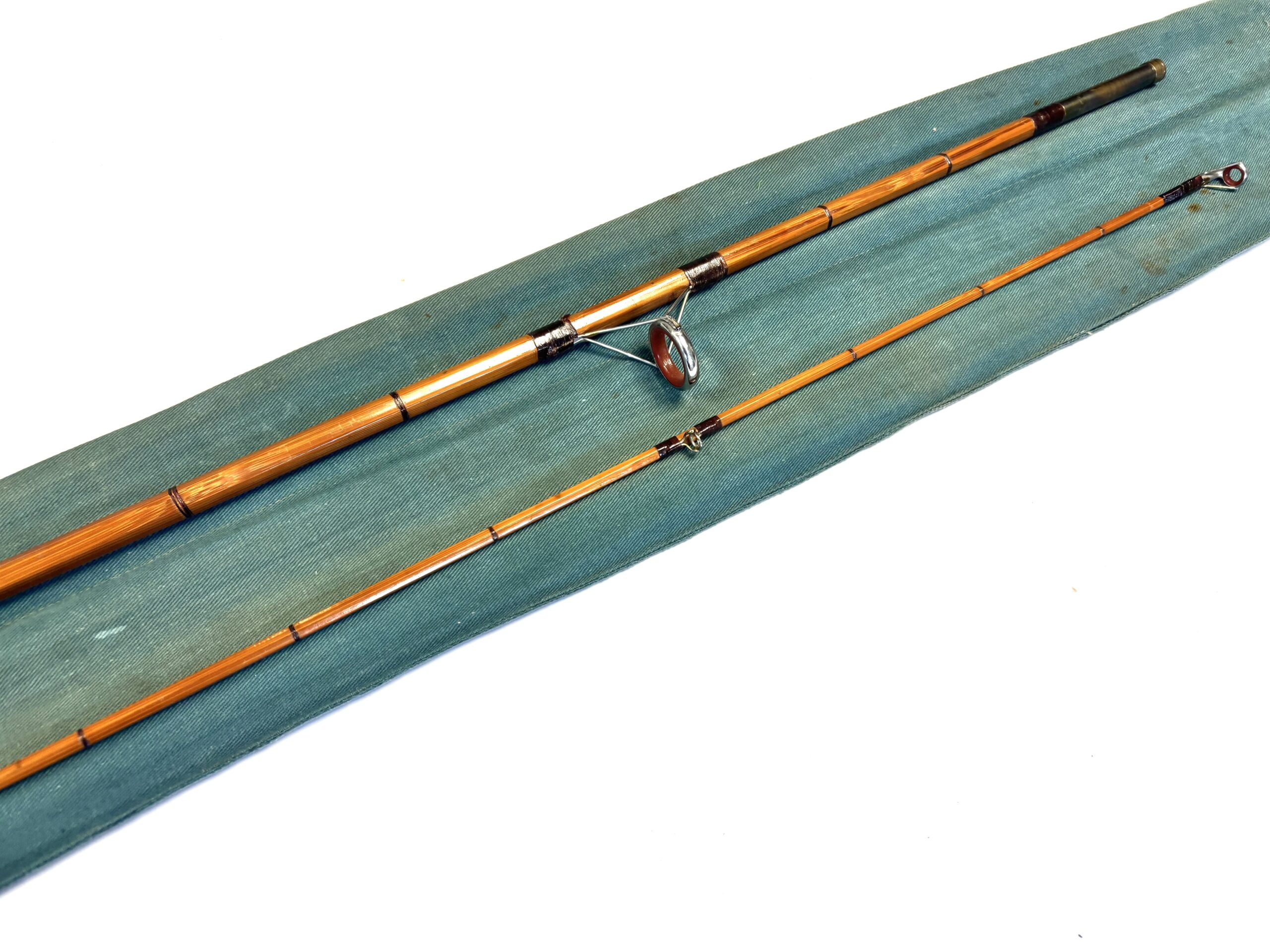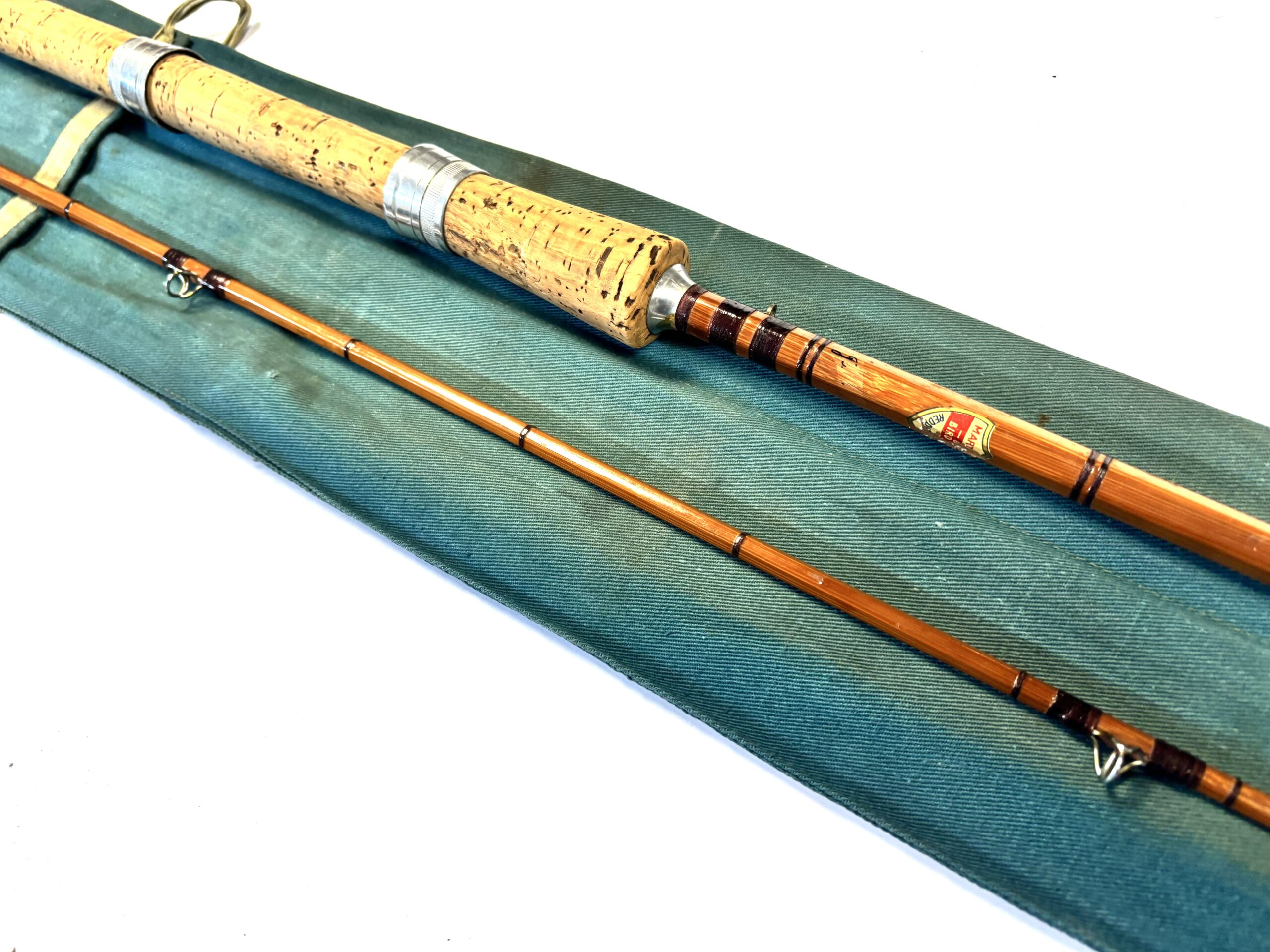 A very good two-piece Avon-style rod with agate rings, red wraps, cork handle and alloy fittings. Green rod bag.