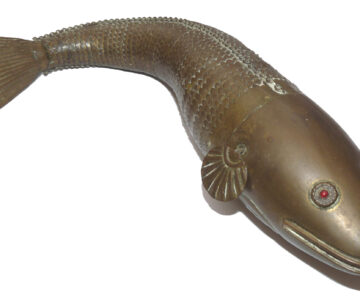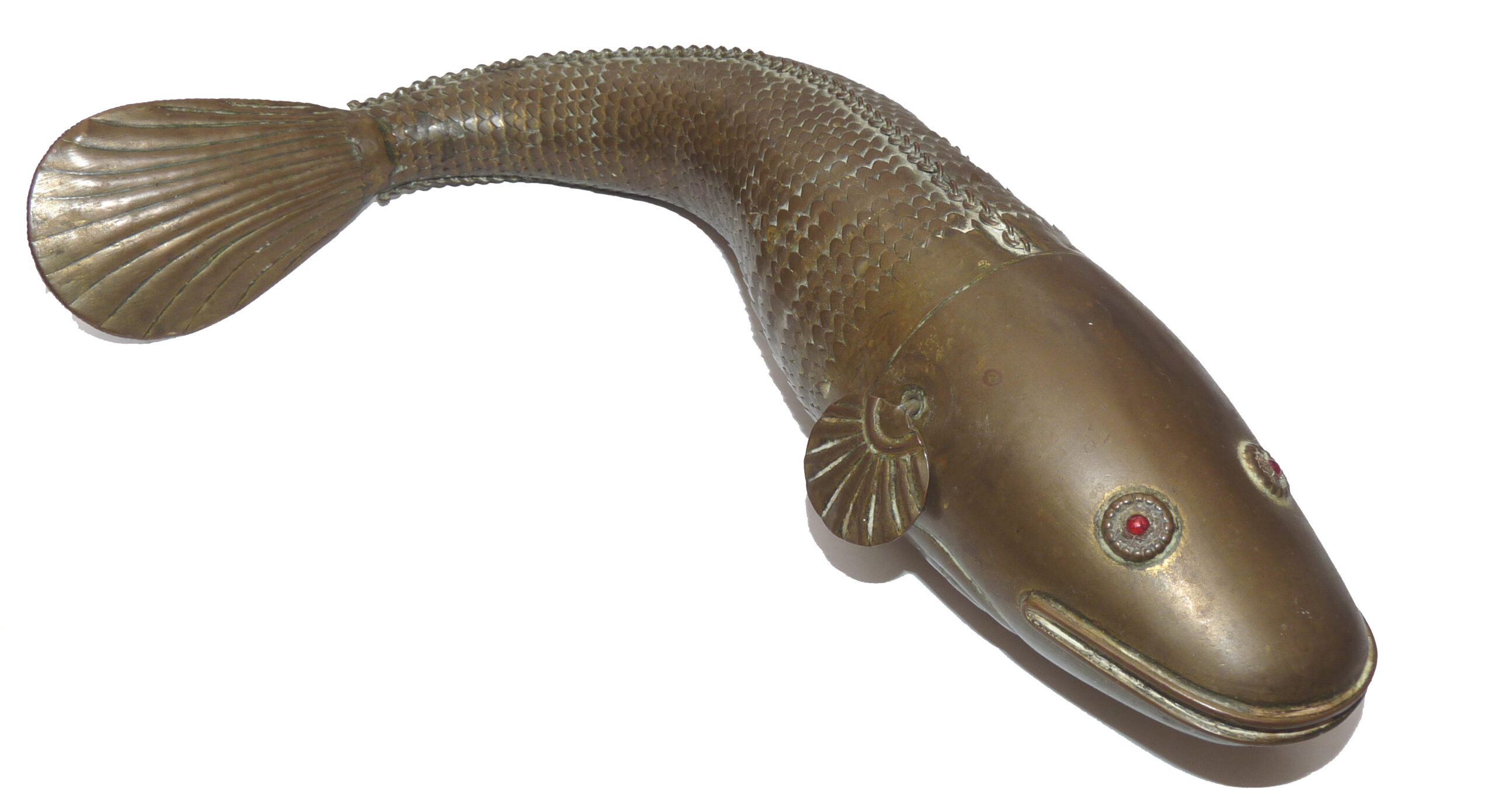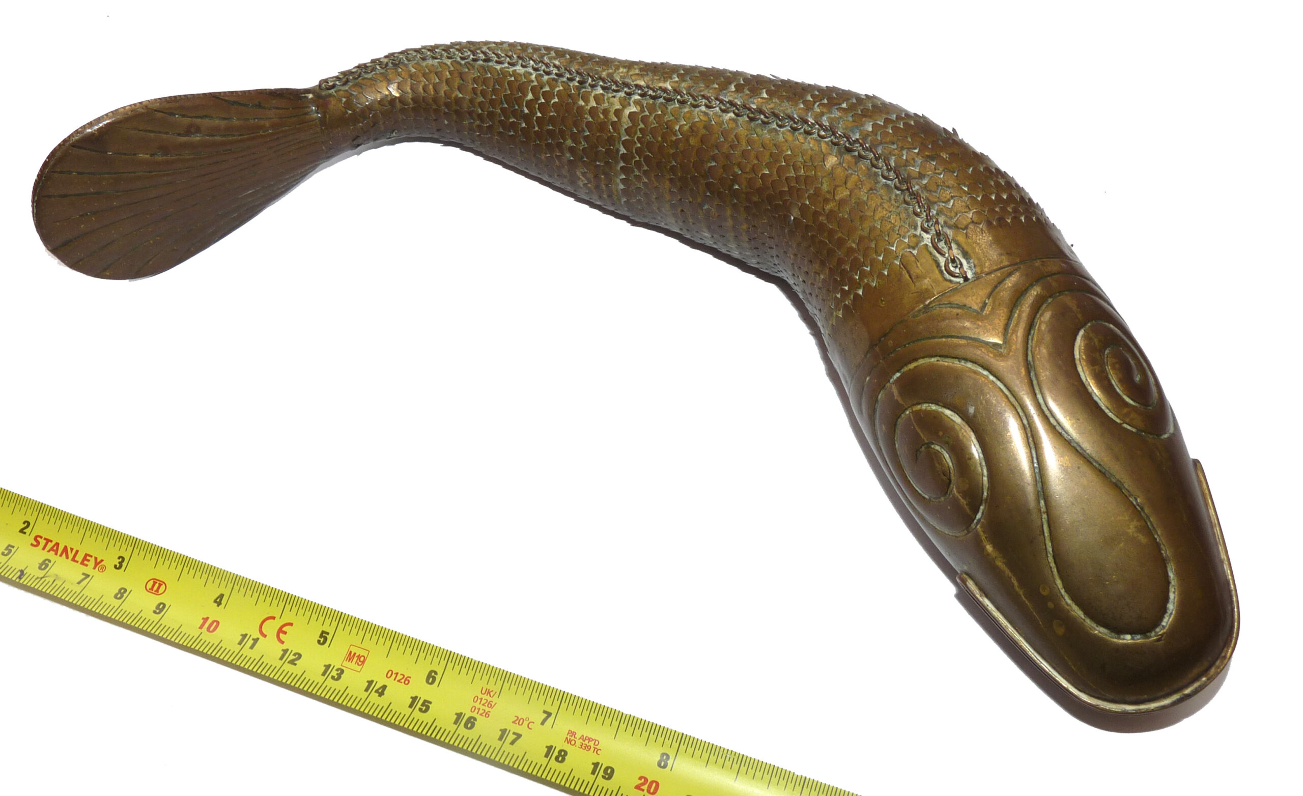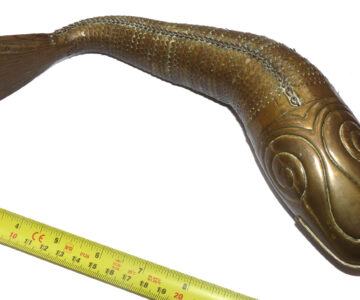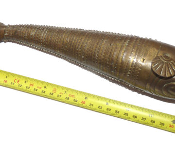 A superb large example of an antique all brass Medina Fish in 14″ length, fully articulated, high quality with moving parts and original red paste eyes . This fish retains virtually all its original finish and will look amazing on any collector shelf. The left fin missing, If you are a bit of a handicraft sort of person you could probably make one. but it still looks amazing on the shelf. The term Medina fish was popularised by Graham Turner in his first reference book “Fishing Tackle for Collectors”,1989, an example from the sunken SS Medina is featured on the front cover.