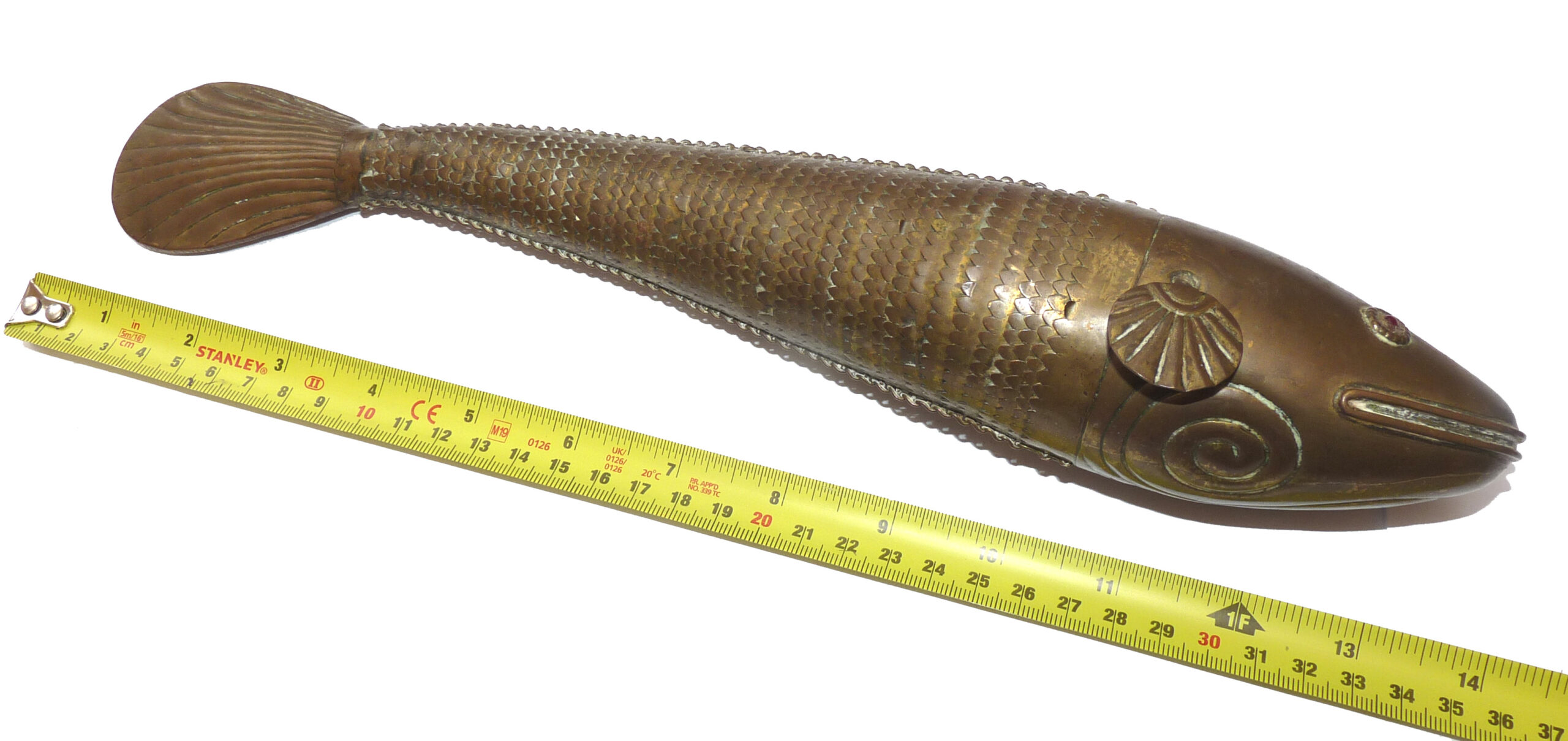 Medina vintage brass Fish in 14″ length,rare size fully articulated body original red paste eyes