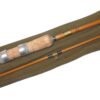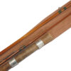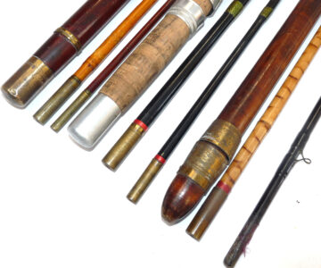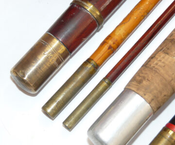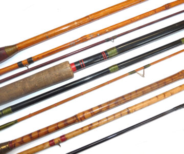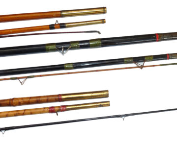 A vintage whole cane 12′ 3-piece float rod with spliced split cane tip, black finish, agate butt & tip guides, bronze ferrules with stoppers, 19″ cork handle, some rusting to ring frames but usable. And a pair of wood handled boys rods, 1 by Milward 1 with replacement longer tip, good decorative or user rods with some light restoration.