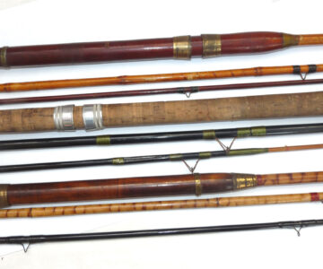 A vintage whole cane 12′ 3-piece float rod with spliced split cane tip, black finish, agate butt & tip guides, bronze ferrules with stoppers, 19″ cork handle, some rusting to ring frames but usable. And a pair of wood handled boys rods, 1 by Milward 1 with replacement longer tip, good decorative or user rods with some light restoration.