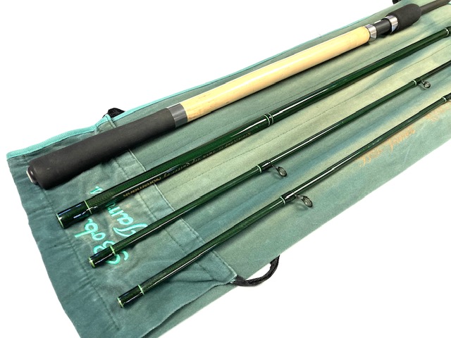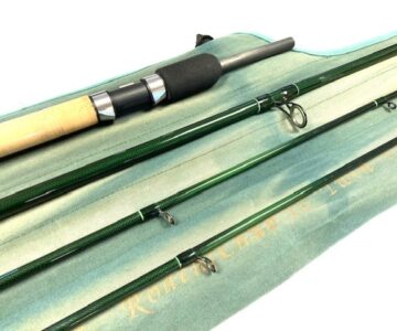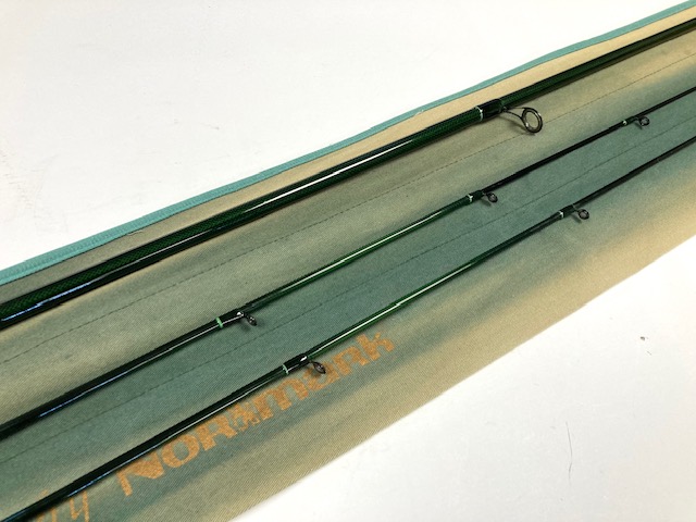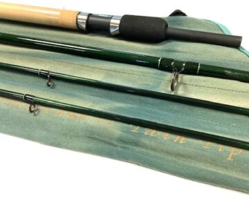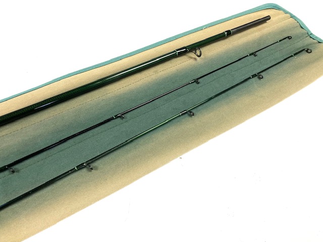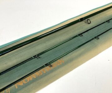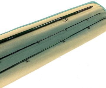 TT opinion: This is a rarely seen Normark Bob James 12′ rod on green blank with lined guides whipped black tipped green, 20.5″ cork handle, Graphite reel seat. The rod is factory original, all pieces the correct length. In original partly sun bleeched green cloth rod bag! Ideal travel rod for many species and ready to fish!