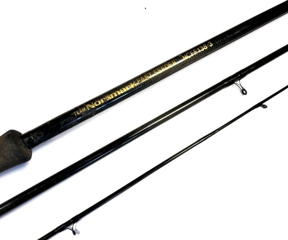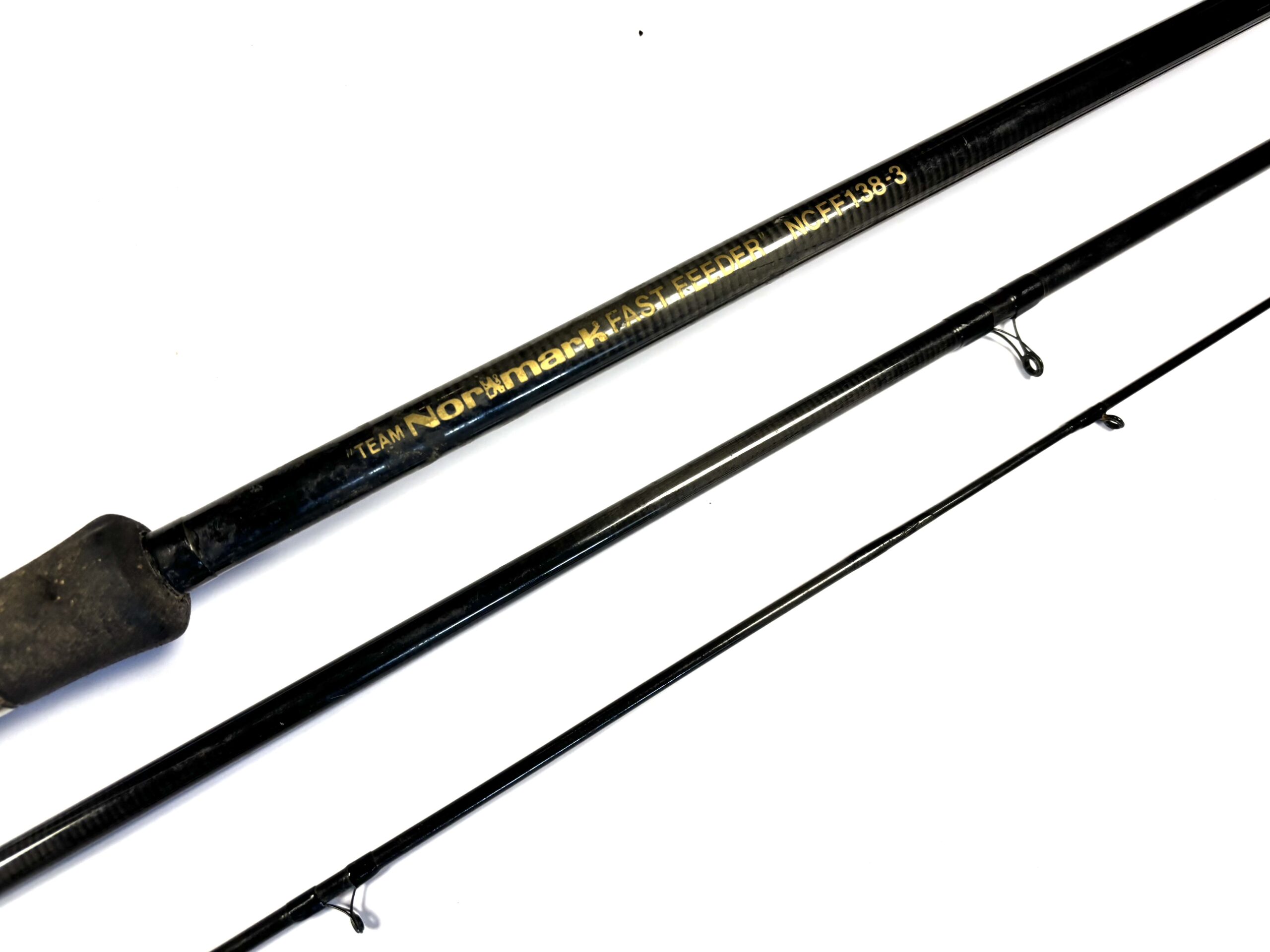 A good used 11’6” three-piece Normark Fast Feeder rod with cork handle, Fuji reel fittings and lined guides. No bag.