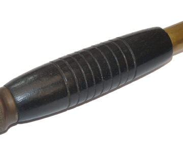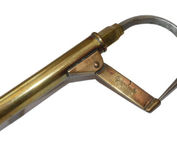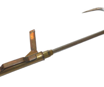 Ogden Smiths of London England antique extending salmon gaff in fine condition, dating c 1900. This is a real collector’s item. Extending from 15” to 32.5”. two draw with steel forged hook. hinged point protector stamped with makers details and spring belt clip. Polished turned hardwood handle and brass butt cap. Super collector gaff to display in any man cave or tackle shop