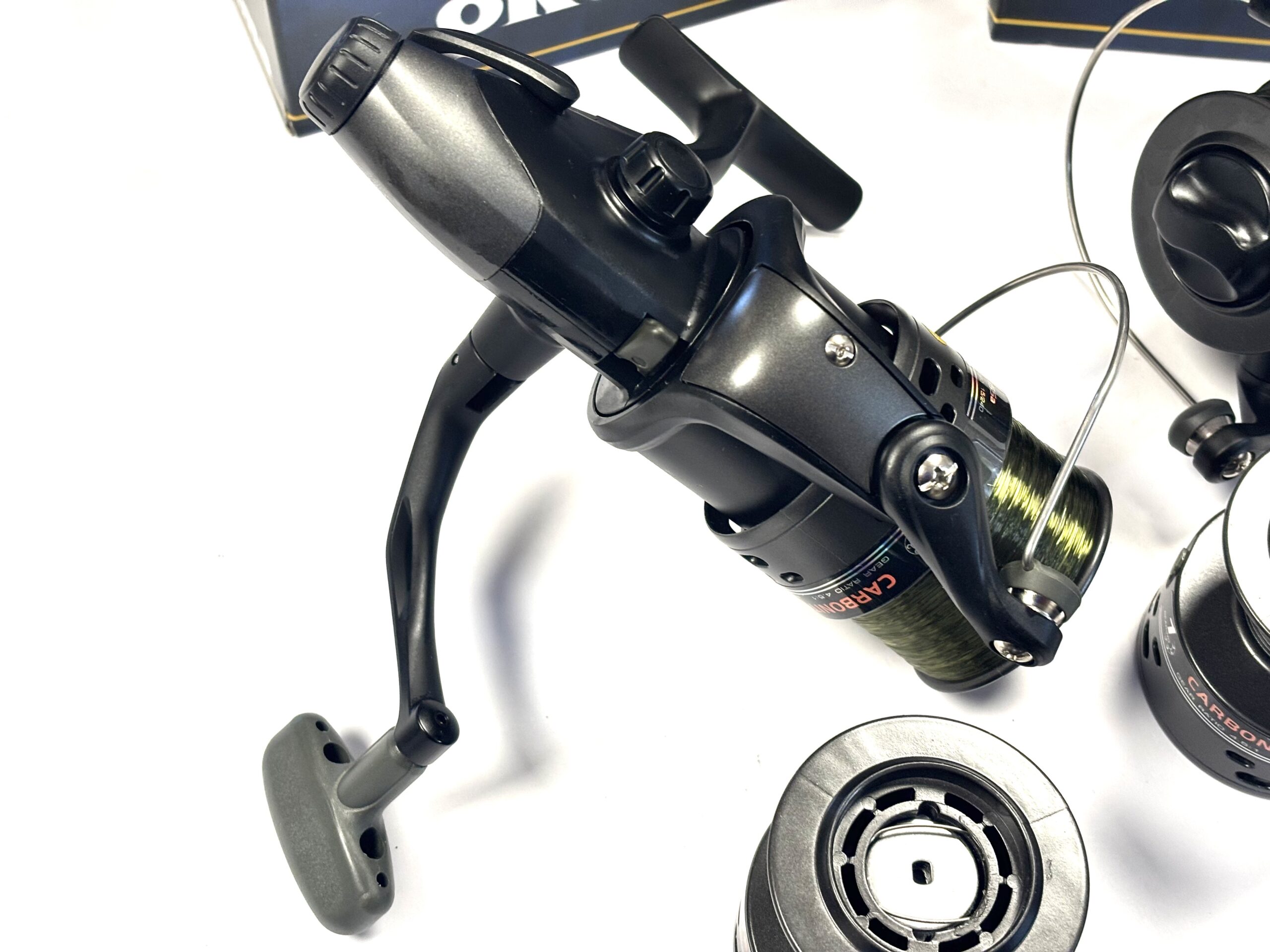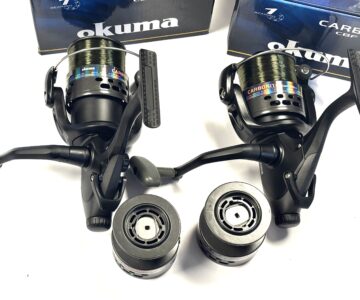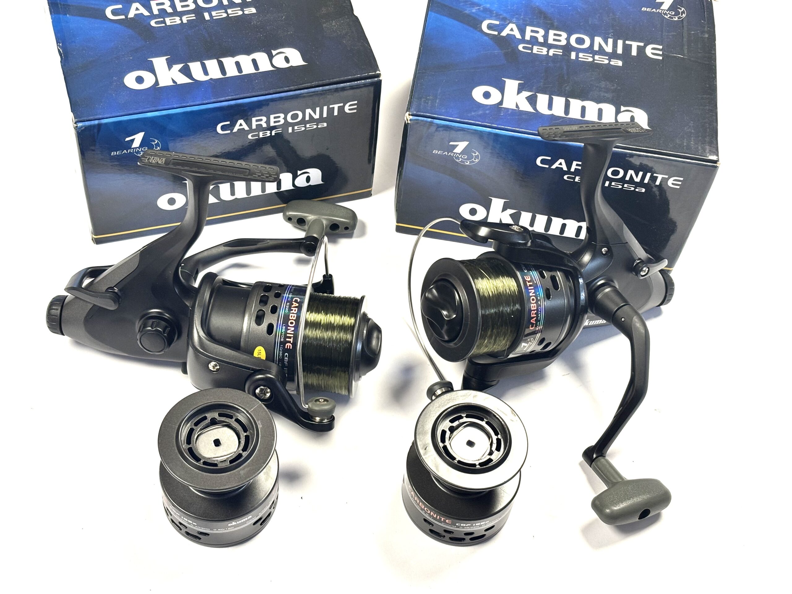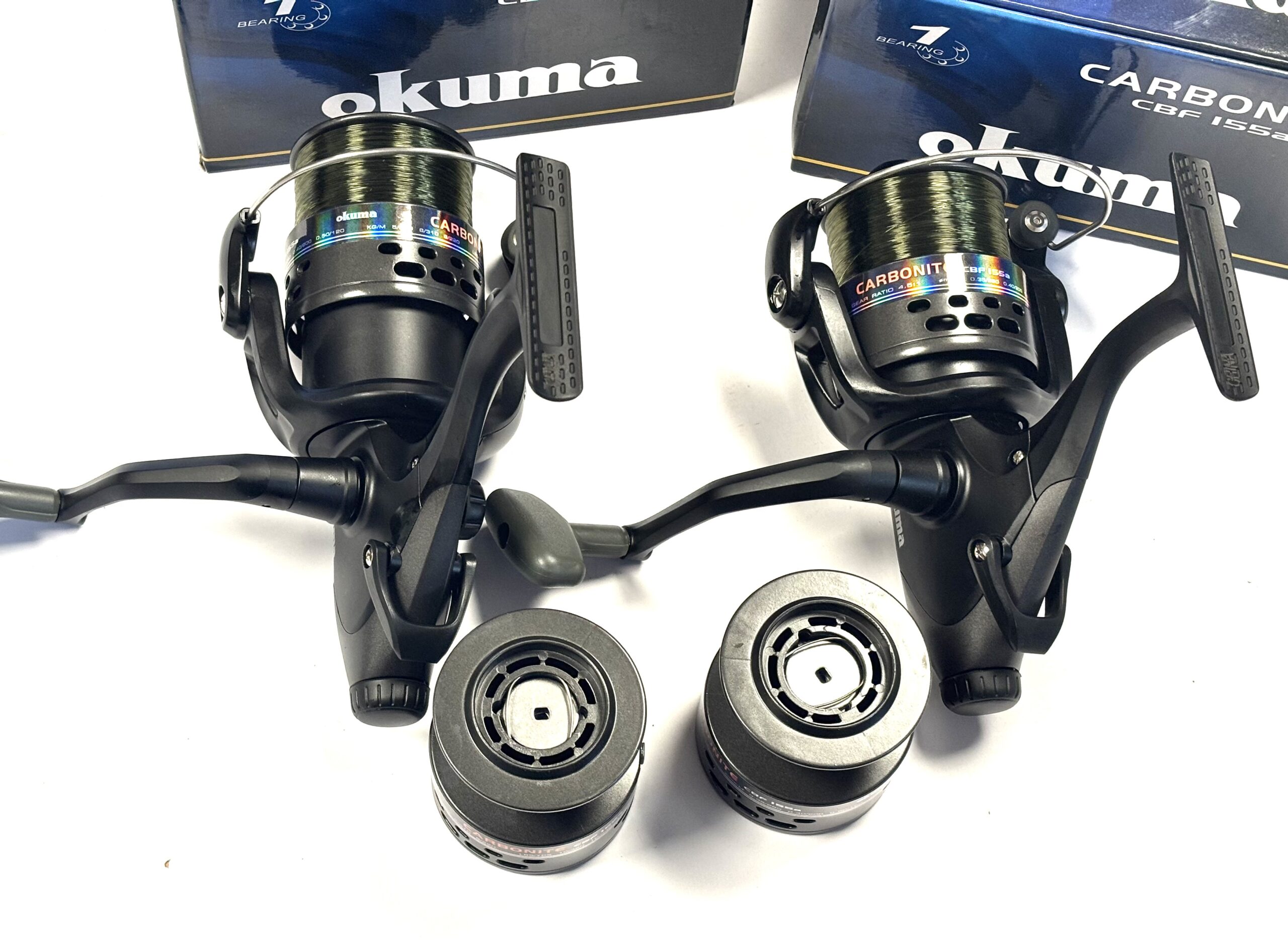 Thomas Turner Opinion: An excellent pair of Okuma Carbonite CBF155 fixed spool reels, both featuring strong rear drag systems. Supplied with spare spools and complete with original boxes. A practical and reliable setup for coarse fishing.