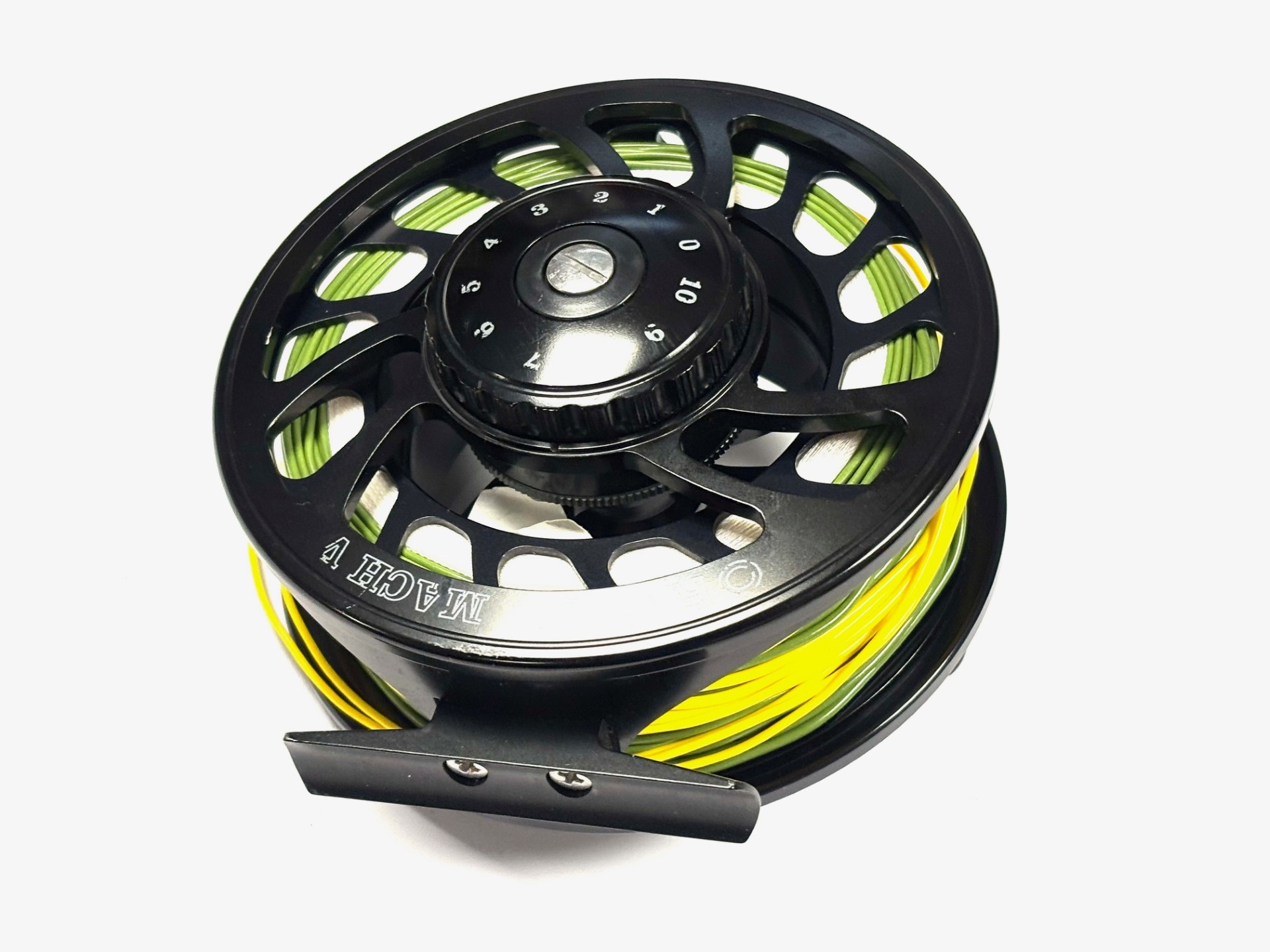 As popular as ever this Mach V large arbor salmon reel is in very good usable condition with black handle and circular small counter balance, disc tensioner to rear and alloy foot. Comes loaded with floating line & spare spool.