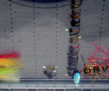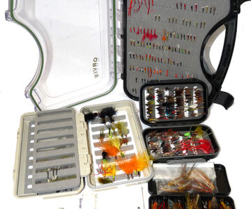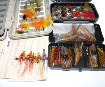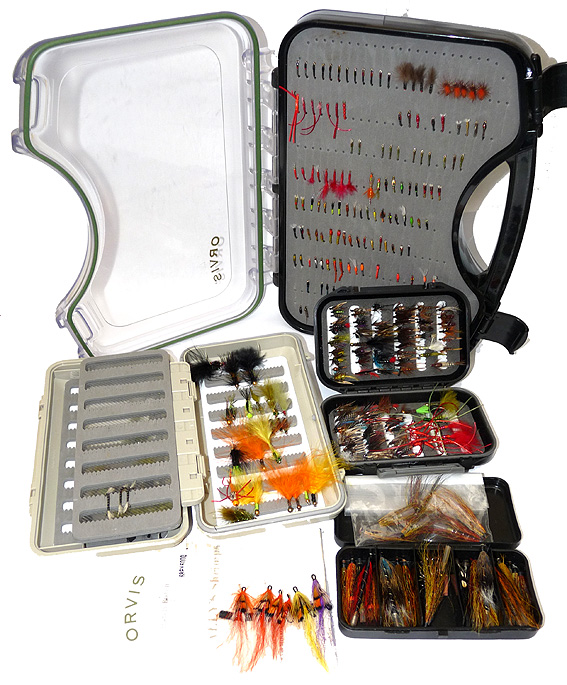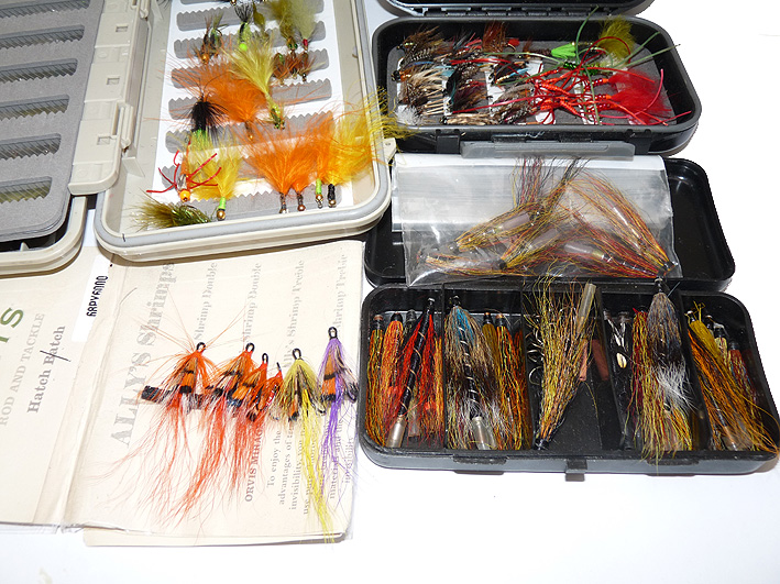 Notes: A good selection of trout, sea trout and salmon flies. All held in 4 boxes. Orvis double sided viewer box 11” x8” with carrying handle. A Wheatley floating box 8” x4.5” with central swing leaf and two other boxes plus a card of Orvis Ally’s Shrimp flies. Gold heads, nymphs’ lures. Something for every occasion here