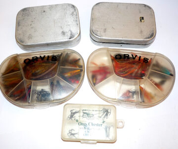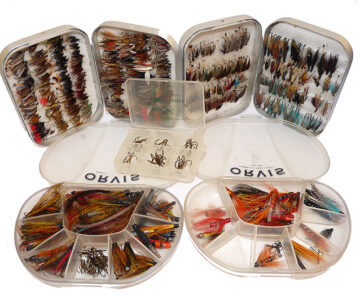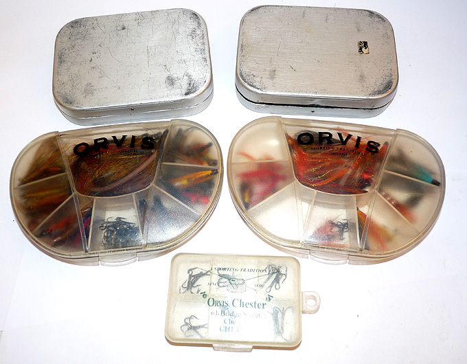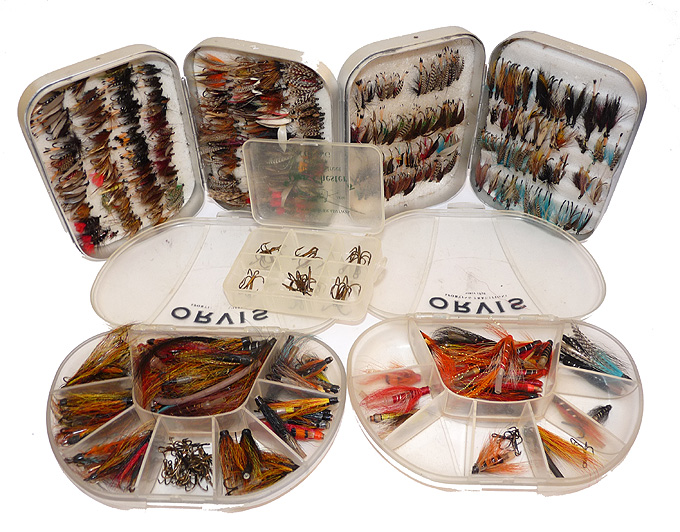 Notes: A good collection of game fishing flies. Two Orvis transparent clamshell boxes, 6″ x3.5″ with compartment interiors stuffed with tube flies and hooks. Two Wheatley England pocket alloy fly boxes filled with a good collection of trout and sea trout flies. Plus an Orvis of Chester pocket box with treble hooks. Something for every game angler, ready to fish