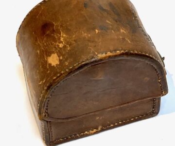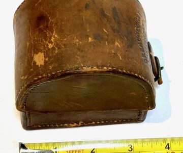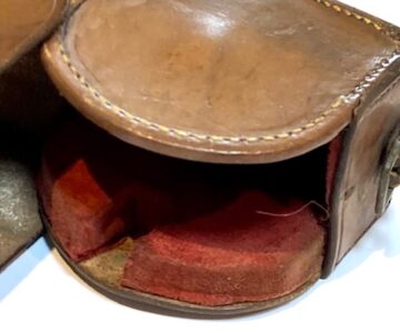 TT opinion: Very rarely seen this tiny leather case made for a small Dreadnought casting reel. Details of maker neatly stamped to case. Part of the buckle is missing but it will still engage in last hole. Red interior. Nice looking case.