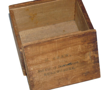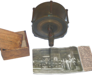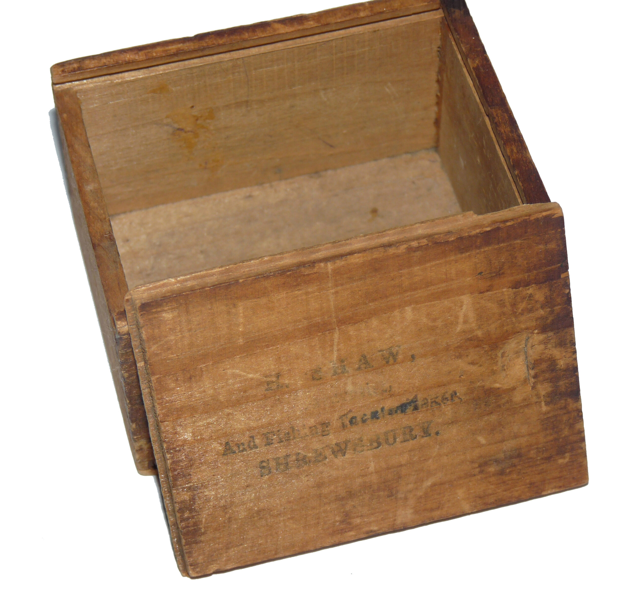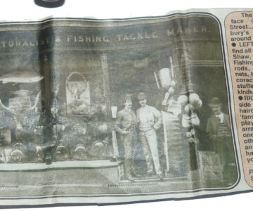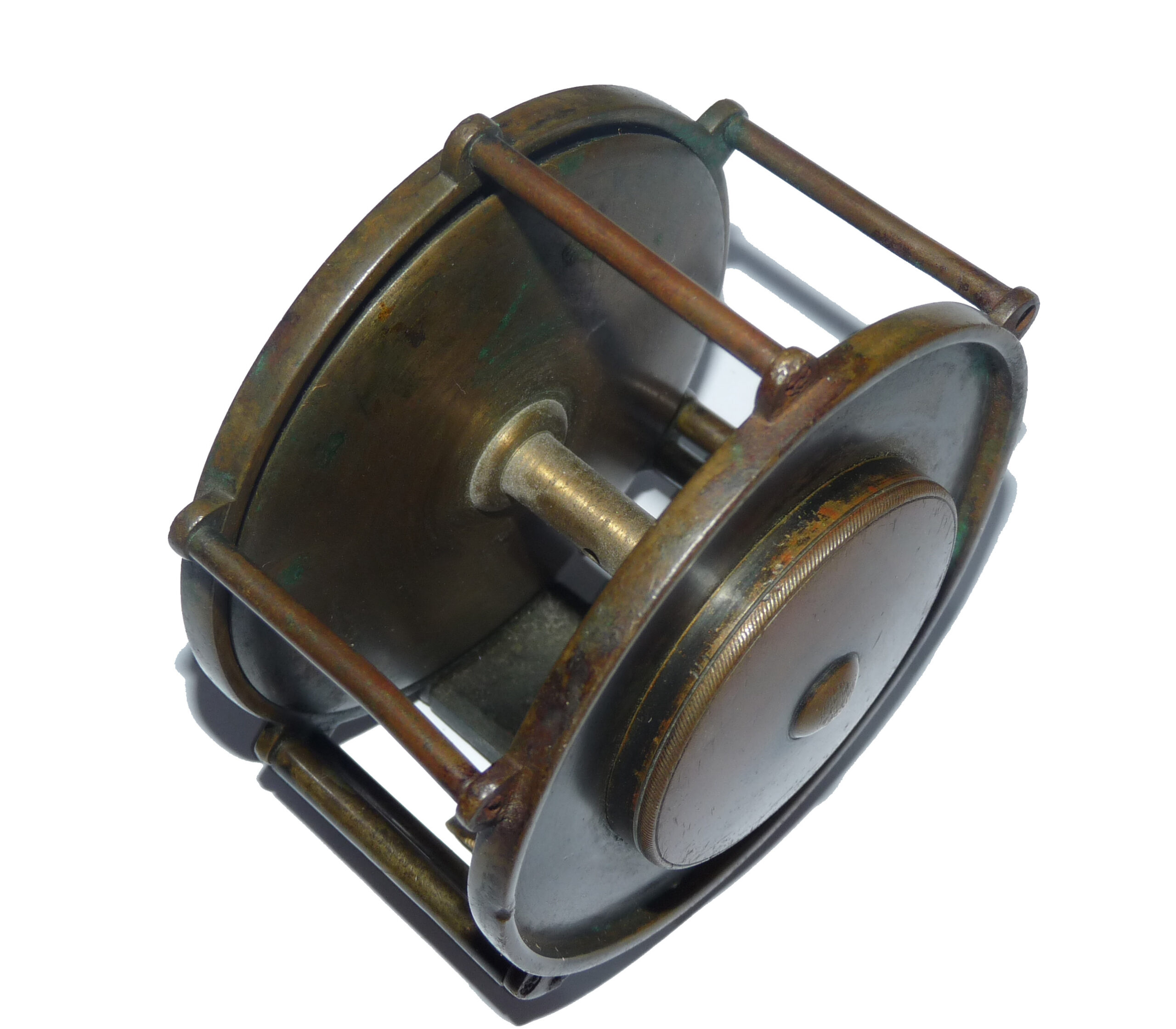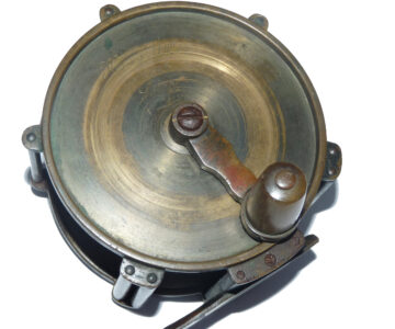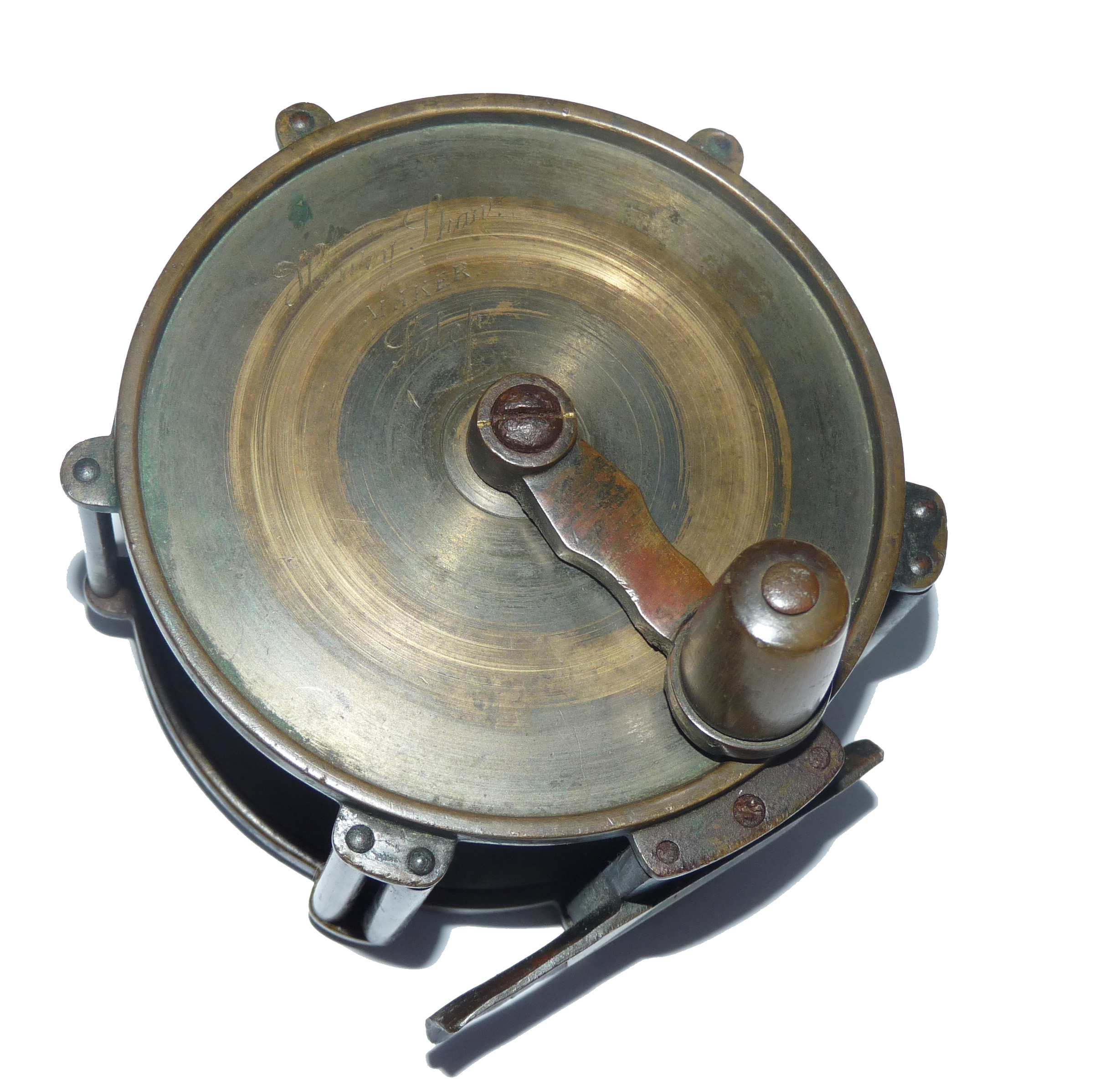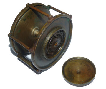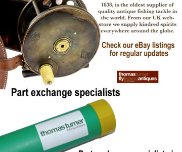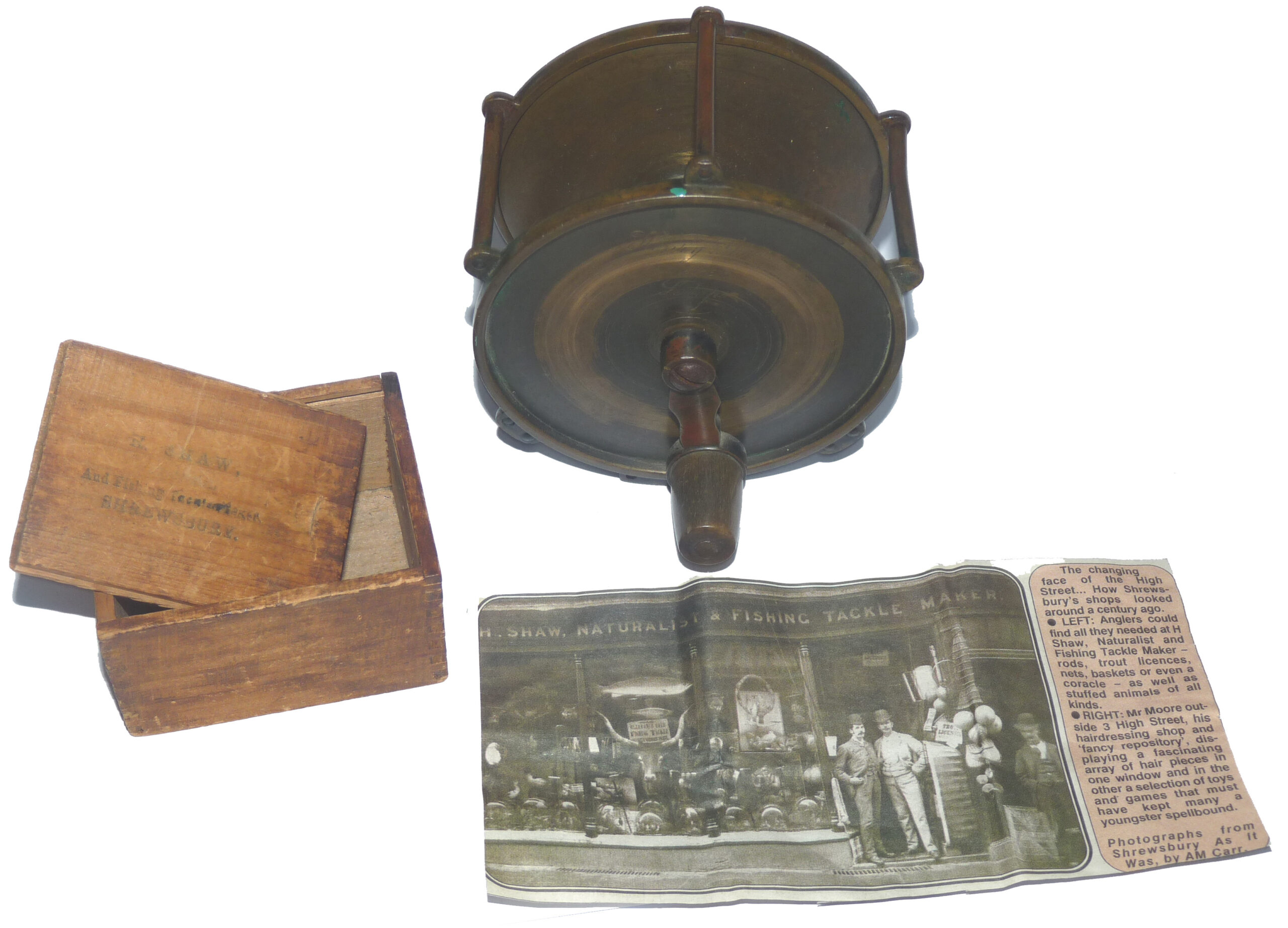 A rare Henry Shaw maker Salop (old name for Shropshire) 4” wide drum raised pillar trolling winch. Super piece of kit, 3 fixed & 2 sets of rolling pillars, crank arm, the rear check housing cover can be unscrewed to service the check. Foot shortened at 1 end to fit modern rods, comes with a little boxwood box stamped H Shaw Shrewsbury & a paper cutting showing Shaw’s fishing tackle shop in Shrewsbury c1860.