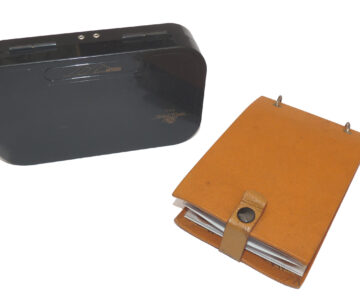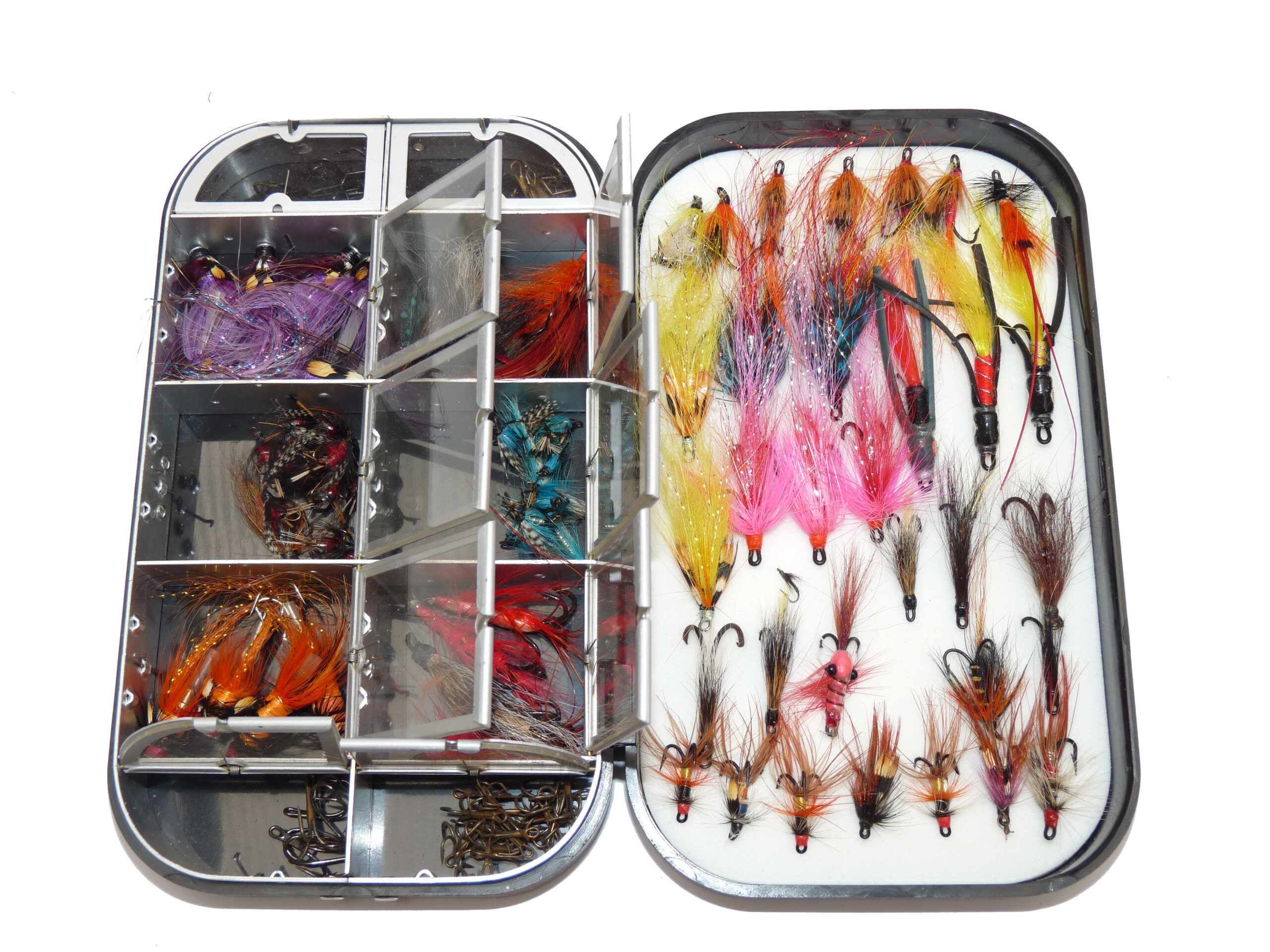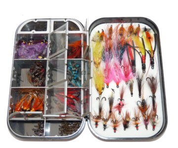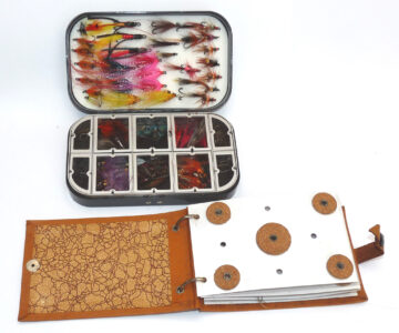 A Richard Wheatley Alvern lightweight black edition fly box, 10 internal spring windows & foam liner holding a good collection of assorted salmon flies from 0.5” to 1 ½” long including tube flies with Jungle Cock feathers. And an Ajax cast carrier with cork disc winders, both ready to use.