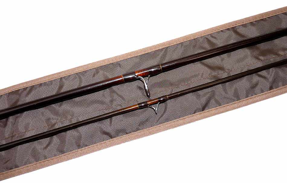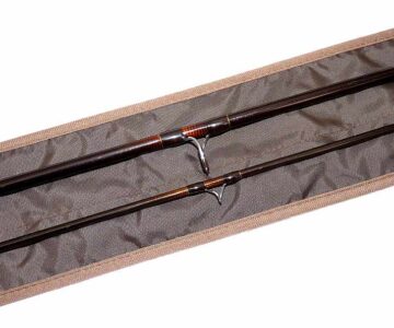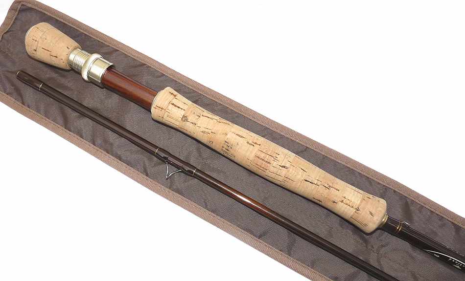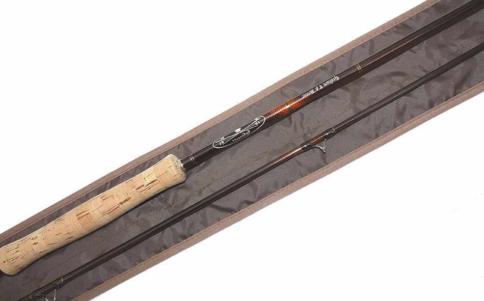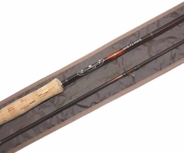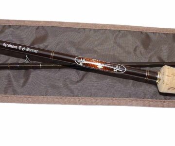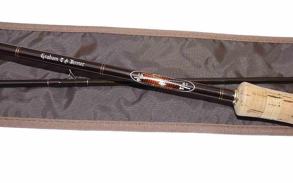 Sage Graphite 10′ 2 pce fly rod #7 custom by Aquarius Scotland for G A Jenner , 12th July 2001. Superb rod .It appears to have seen very little use. Lined butt and stripper guides with snake intermediates, cork handle, polished wood spacer and screw reel seat with cork extension. Fast crisp action,super light rod comes in a fitted unnamed bag.