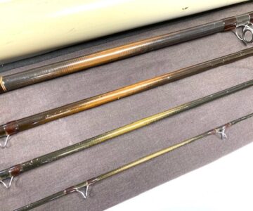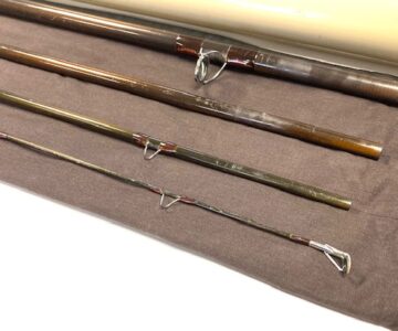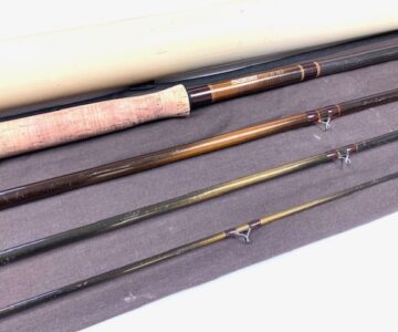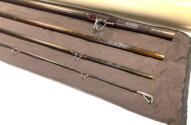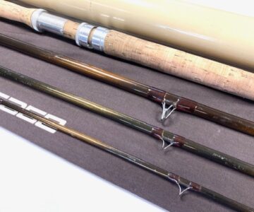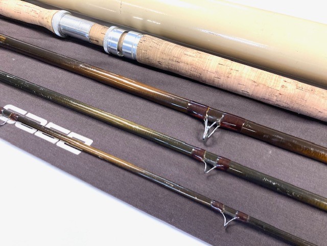 A very good preowned Sage Graphite III 15’ salmon fly rod for line #10, classic bronze blank with brown whipped guides, 24” cork handle with screw alloy reel fitting. Rod weight 8 7/8oz, comes with maker’s original bag & Sage alloy tube.