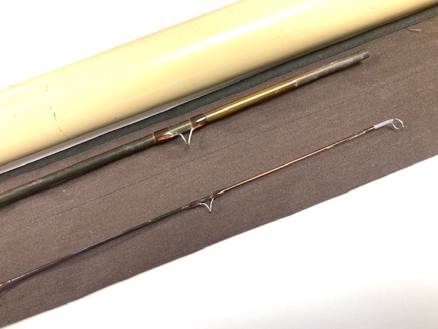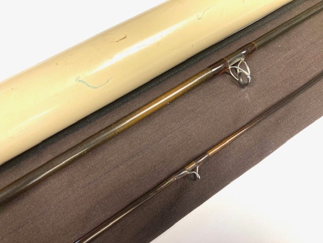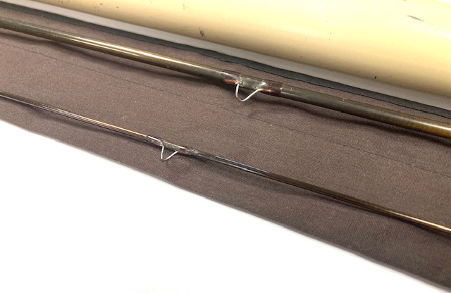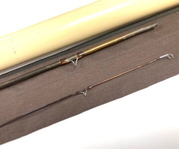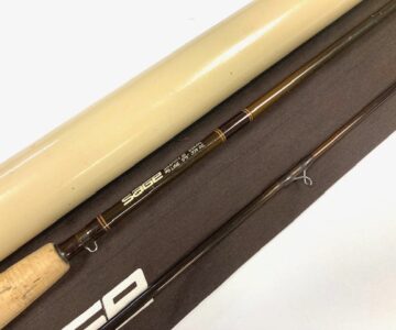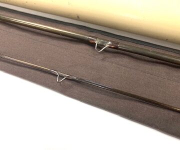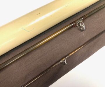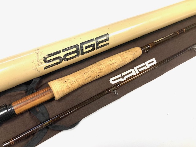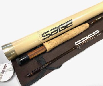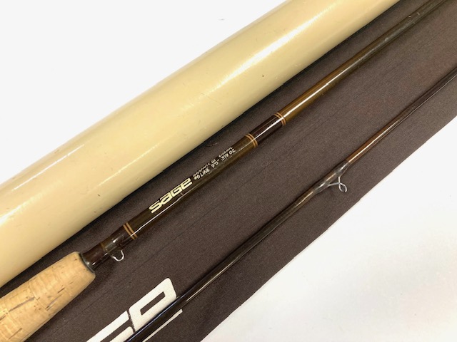 A Sage GFL Graphite III- 9′6″ 2-piece trout fly rod in fine condition, line #6, brown blank with large diameter snake guides. Cork handle, wood spacer & black screw winch fitting. A classic high-quality USA built trout fly rod in makers bag with Sage screw-top alloy tube.