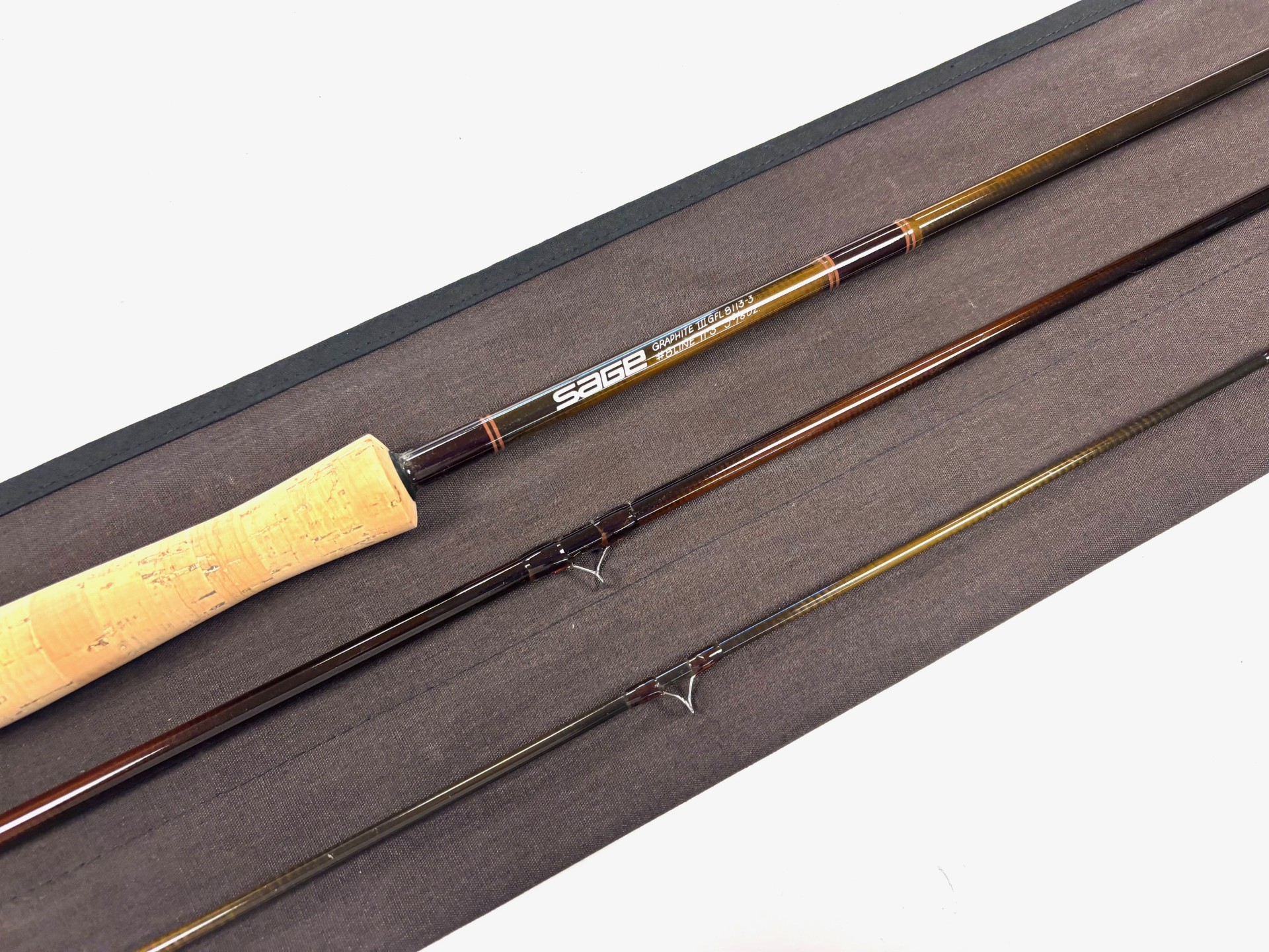 A Sage GFL Graphite III- 11′ 3″ 3 piece trout fly rod in pretty much unused condition,, brown blank with large diameter snake guides. Cork handle, wood spacer & black screw winch fitting. A classic high-quality USA built trout fly rod with original rod bag.