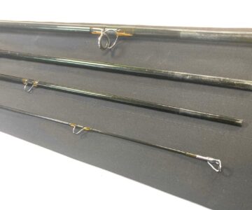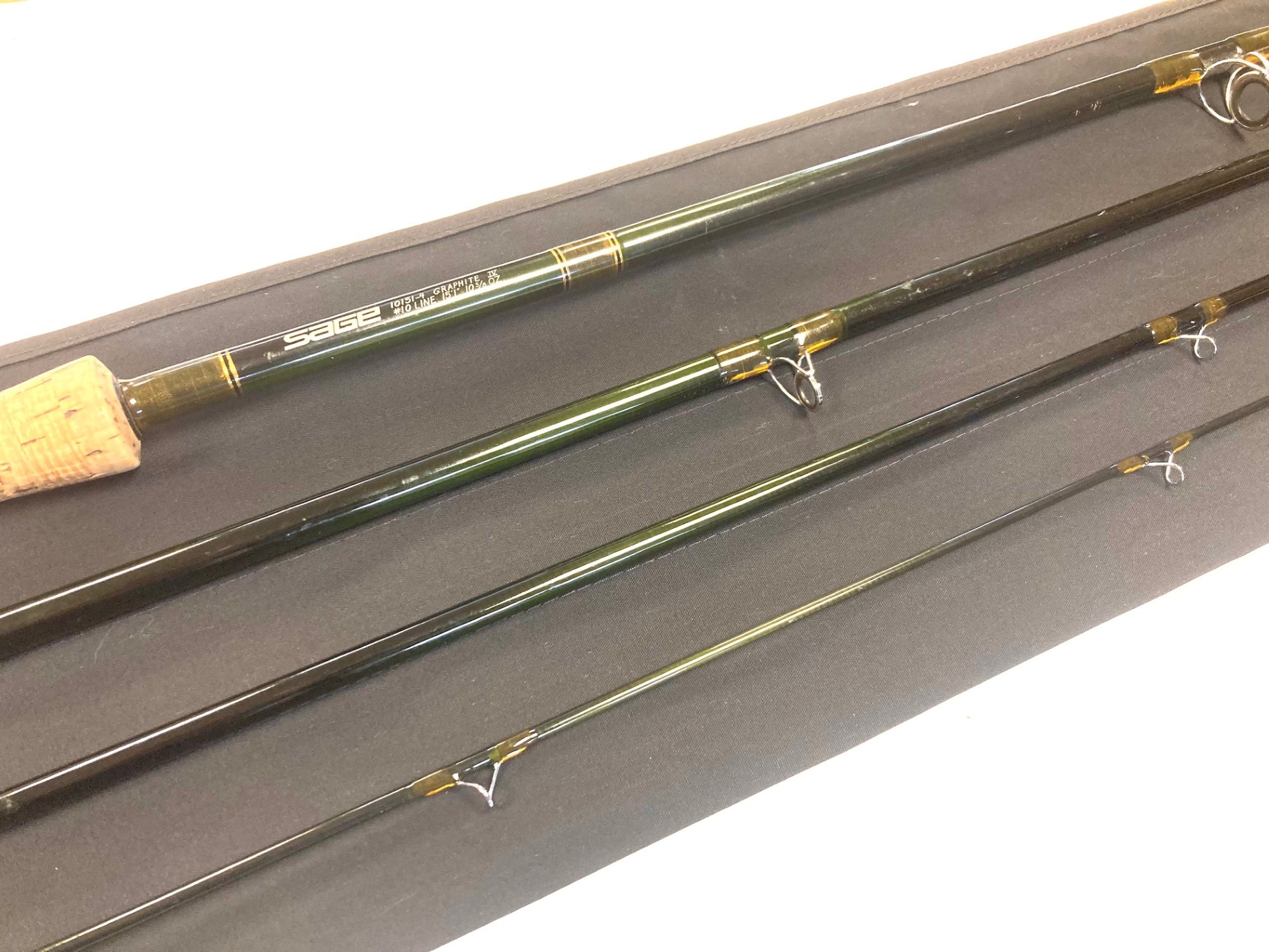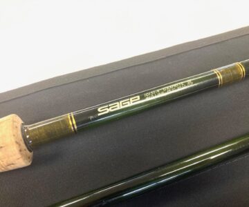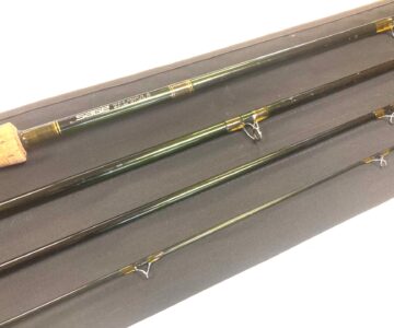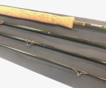 TT opinion: A four-piece Sage Salmon fly rod line rate #10 Sage Graphite IV, 15ft 1”, green finish blank, large-diameter intermediates. 22” shaped cork handle with twin-screw black reel fitting. The rod does have marks on the blank consistent with use. Complete in green Sage rod bag.