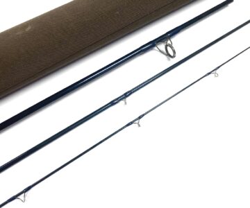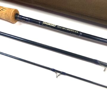 TT opinion: A very good Sage RPLXi Graphite III B – 9′ 3 piece Graphite III fly rod for line #9. Dark blue blank, lined butt and stripper guides with snake intermediates, weight 4-3/16oz. 7″ cork handle with 1″ fighting butt, twin screw black alloy reel fitting. Light weight powerful tip action rod, many uses, single hand salmon, sea trout, big rainbows on reservoirs or bass and pike fly fishing. Comes in makers cloth bag with screw top alloy tube. Beautiful rod ready to fish.