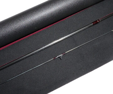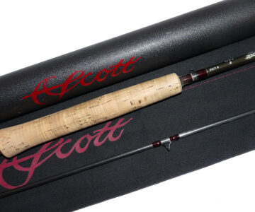 TT opinion: A fine Scott, USA STS 8′ 2 piece carbon fly rod for line #4. Slim antiflash blank, lined butt ring, and snake intermediates. Shaped cork handle, wood spacer, and black finish screw reel fitting. A superb quality lightweight rod, ideal for trout and grayling in streams rivers and smaller lakes. Comes with maker cloth bag and screw top alloy tube