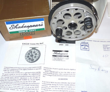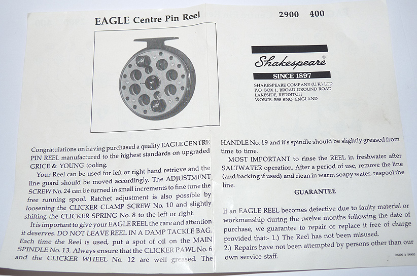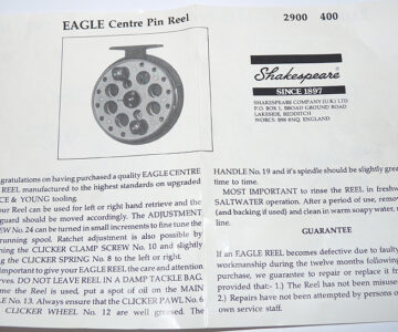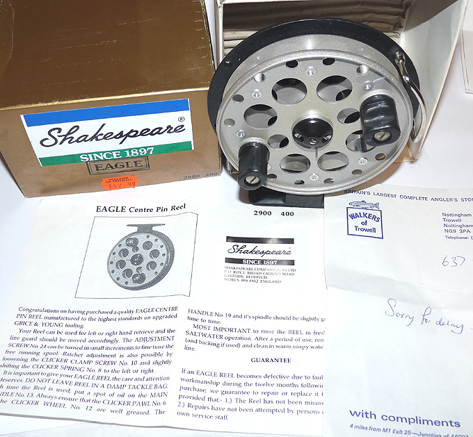 Shakespeare Eagle 2900-400 trotting reel in as new condition, 4.25” alloy drum with fibre backplate. Line guide can be used left- or right-hand wind, backplate optional check button. Reel spins perfectly straight, looks unused. It comes with instructions & a note from Walkers of Trowell saying “Sorry for delay”. Fabulous 19190’s reel, it retailed at £43 way back then, comes in maker’s original box.